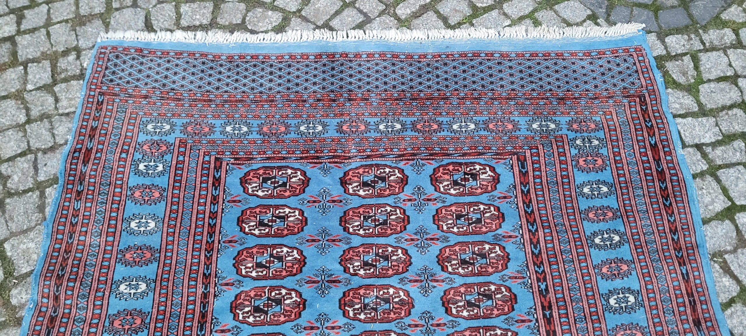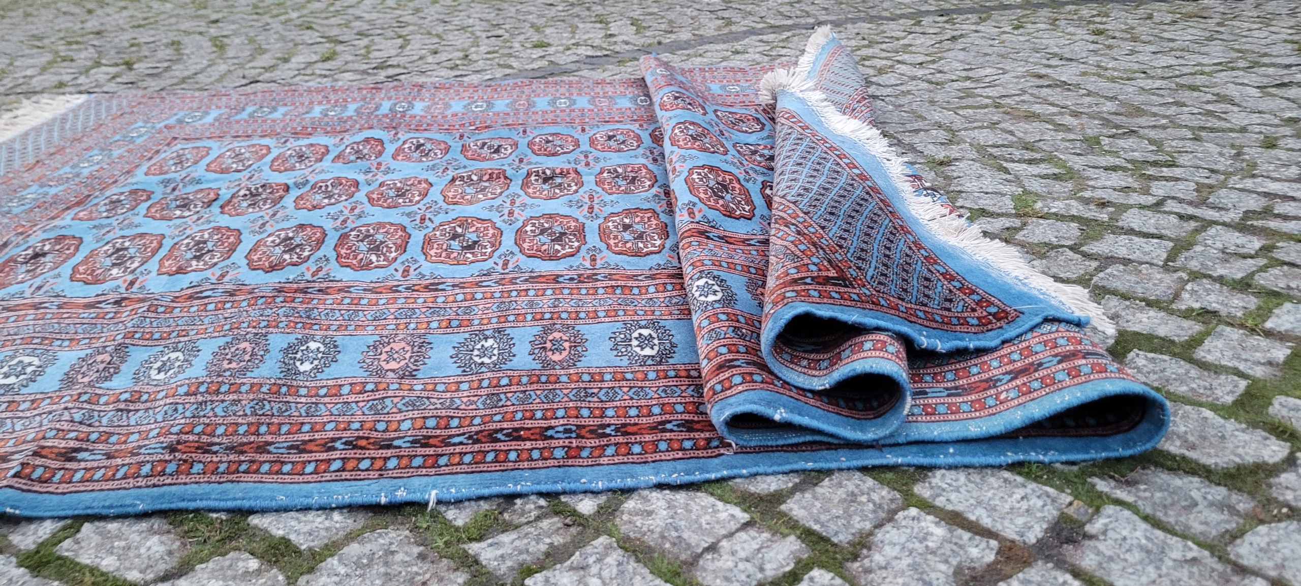 Східний бухарський килим. Виткана вручну з полірованої вовни найвищої якості. Характеризується компактним, приємним на дотик, блискучим флісом і красивими кольорами та візерунками. Він у дуже хорошому стані, мінус видно на фотографіях.