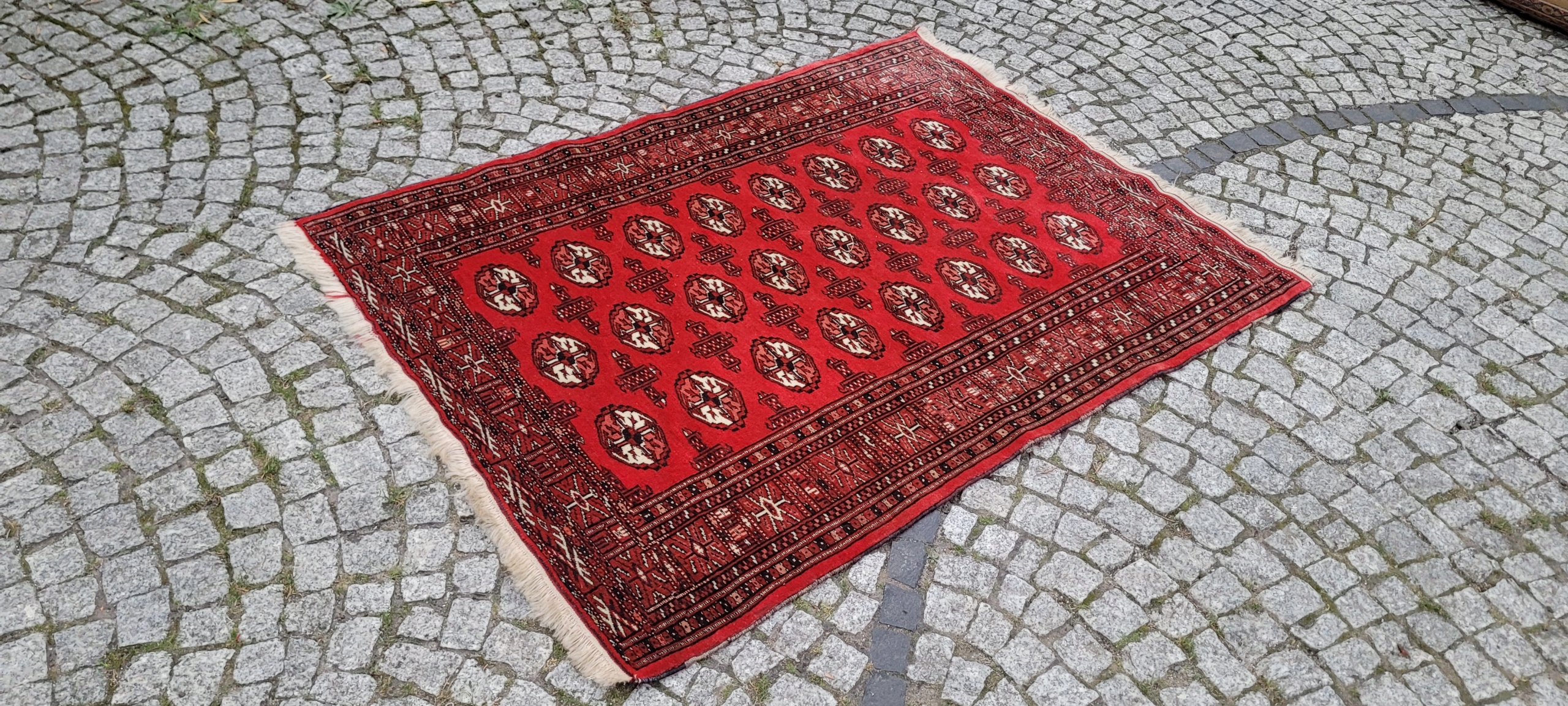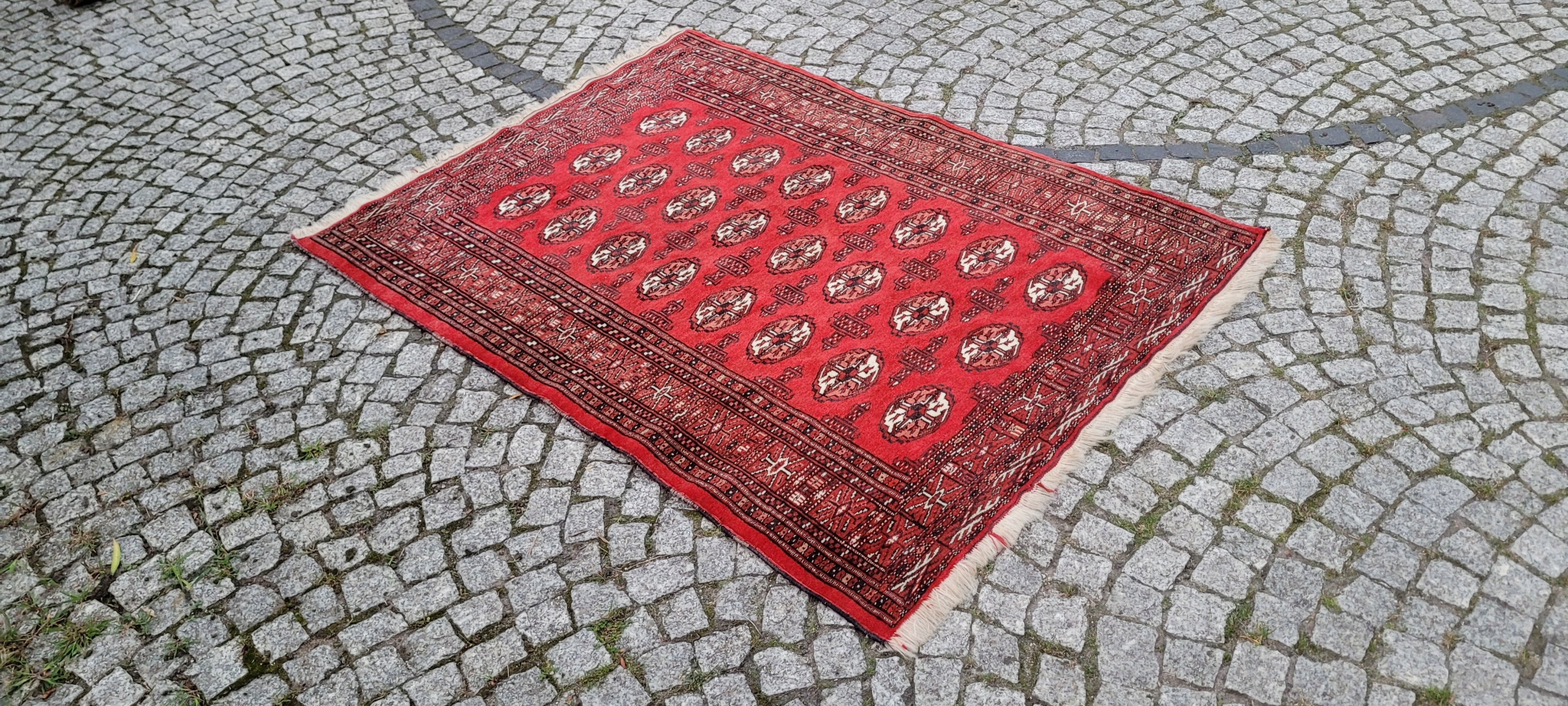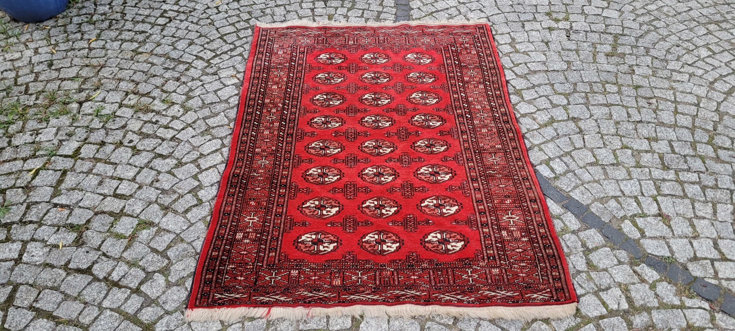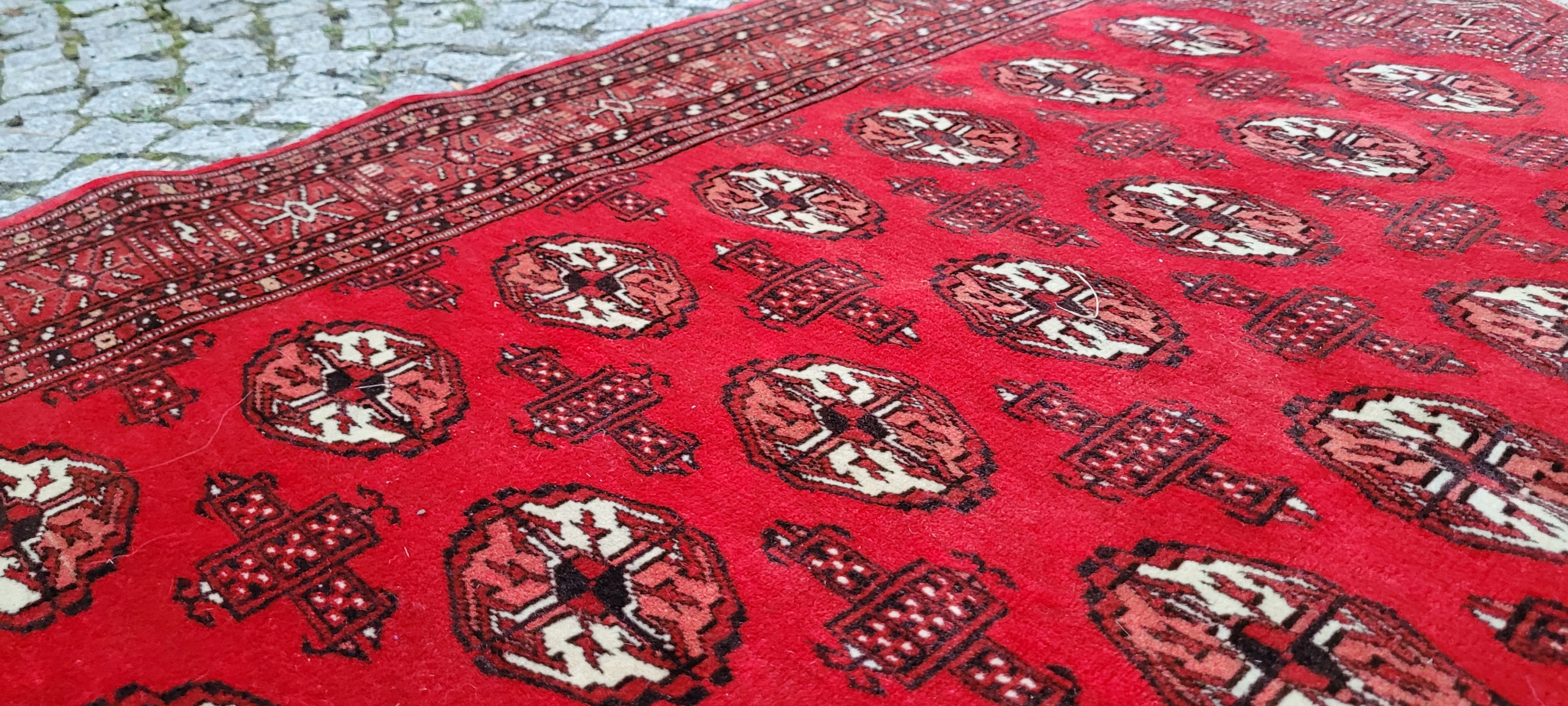 килим Бучара. Сплетений вручну від найвищої якості відшліфованої вовни. Він характеризується компактним, приємним на дотик, блискучим флісом та красивими кольорами та дизайном. Він зберігається в дуже хорошому стані, видно на знімках.