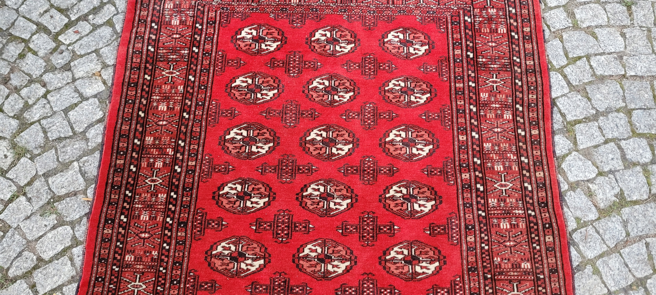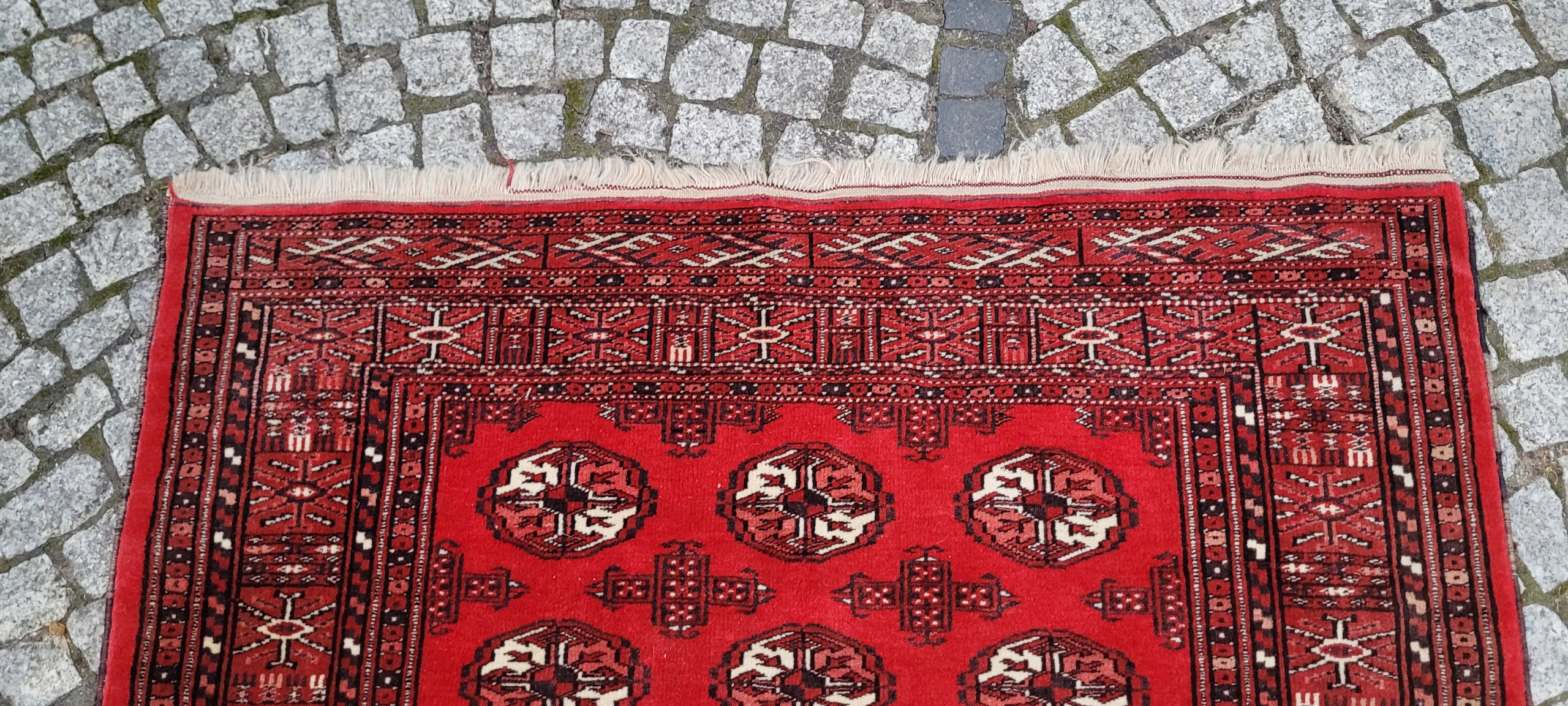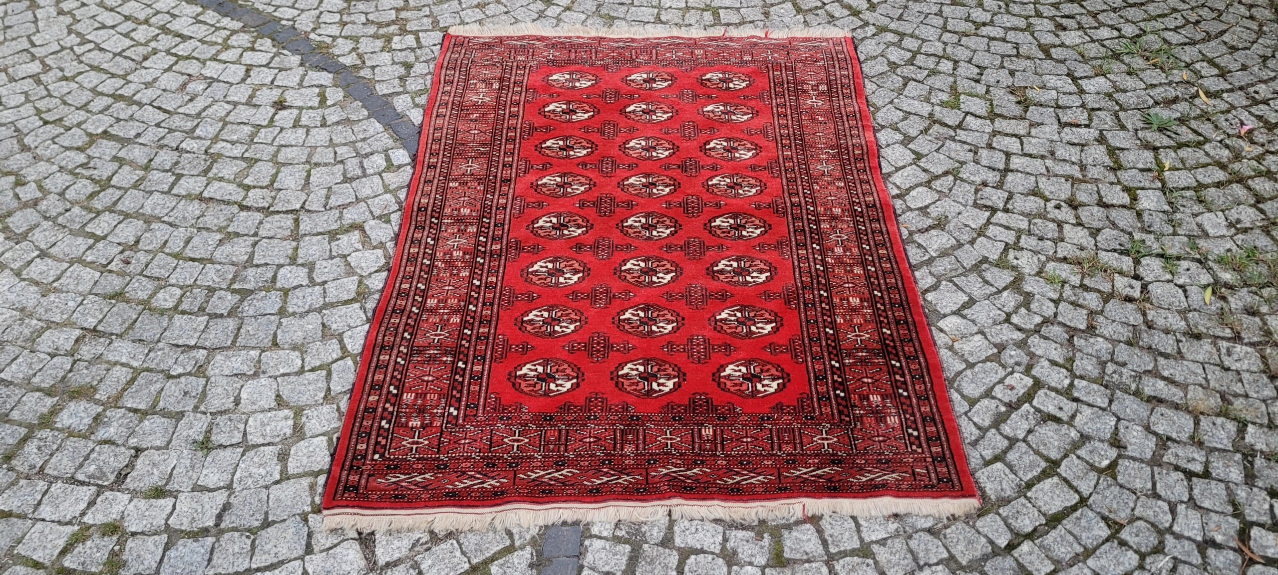 килим Бучара. Сплетений вручну від найвищої якості відшліфованої вовни. Він характеризується компактним, приємним на дотик, блискучим флісом та красивими кольорами та дизайном. Він зберігається в дуже хорошому стані, видно на знімках.