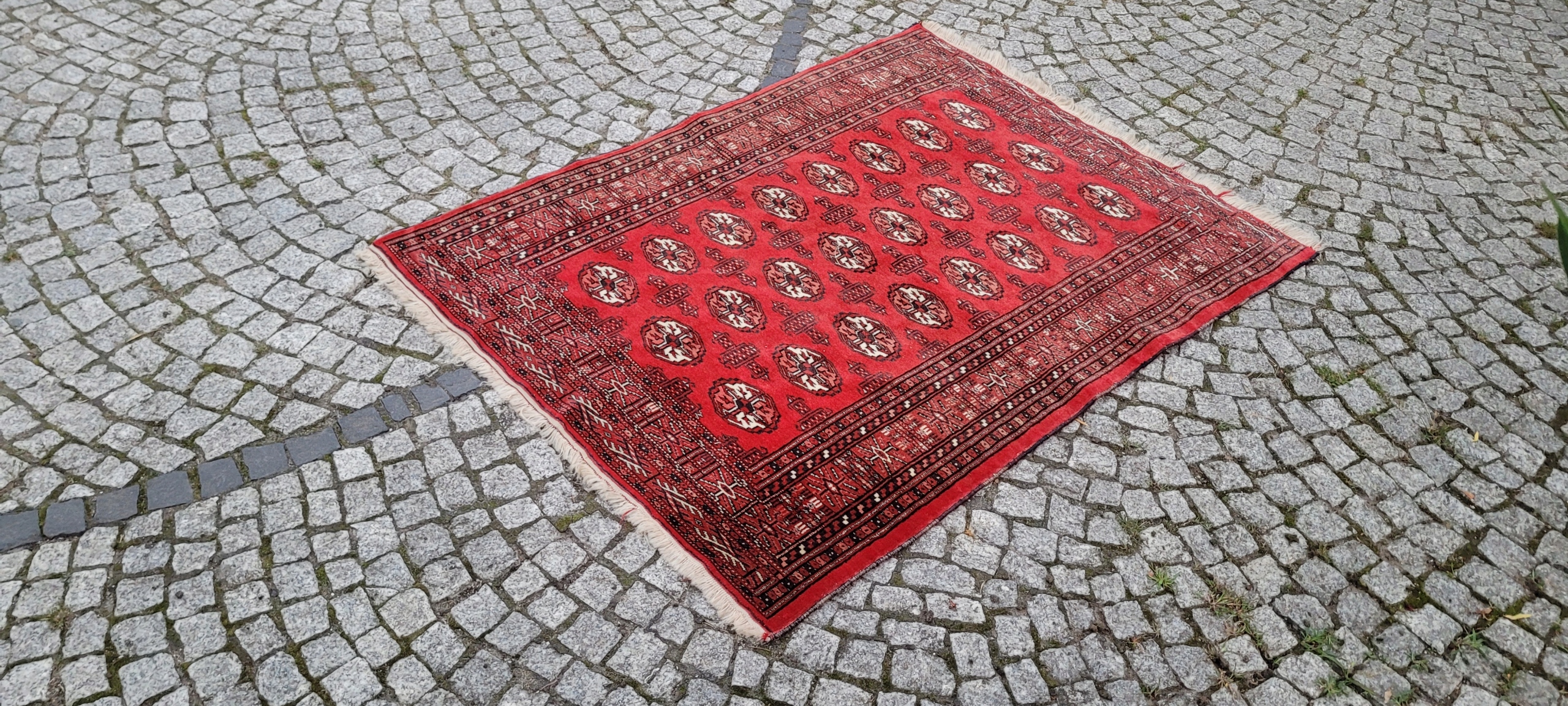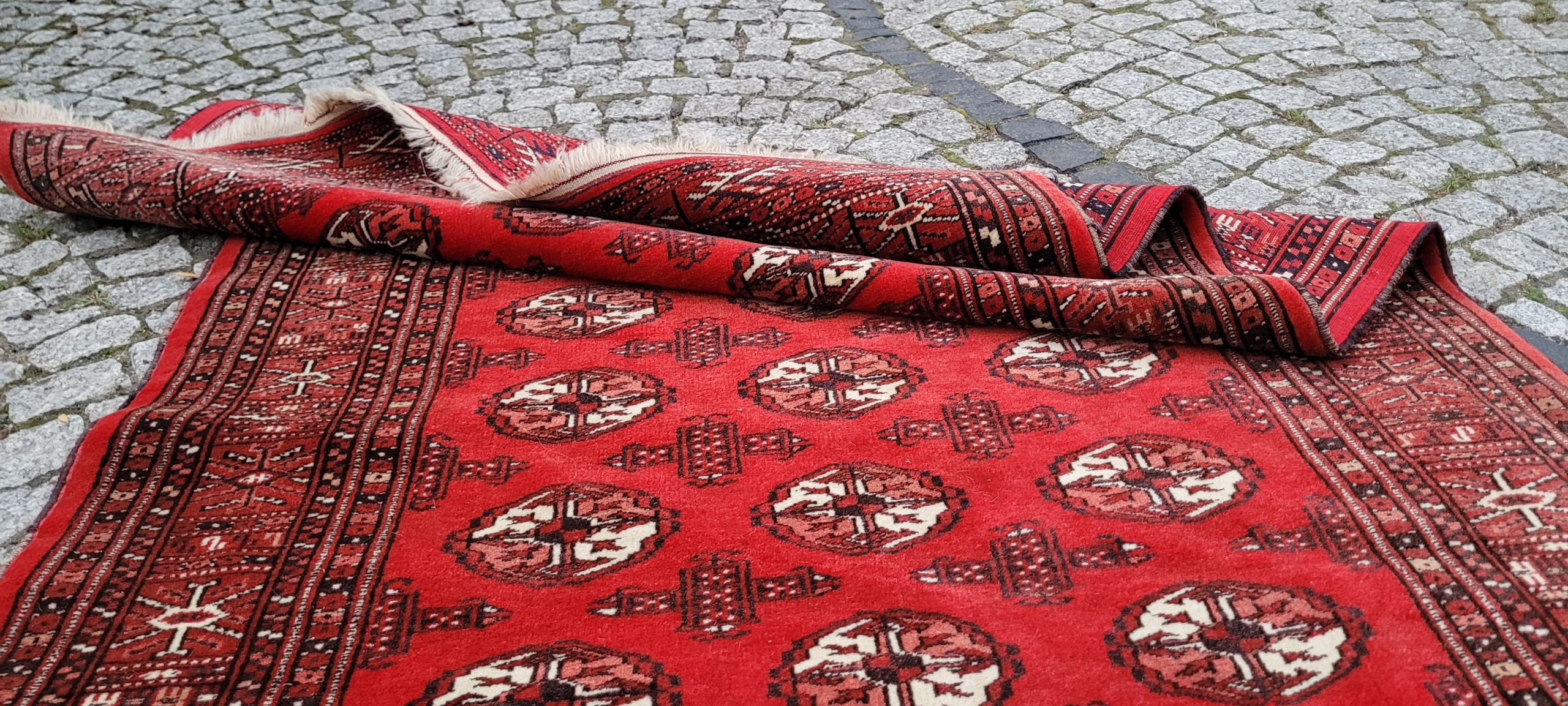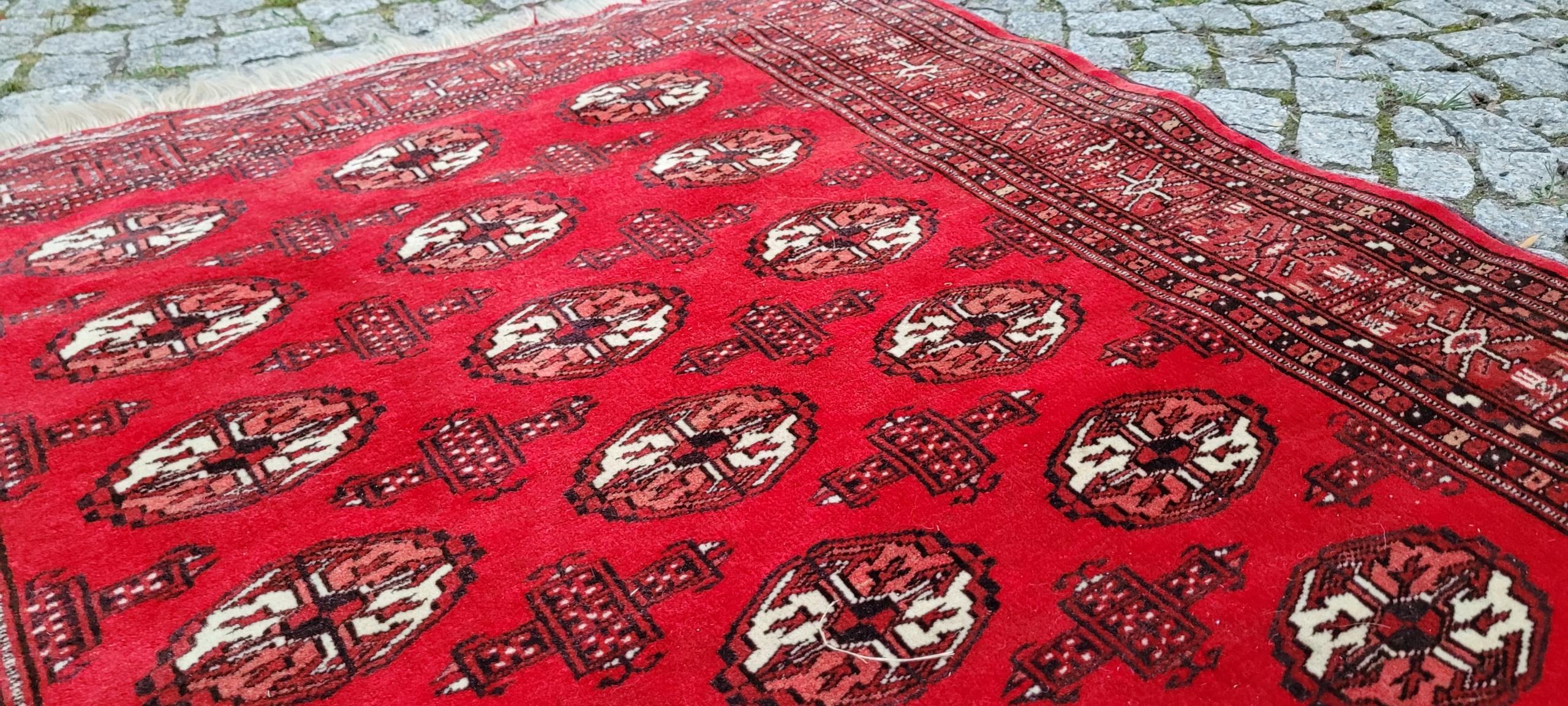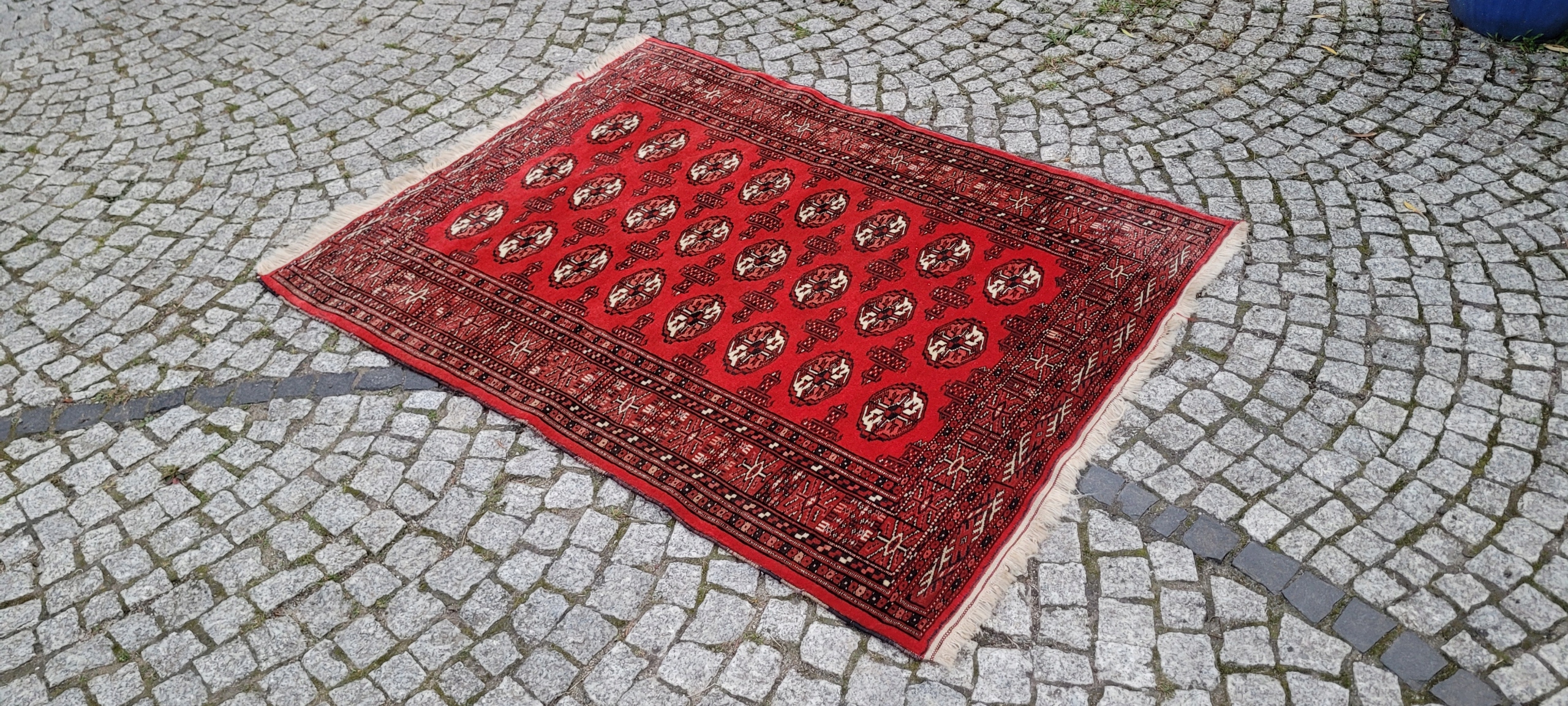 килим Бучара. Сплетений вручну від найвищої якості відшліфованої вовни. Він характеризується компактним, приємним на дотик, блискучим флісом та красивими кольорами та дизайном. Він зберігається в дуже хорошому стані, видно на знімках.