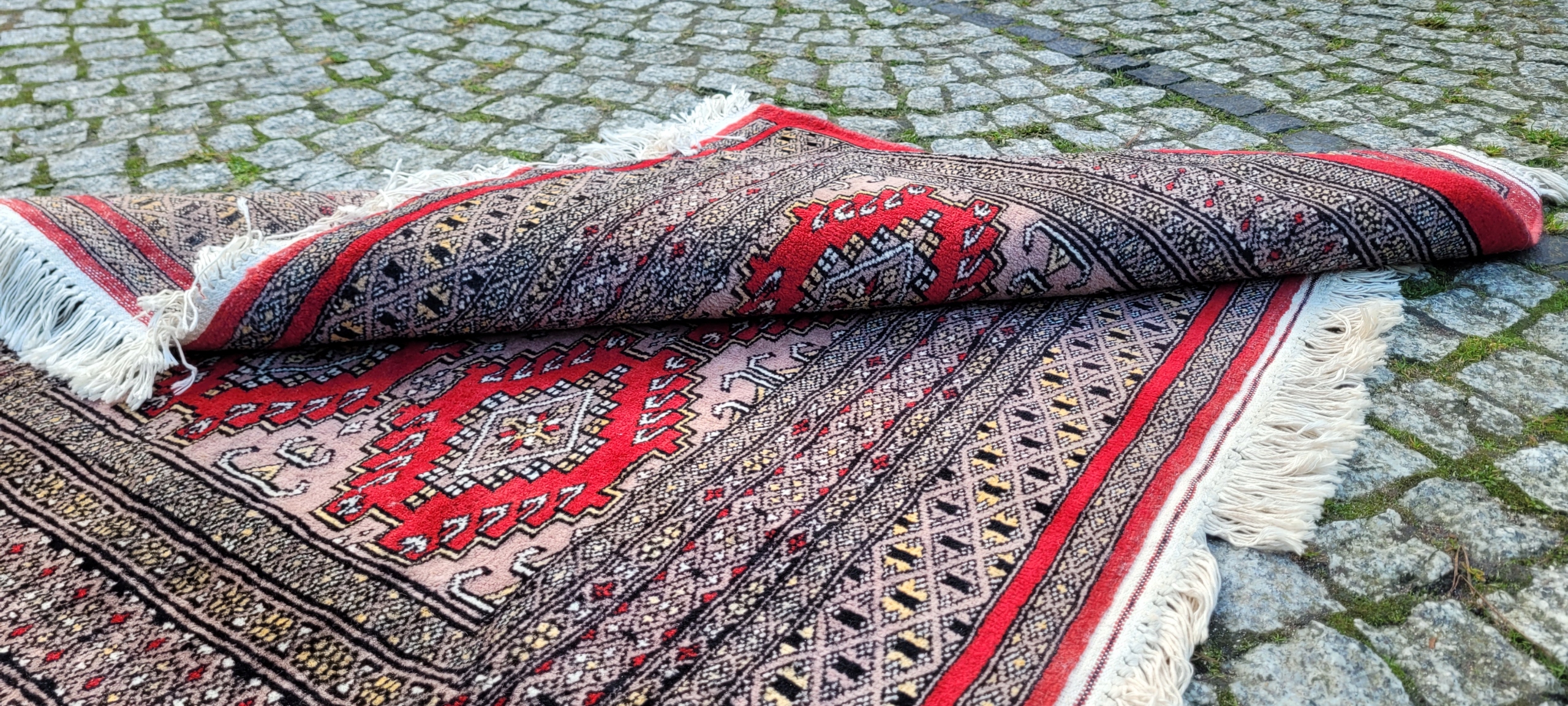 Східний, підписаний бухарський килим. Виткана вручну з полірованої вовни найвищої якості. Характеризується компактним, приємним на дотик, блискучим флісом і красивими кольорами та візерунками. Він у дуже хорошому стані, видно на фотографіях.