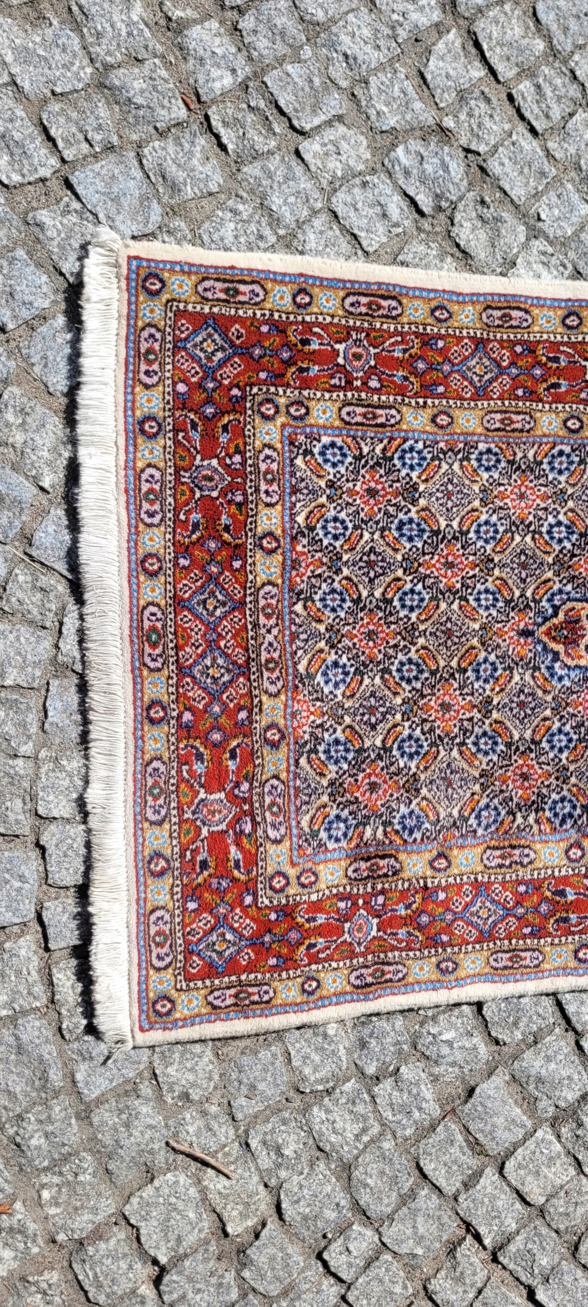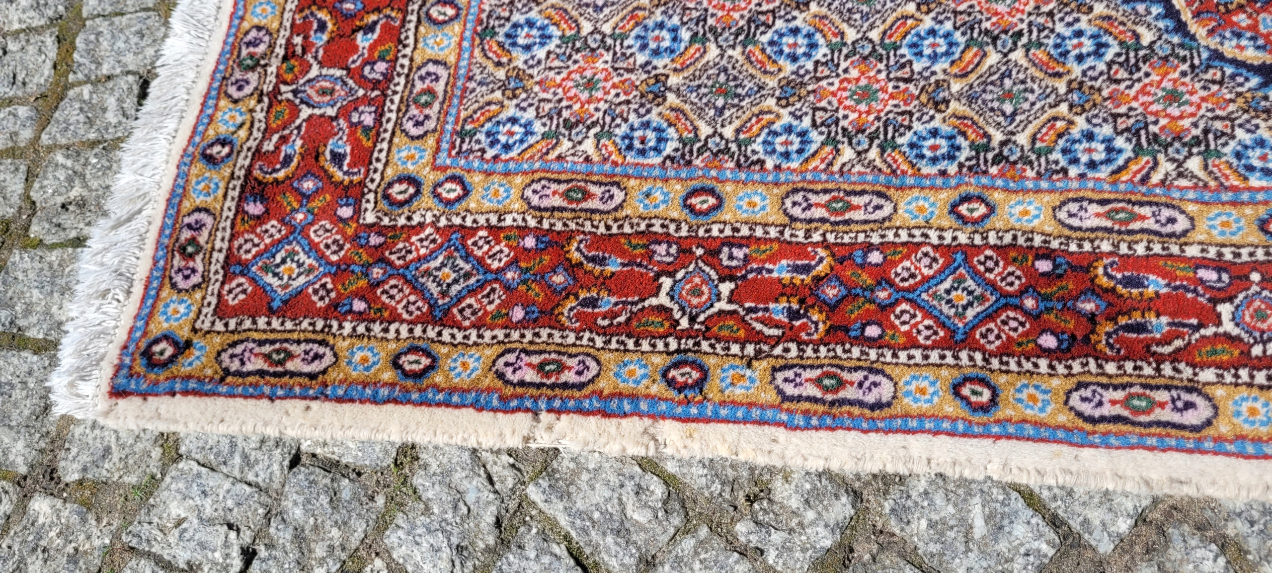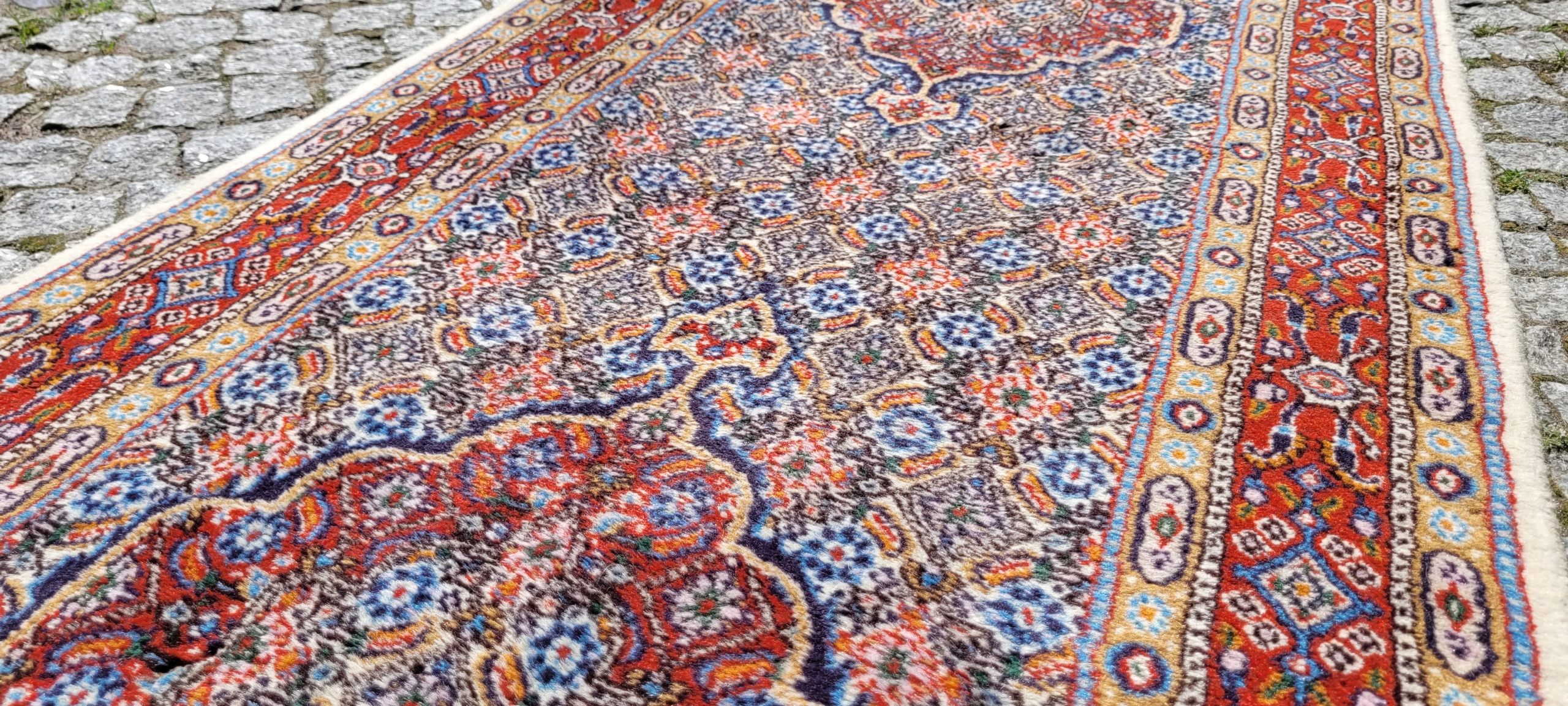 Перський килим Moud. Ручне плетіння з вовни. Характеризується компактним, приємним на дотик, блискучим флісом і красивими кольорами та візерунками. Він у дуже хорошому стані, без деяких дефектів флісу в кутку.