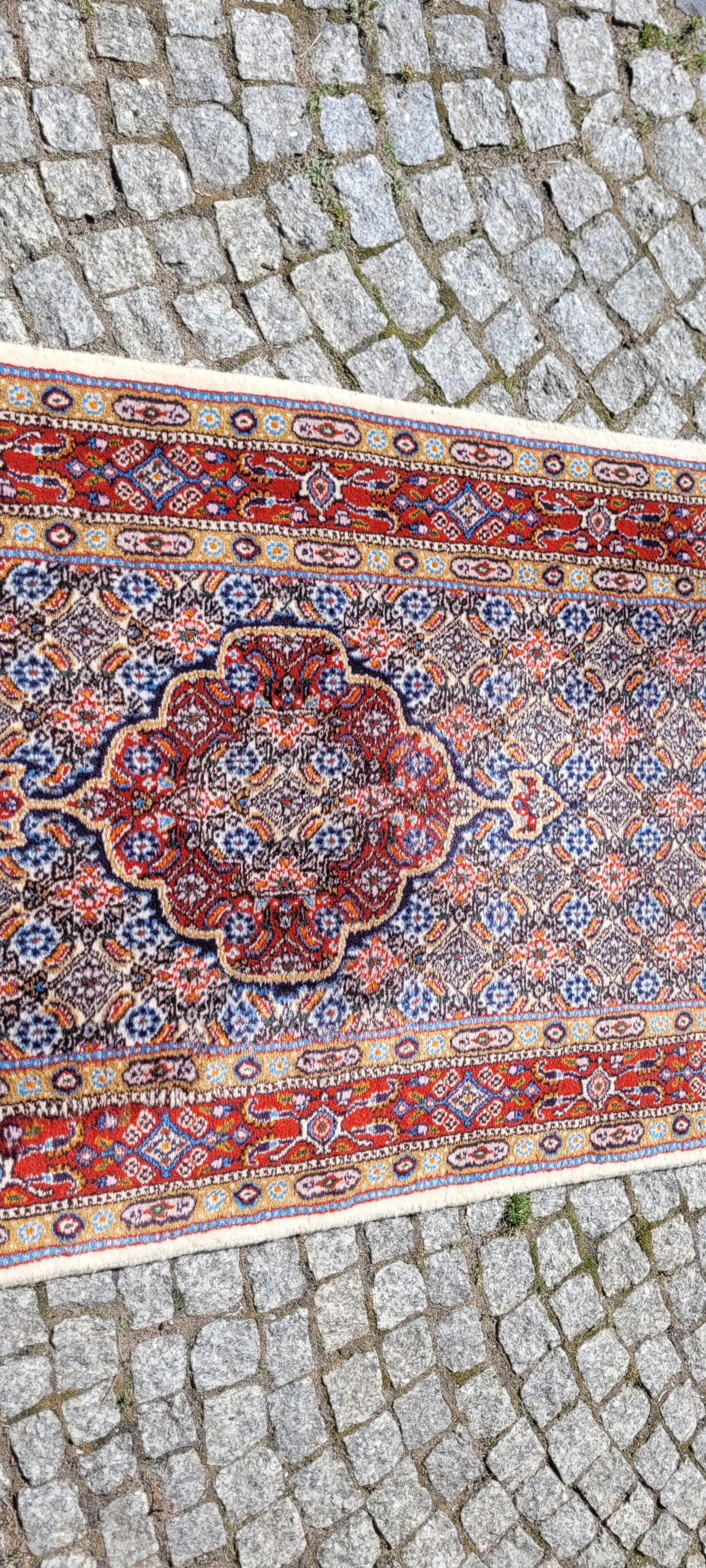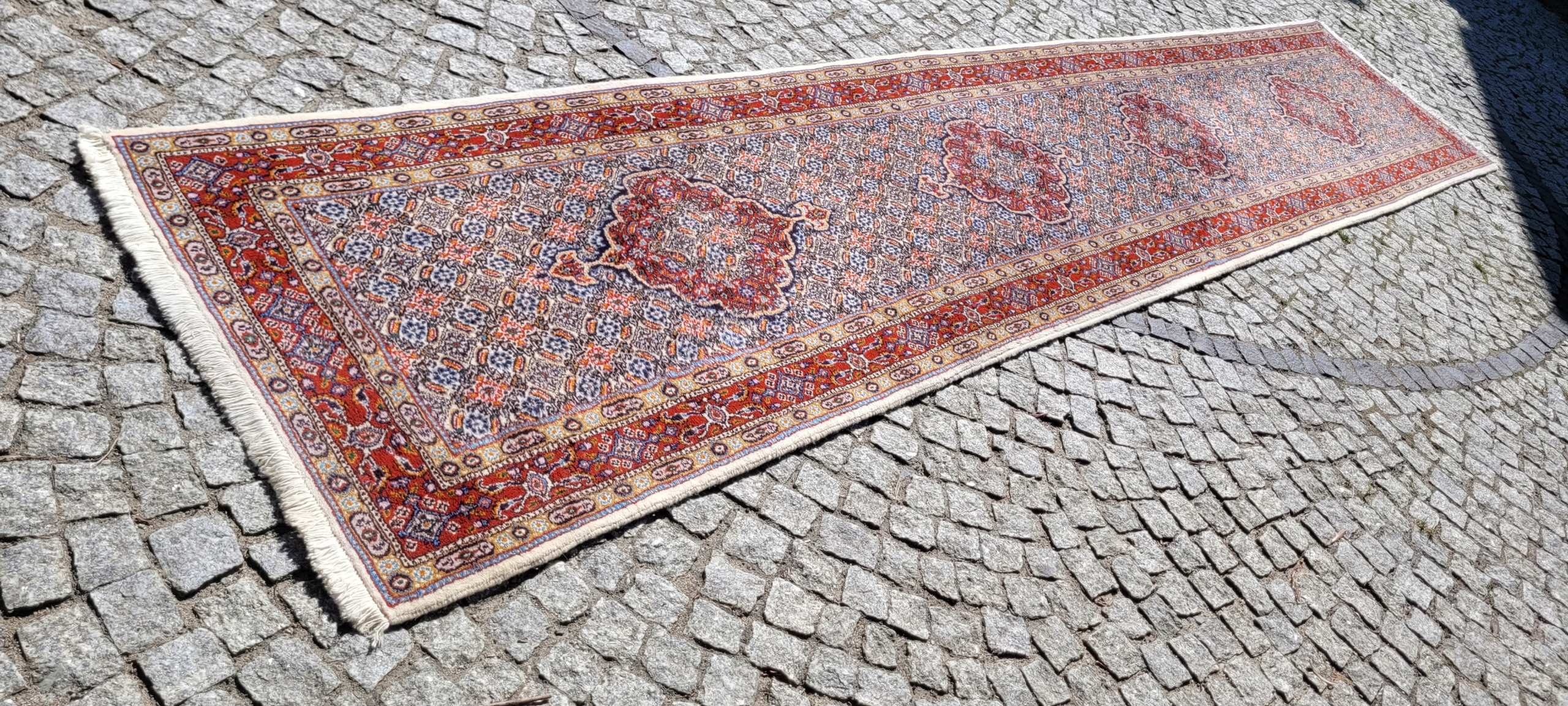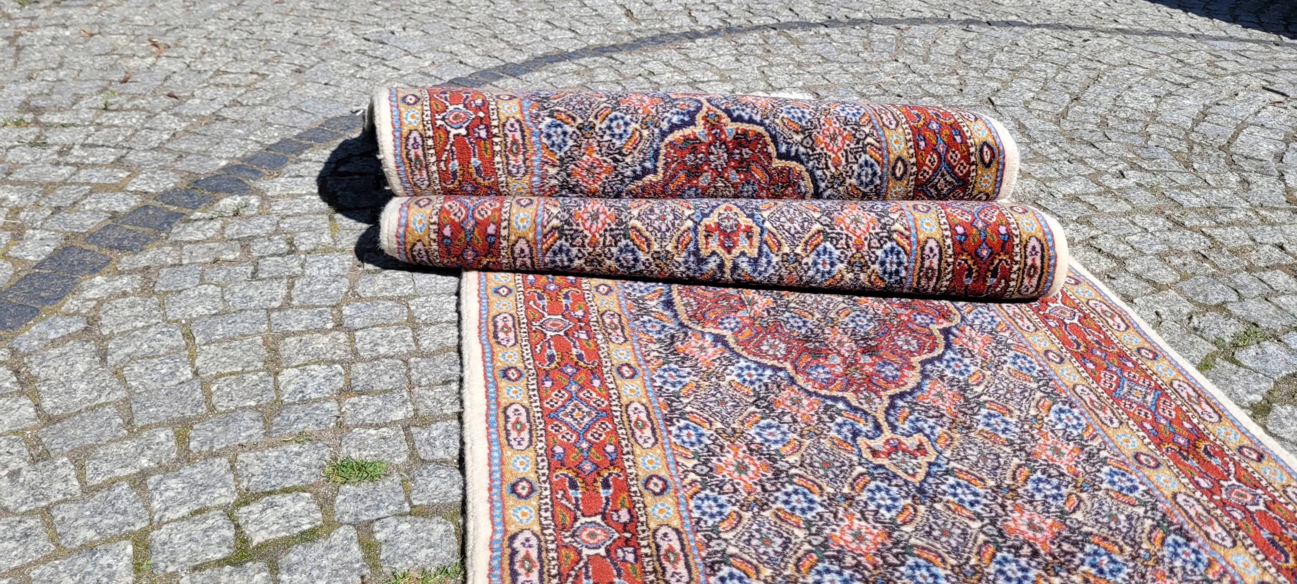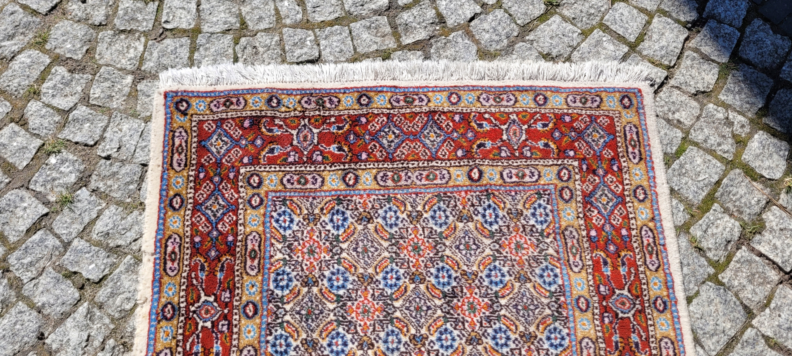 Перський килим Moud. Ручне плетіння з вовни. Характеризується компактним, приємним на дотик, блискучим флісом і красивими кольорами та візерунками. Він у дуже хорошому стані, без деяких дефектів флісу в кутку.