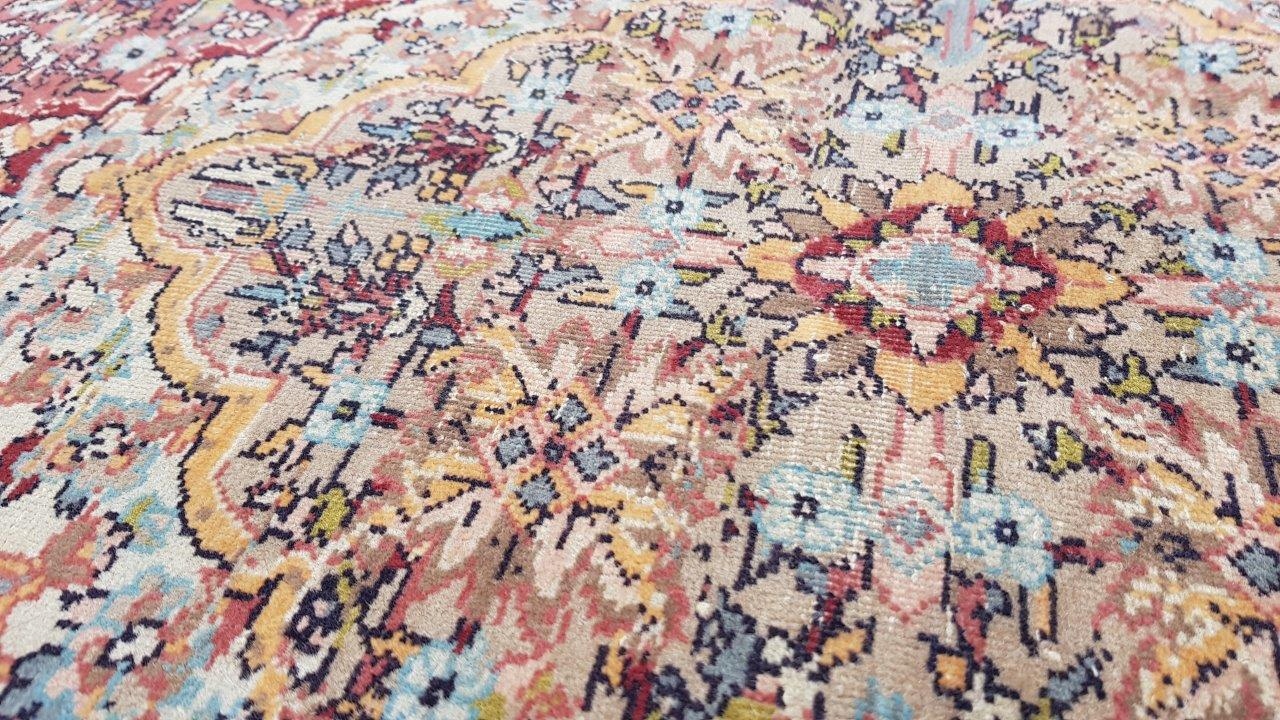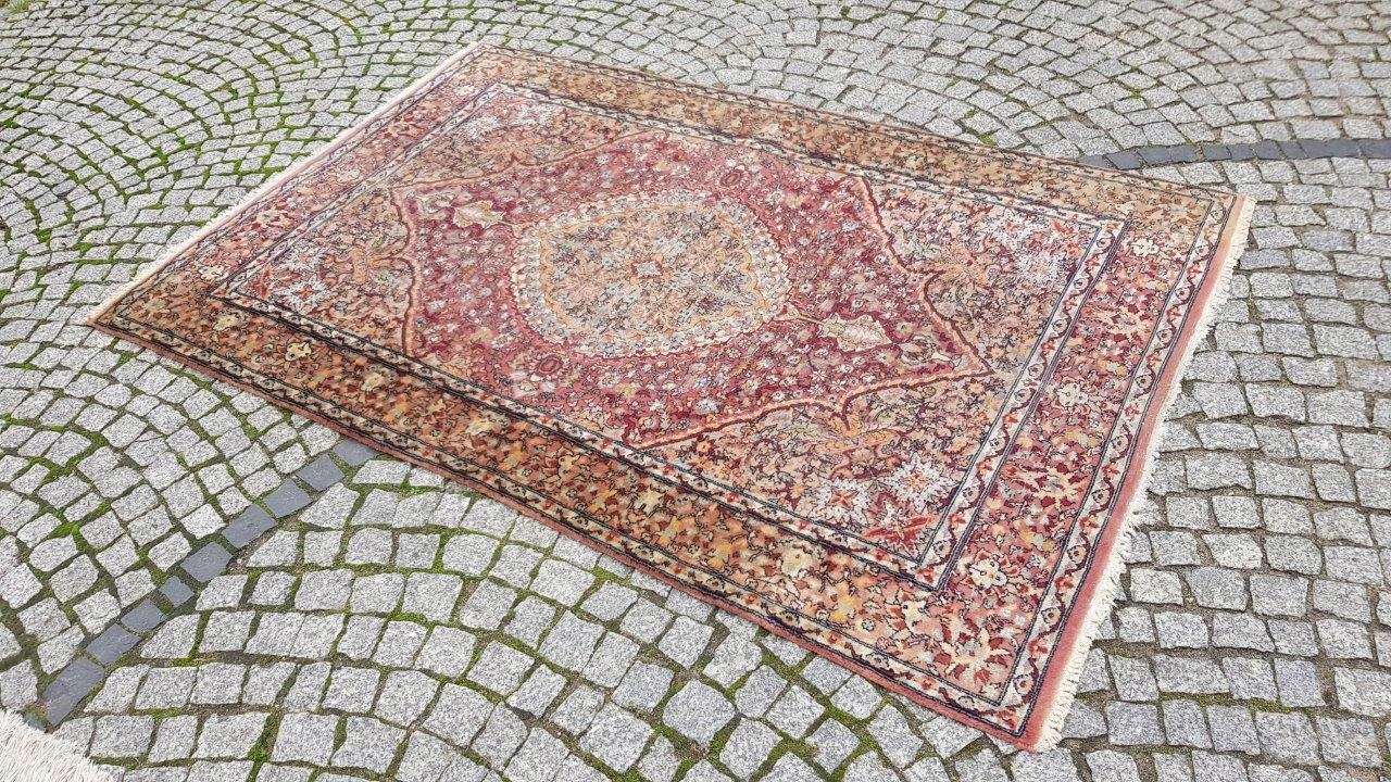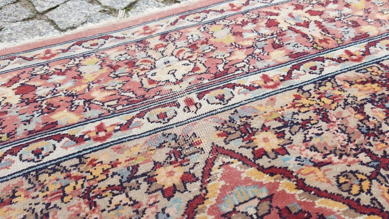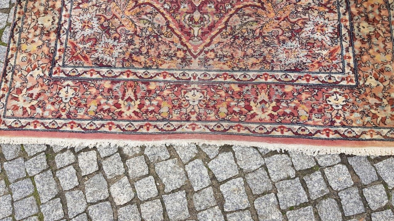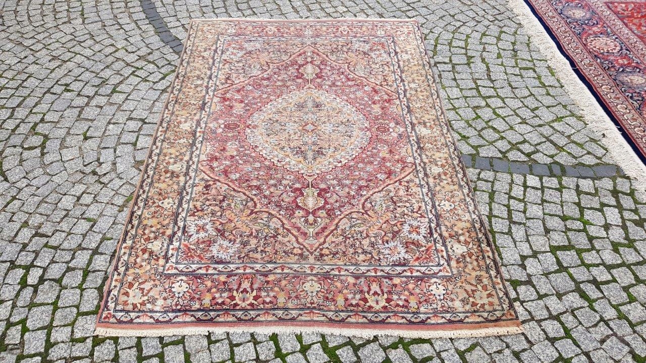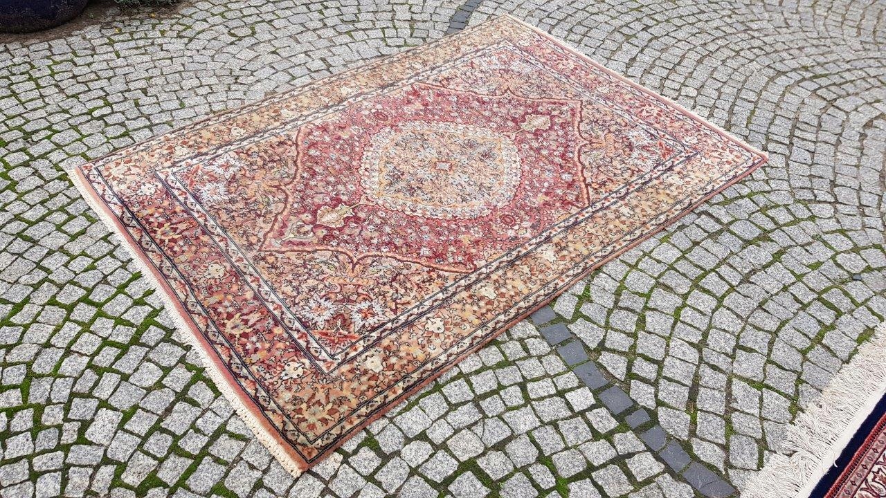 Прекрасний індійський килим Ісфахан. Виткана вручну з вовни найвищої якості. Характеризується компактним, приємним на дотик, блискучим флісом і красивими кольорами та візерунками. Зберігся в хорошому стані. Має потертості.