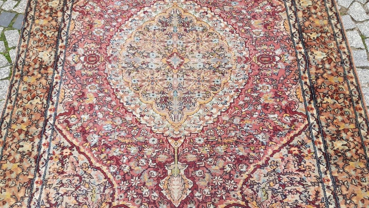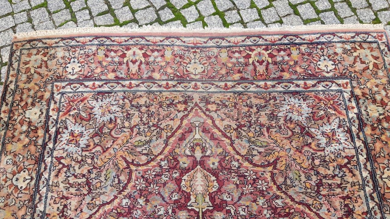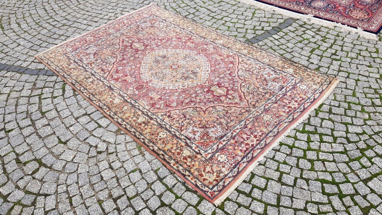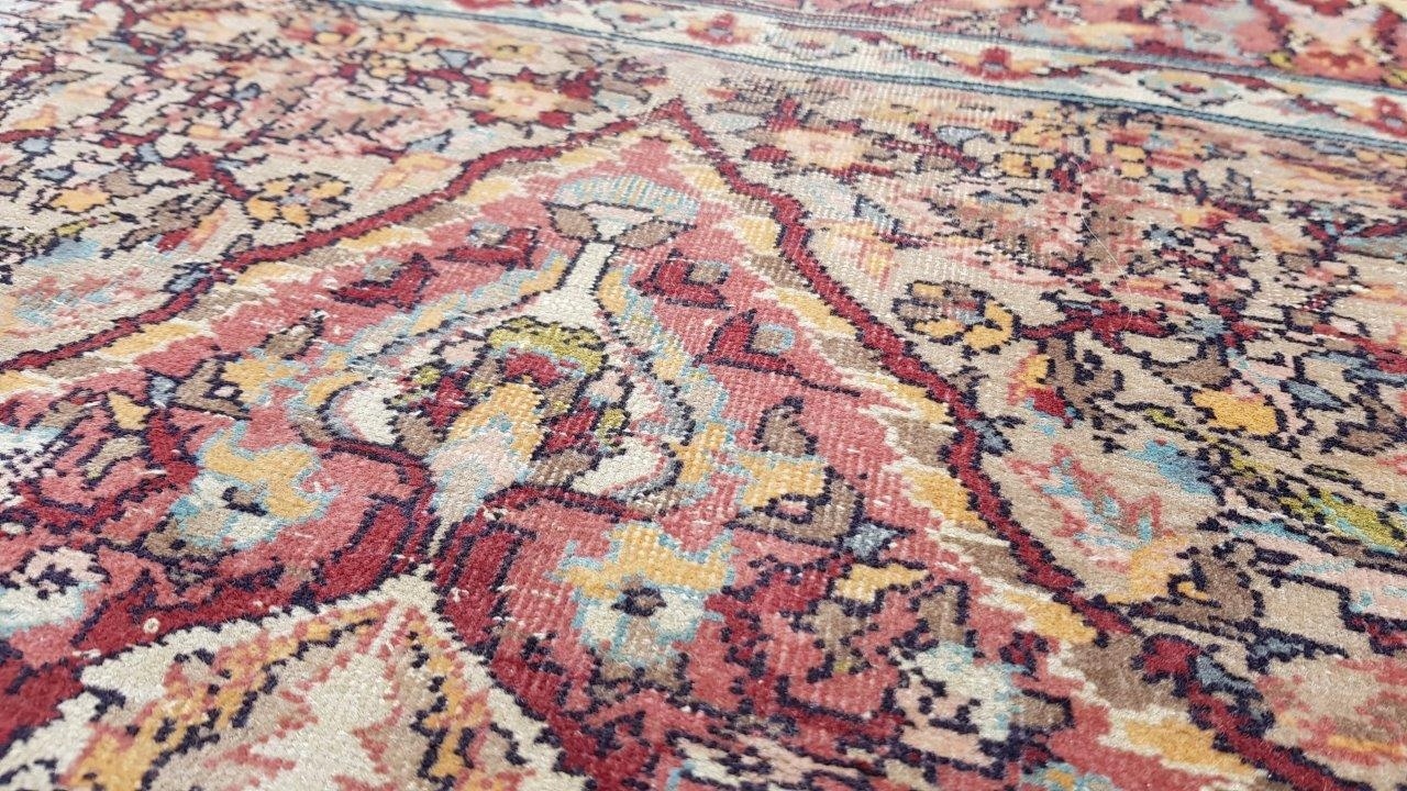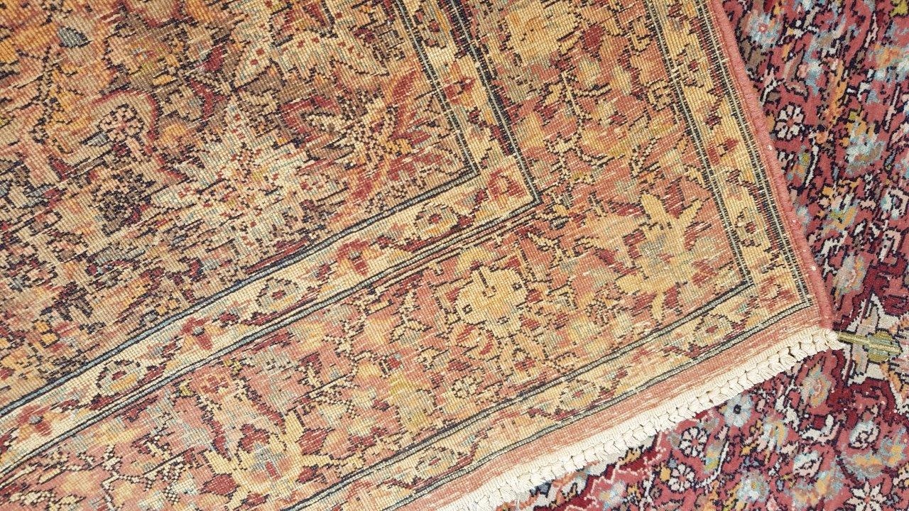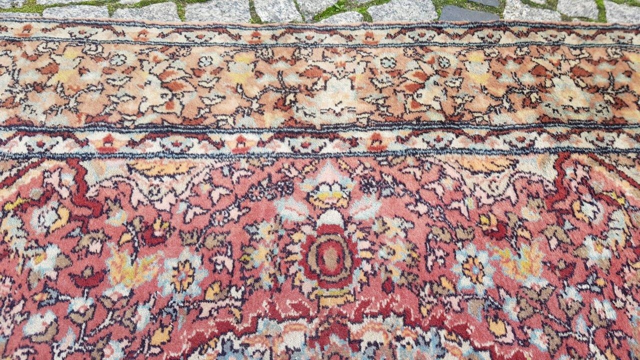 Прекрасний індійський килим Ісфахан. Виткана вручну з вовни найвищої якості. Характеризується компактним, приємним на дотик, блискучим флісом і красивими кольорами та візерунками. Зберігся в хорошому стані. Має потертості.