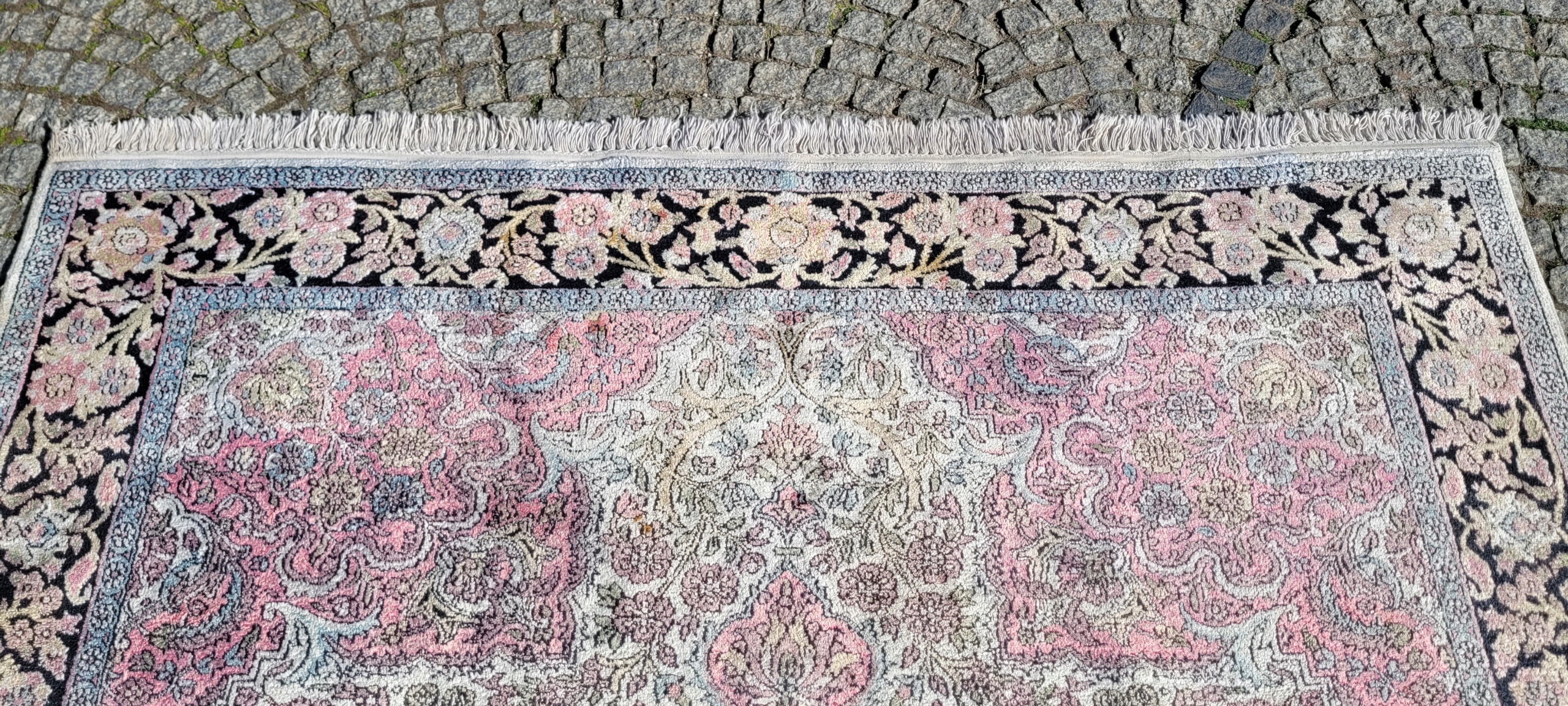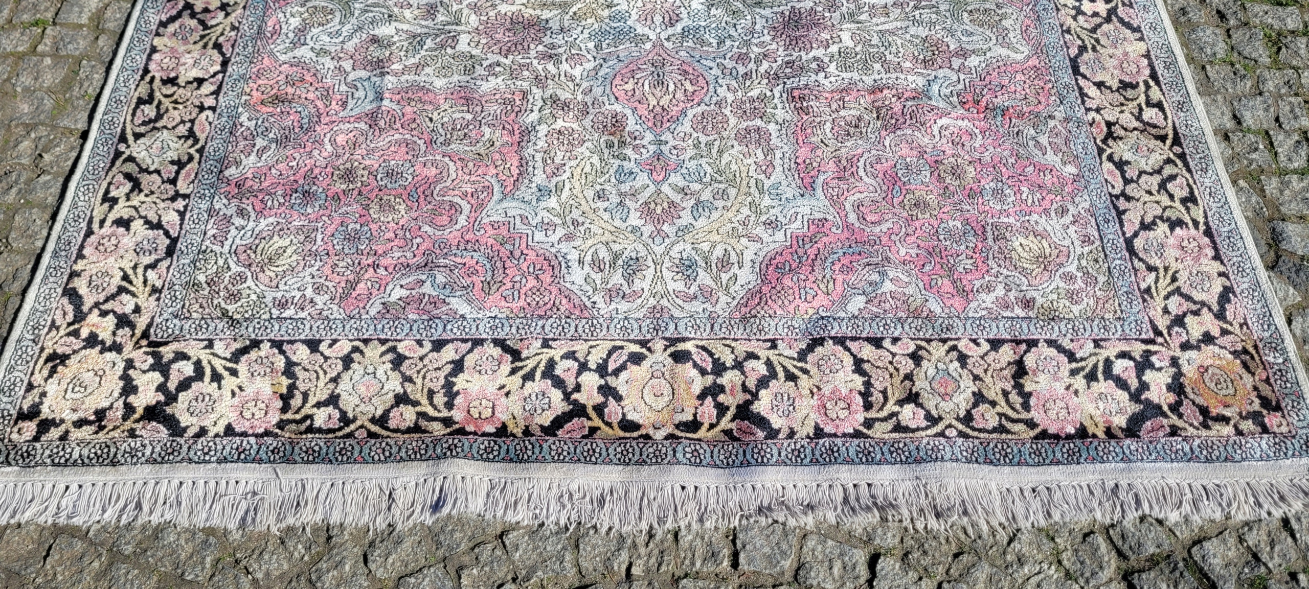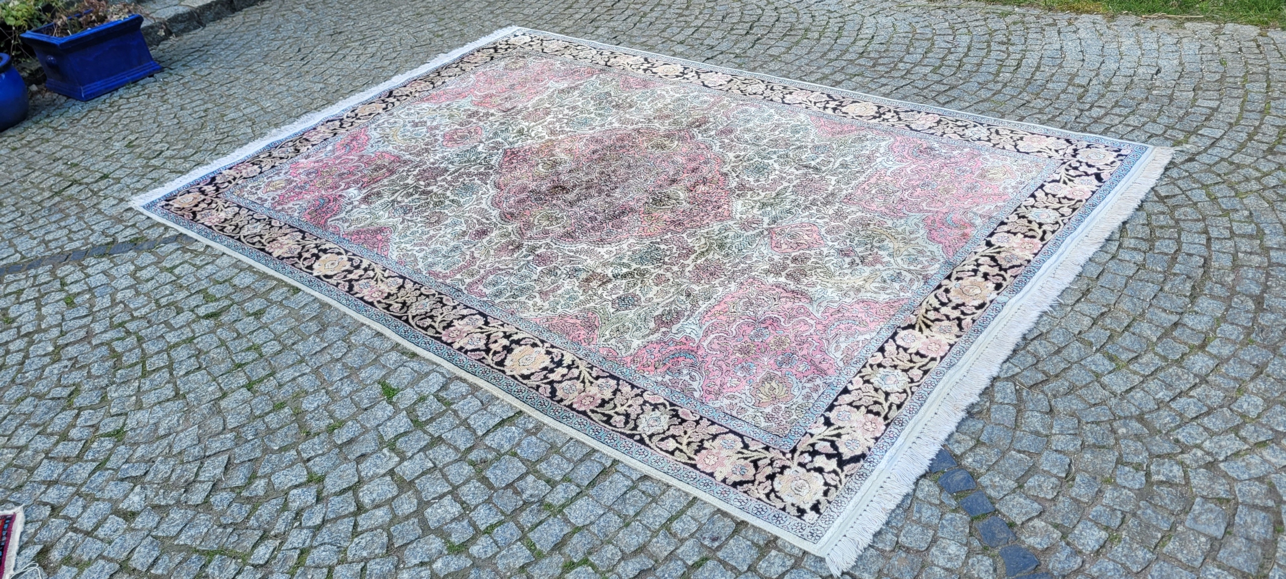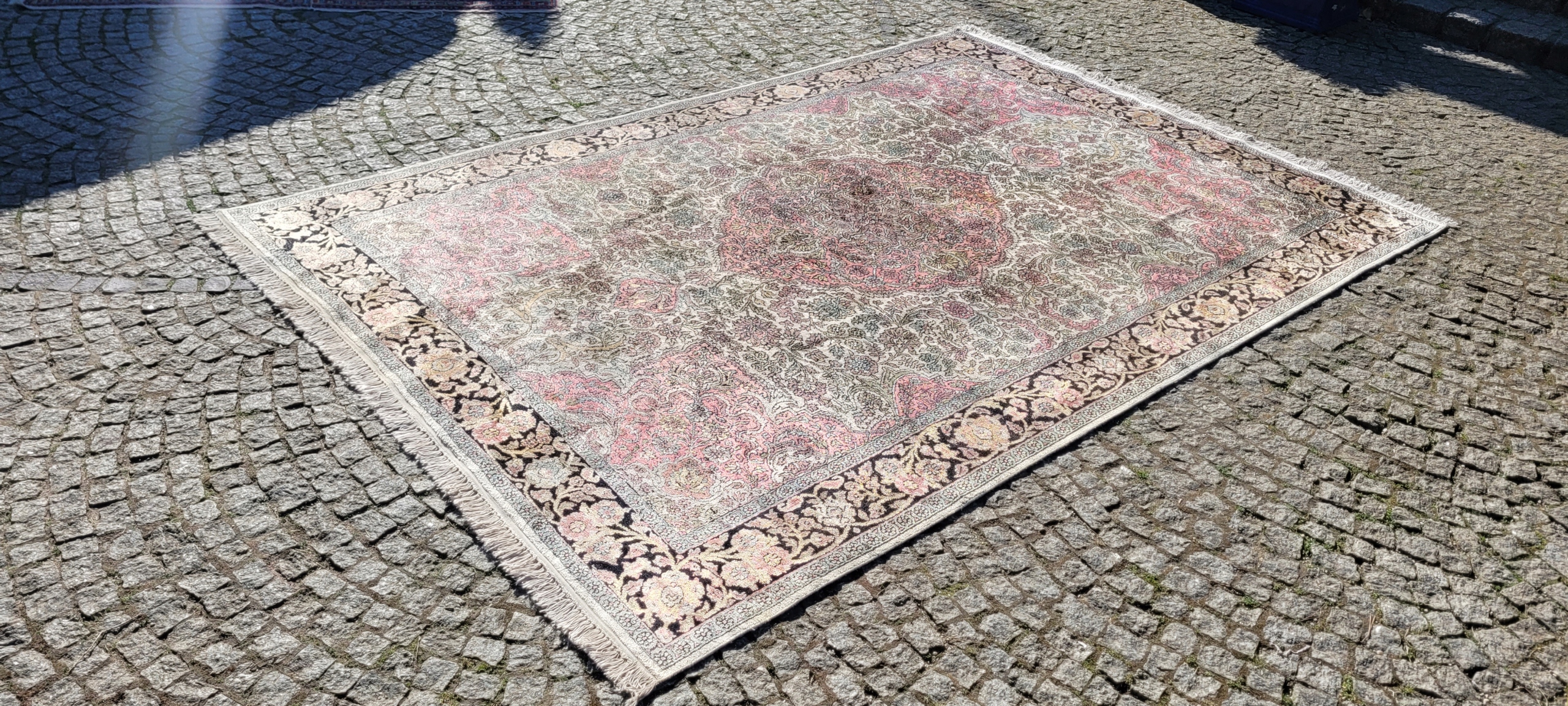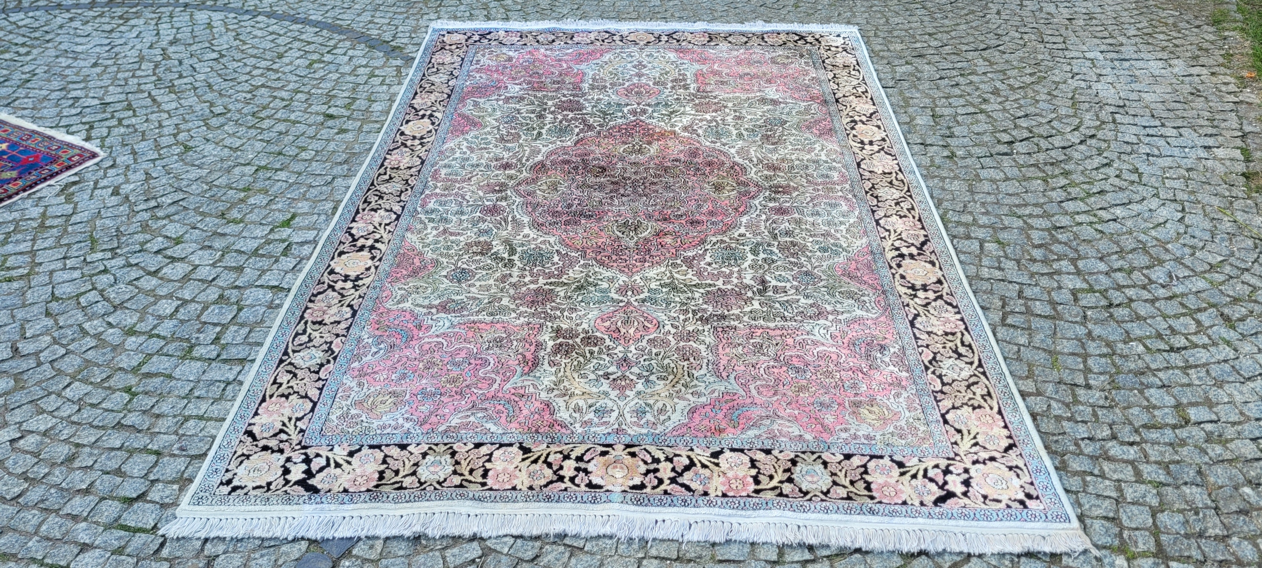 Індійський килим Гом. Сплетений вручну з шовку. Він характеризується компактним, приємним на дотик, блискучій трубі та красиві кольори та дизайну. Він зберігається в хорошому стані, видно на знімках.