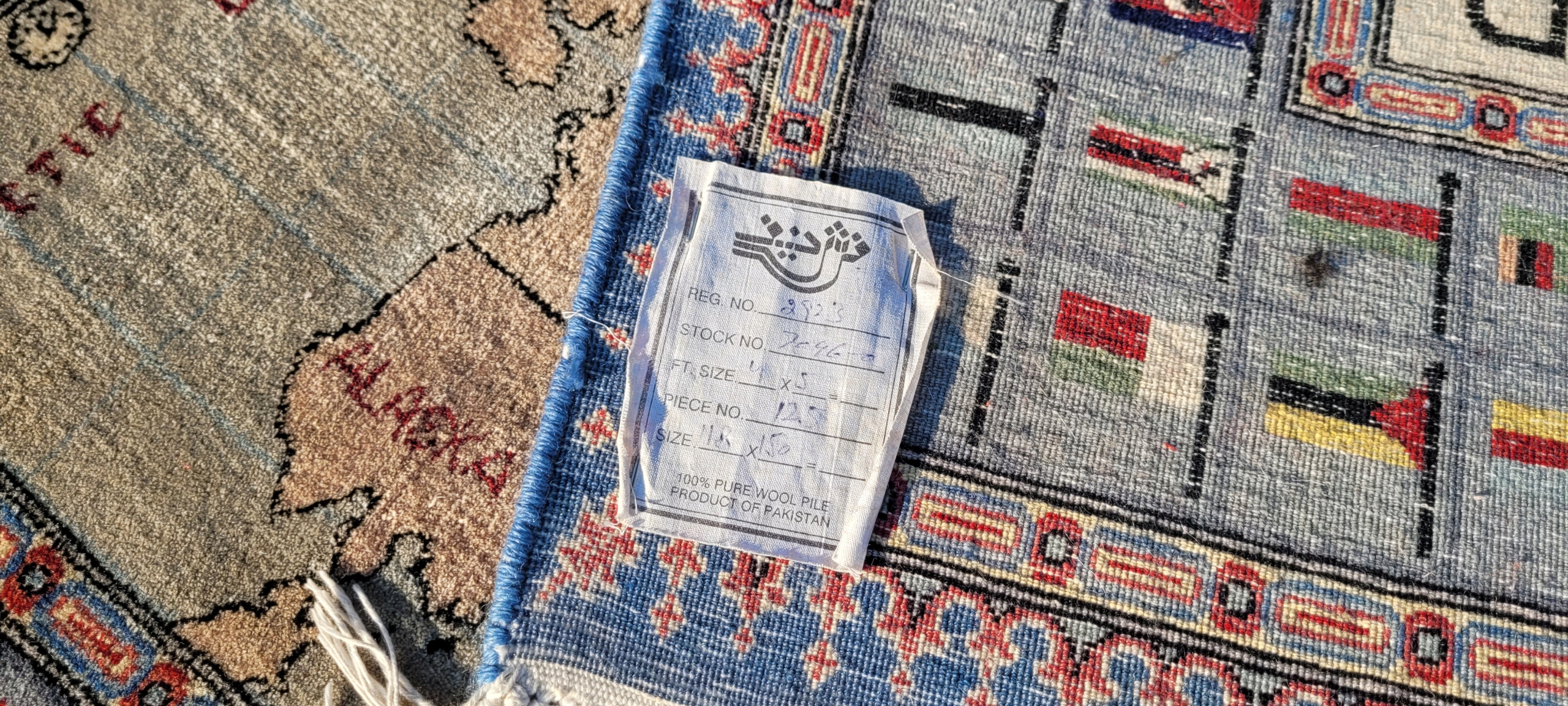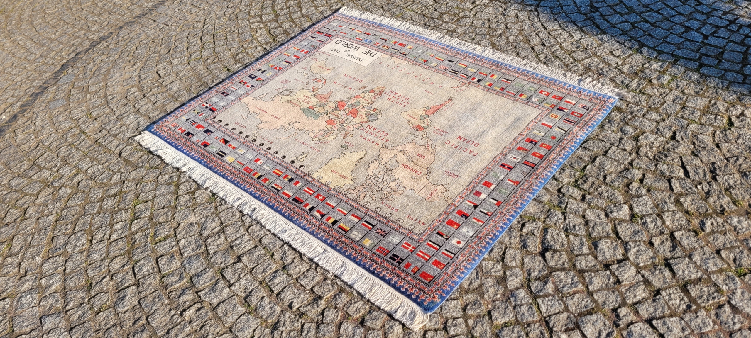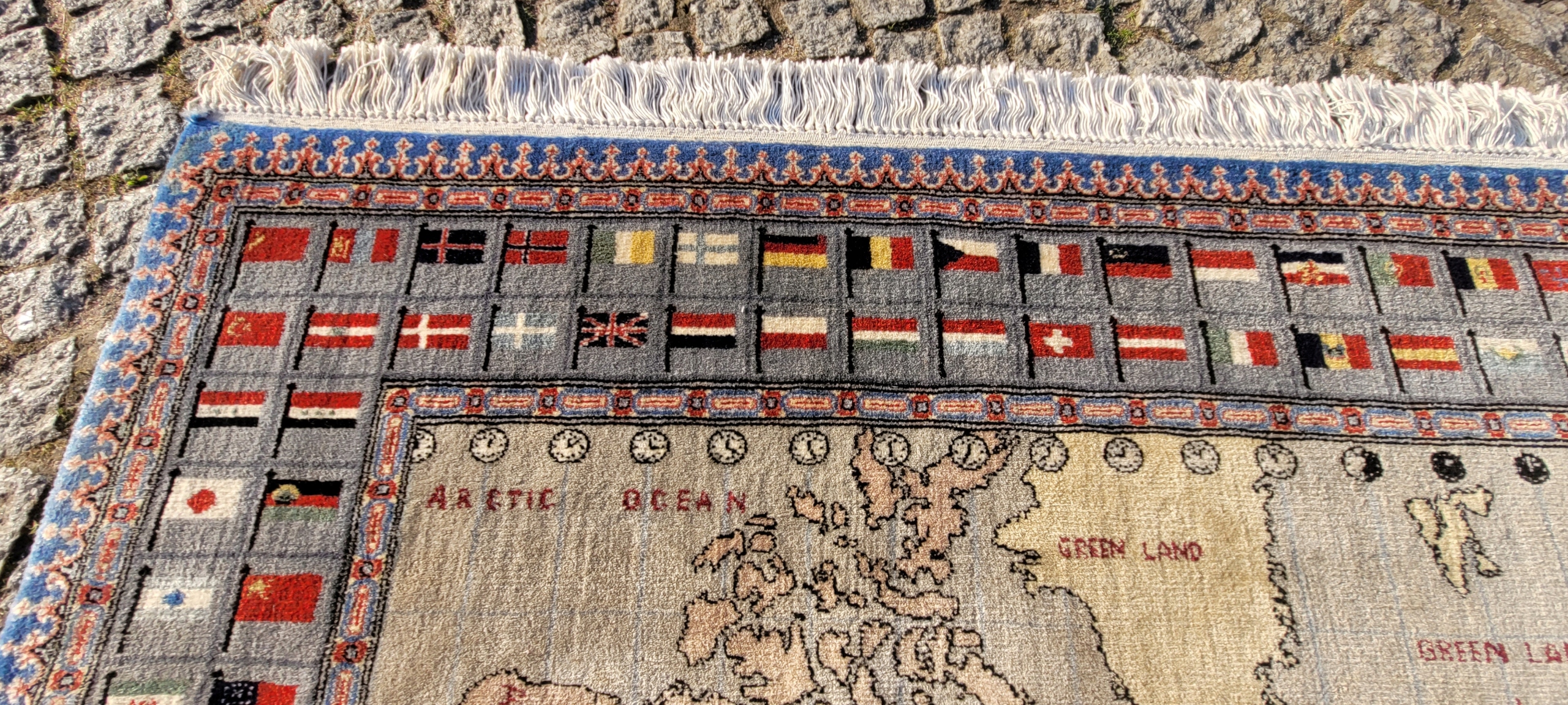 Пакистанський килим. Виткана вручну з полірованої вовни найвищої якості. Характеризується компактним, приємним на дотик, блискучим флісом і красивими кольорами та візерунками. В хорошому стані, видно на фото. Унікальний дизайн із зображенням карти світу.