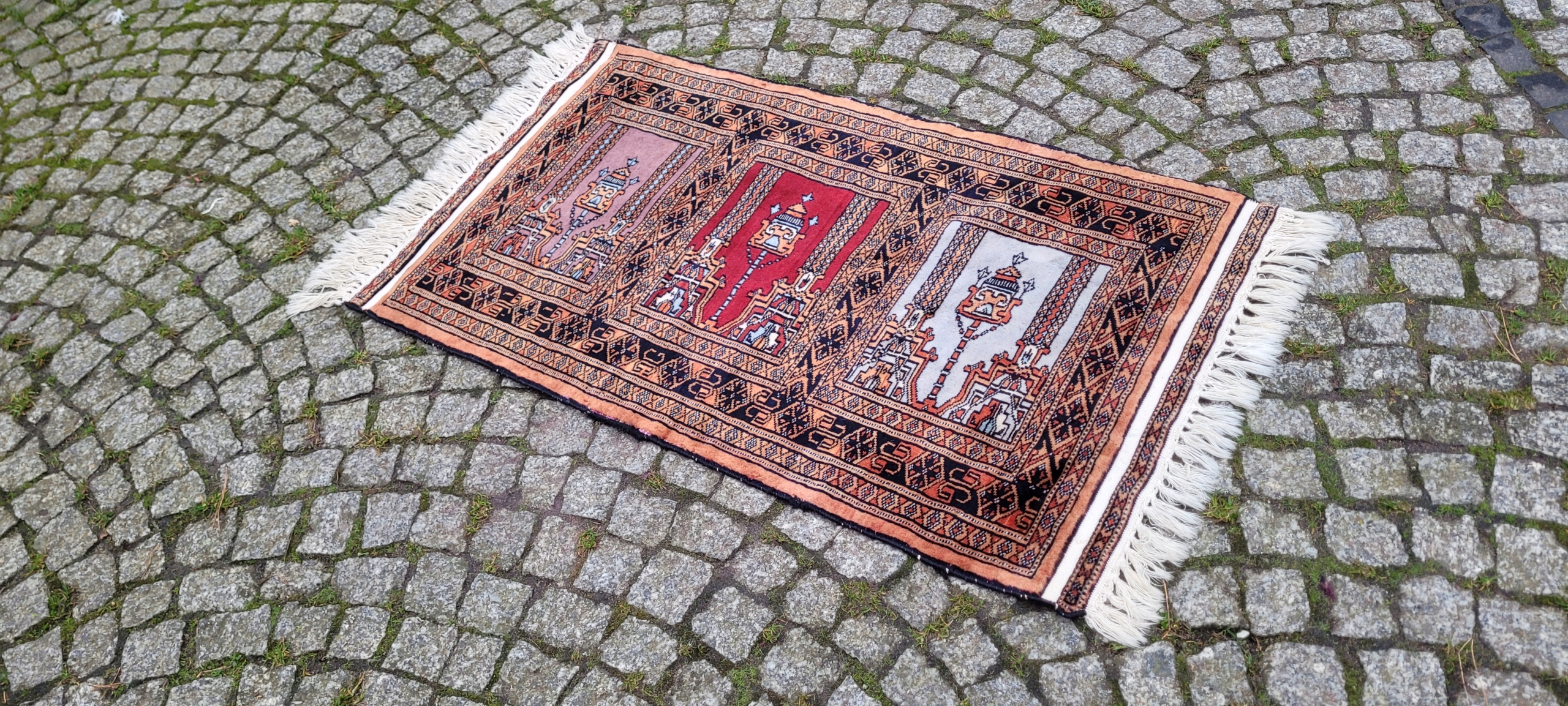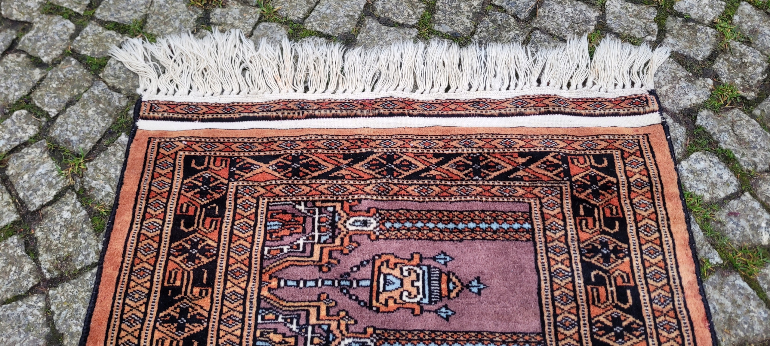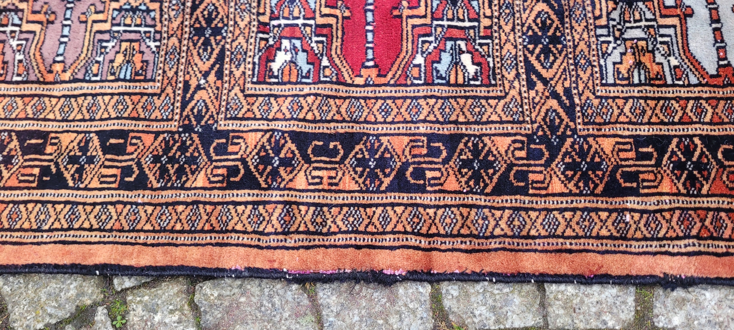 Бухарський килим. Виткана вручну з полірованої вовни найвищої якості. Характеризується компактним, приємним на дотик, блискучим флісом і красивими кольорами та візерунками. У хорошому стані, видно на фото.