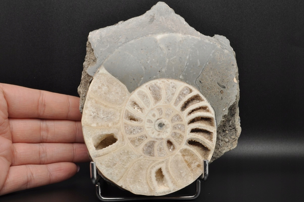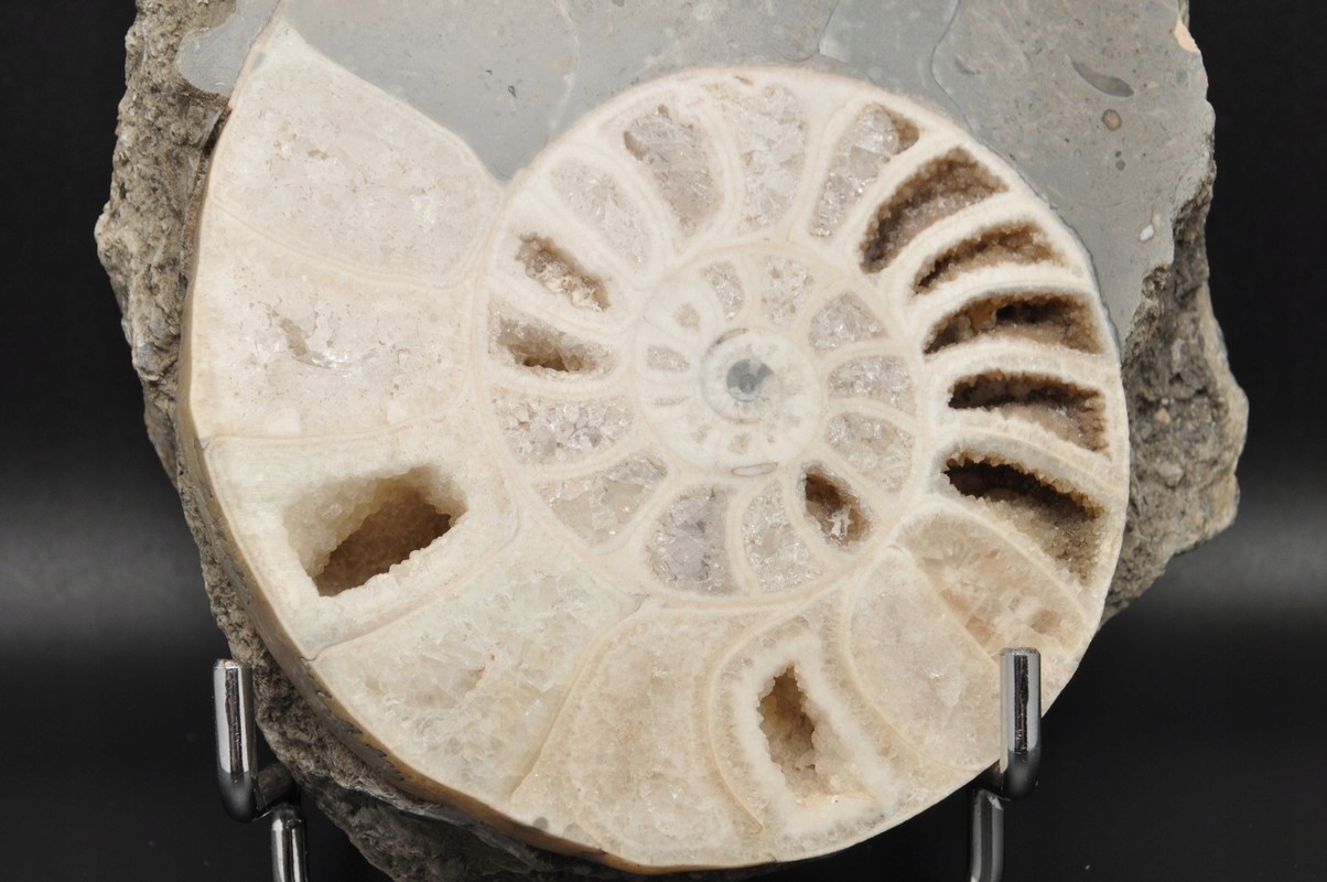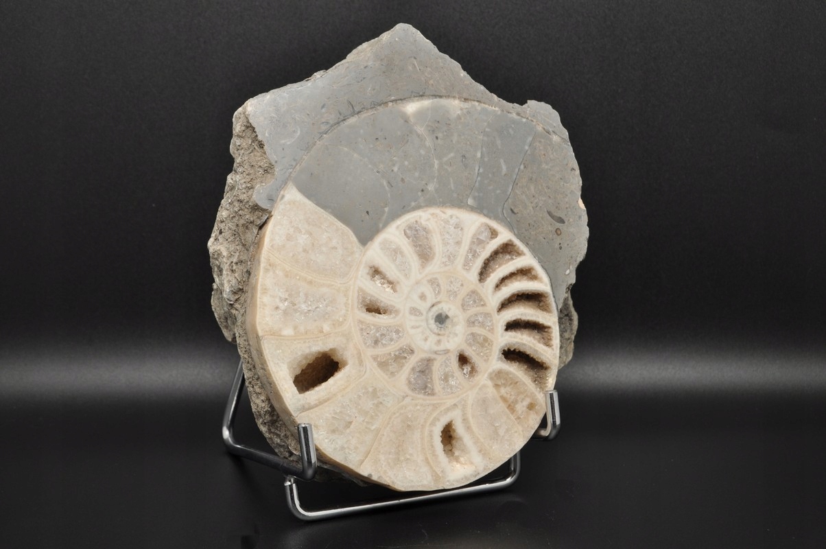Амоніти, амоніти (Ammonoidea) - підклас вимерлих головоногих молюсків (Cephalopoda), зазвичай із симетричною, плоскоспіральною раковиною. Деякі типи мали незвичайні форми, наприклад, пряма раковина, вертикально закручена спіраль або спіраль з безконтактними витками. Вони зустрічаються в гірських породах морського походження, що датуються девонським періодом до кінця крейдяного періоду. Деякі з окремих камер відкриті та заповнені багатим асортиментом бежевих сірих і коричневих кристалів кальциту з перегородками між кожною камерою.