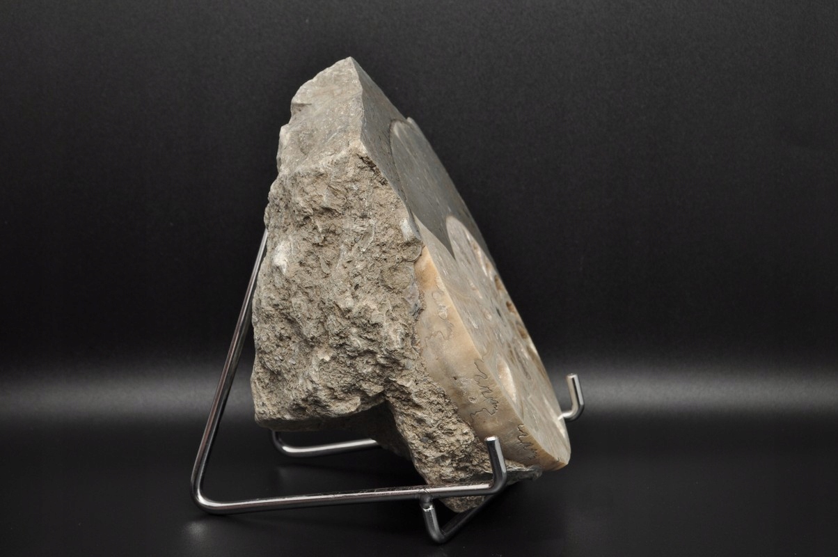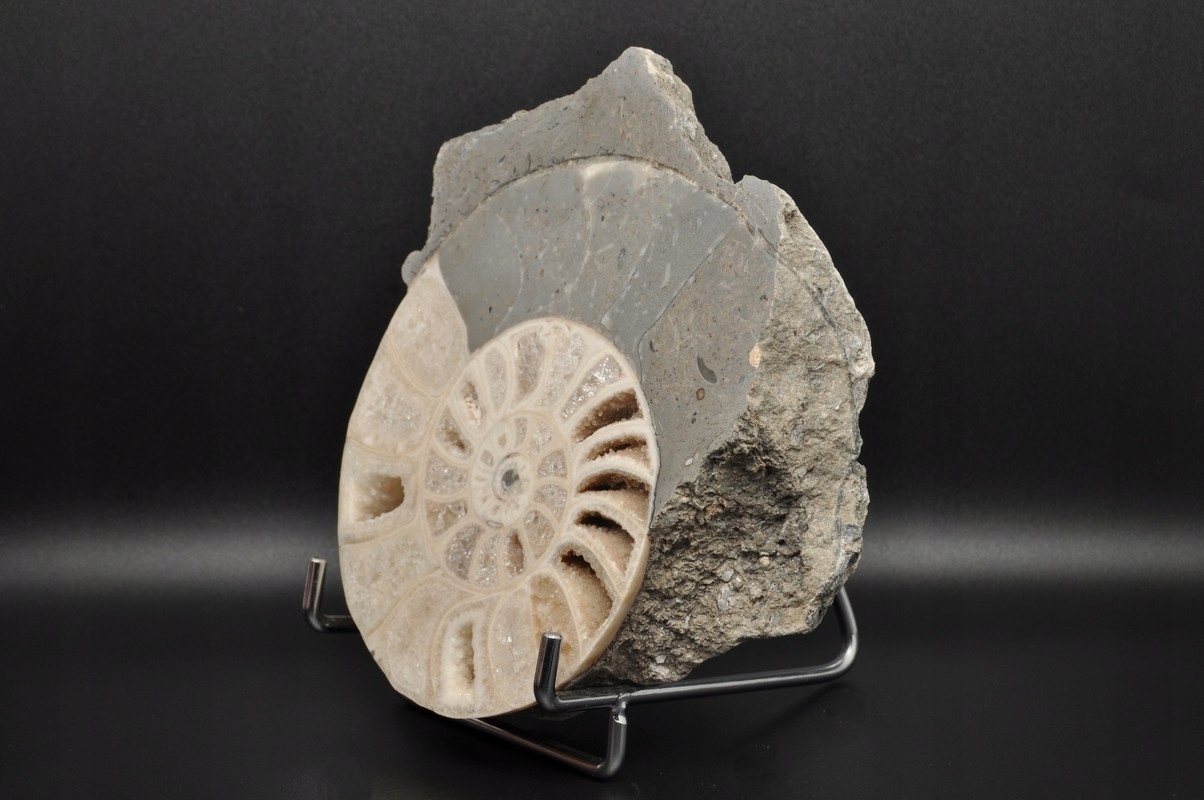 ПОЛОВИНА АМОНІТУ, ПРАЙДОВО ЗБЕРЕЖЕНИЙ ЗРАЗОК. ВИКОПАЛИВОСТІ З НІГЕРІЇ. АМОНІТ МАЄ КАМЕРИ, ЯКІ ЗАПОВНЕНІ КАЛЬЦИТОМ, ДЕЯКІ З НИХ УТВОРИЛИ КАЛЬЦИТОВІ ЖЕОДИ. ВЕЛИКИЙ, УНІКАЛЬНИЙ ЕКЗЕМПЛЯР, ОТРІБАНИЙ ТА ПОЛІРОВАНИЙ. РІДКІСНЕ МІСЦЕ.