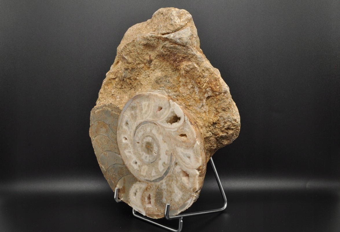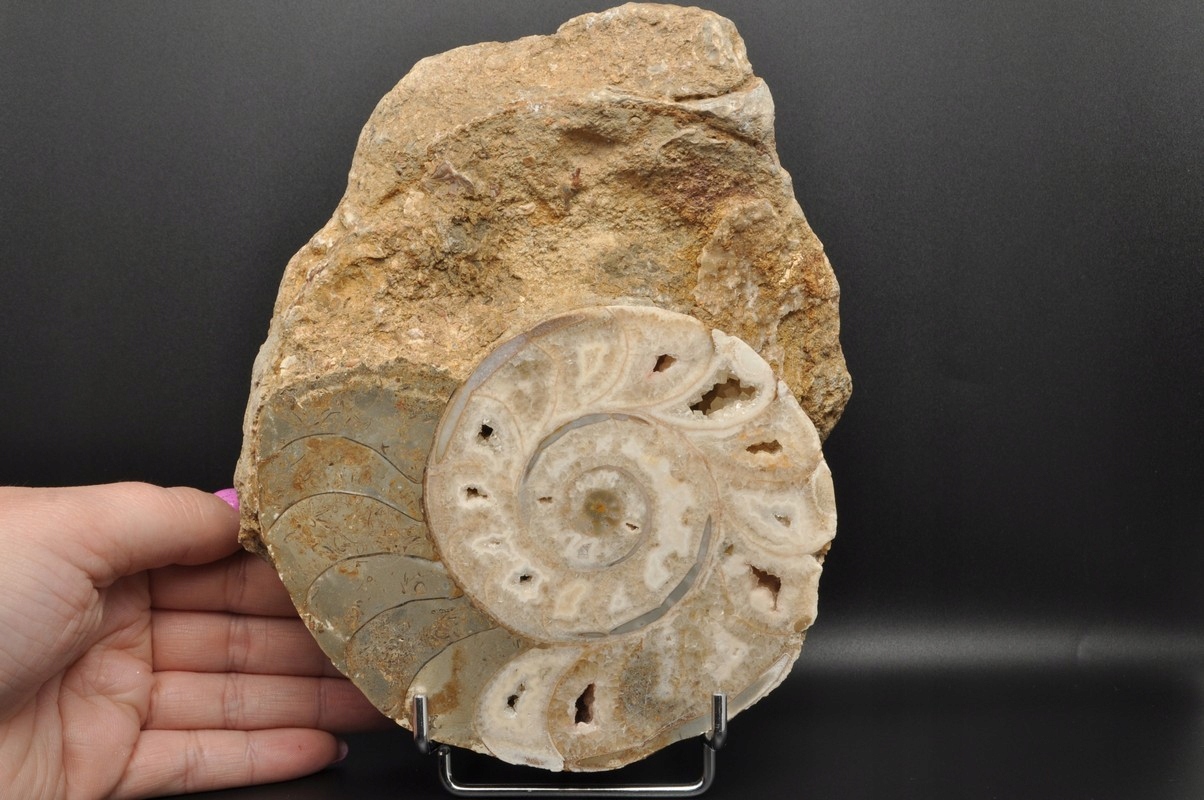 ПОЛОВИНА АМОНІТУ, ПРАЙДОВО ЗБЕРЕЖЕНИЙ ЗРАЗОК. ВИКОПАЛИВОСТІ З НІГЕРІЇ. АМОНІТ МАЄ КАМЕРИ, ЯКІ ЗАПОВНЕНІ КАЛЬЦИТОМ, ДЕЯКІ З НИХ УТВОРИЛИ КАЛЬЦИТОВІ ЖЕОДИ. ВЕЛИКИЙ, УНІКАЛЬНИЙ ЕКЗЕМПЛЯР, ОТРІБАНИЙ ТА ПОЛІРОВАНИЙ. РІДКІСНЕ МІСЦЕ.
