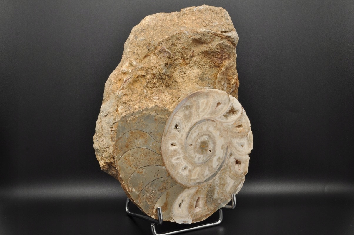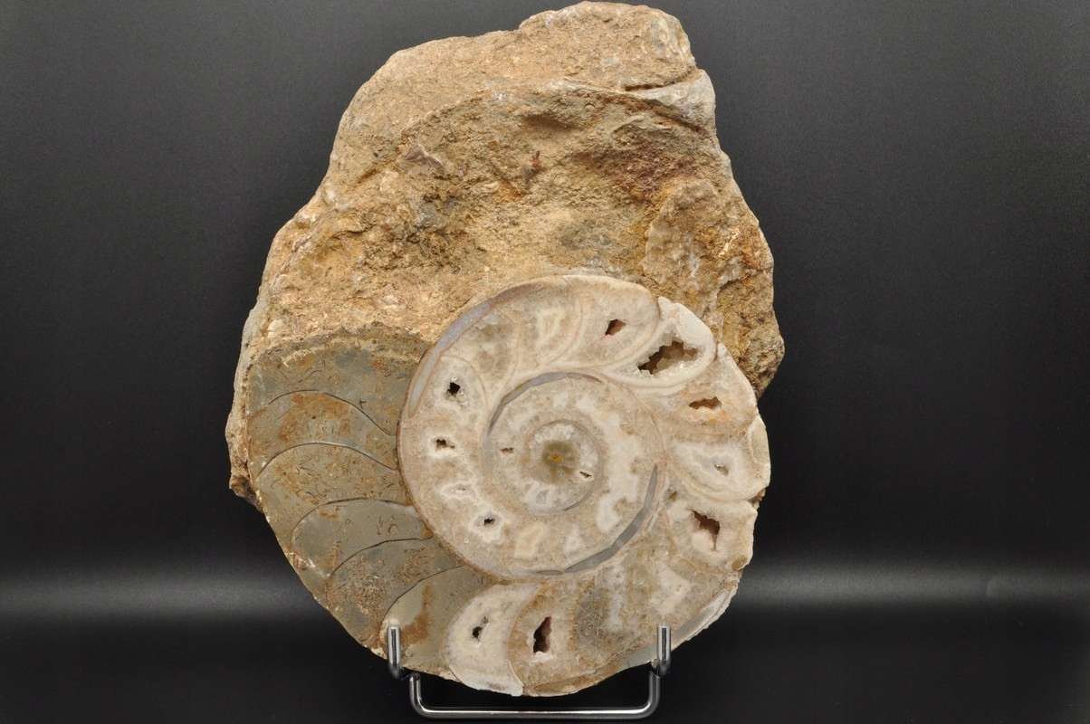 Амоніти, амоніти (Ammonoidea) - підклас вимерлих головоногих молюсків (Cephalopoda), зазвичай із симетричною, плоскоспіральною раковиною. Деякі типи мали незвичайні форми, наприклад, пряма раковина, вертикально закручена спіраль або спіраль з безконтактними витками. Вони зустрічаються в гірських породах морського походження, що датуються девонським періодом до кінця крейдяного періоду. Деякі з окремих камер відкриті та заповнені багатим набором сіро-бежевих і коричневих кристалів кальциту з перегородками між камерами.