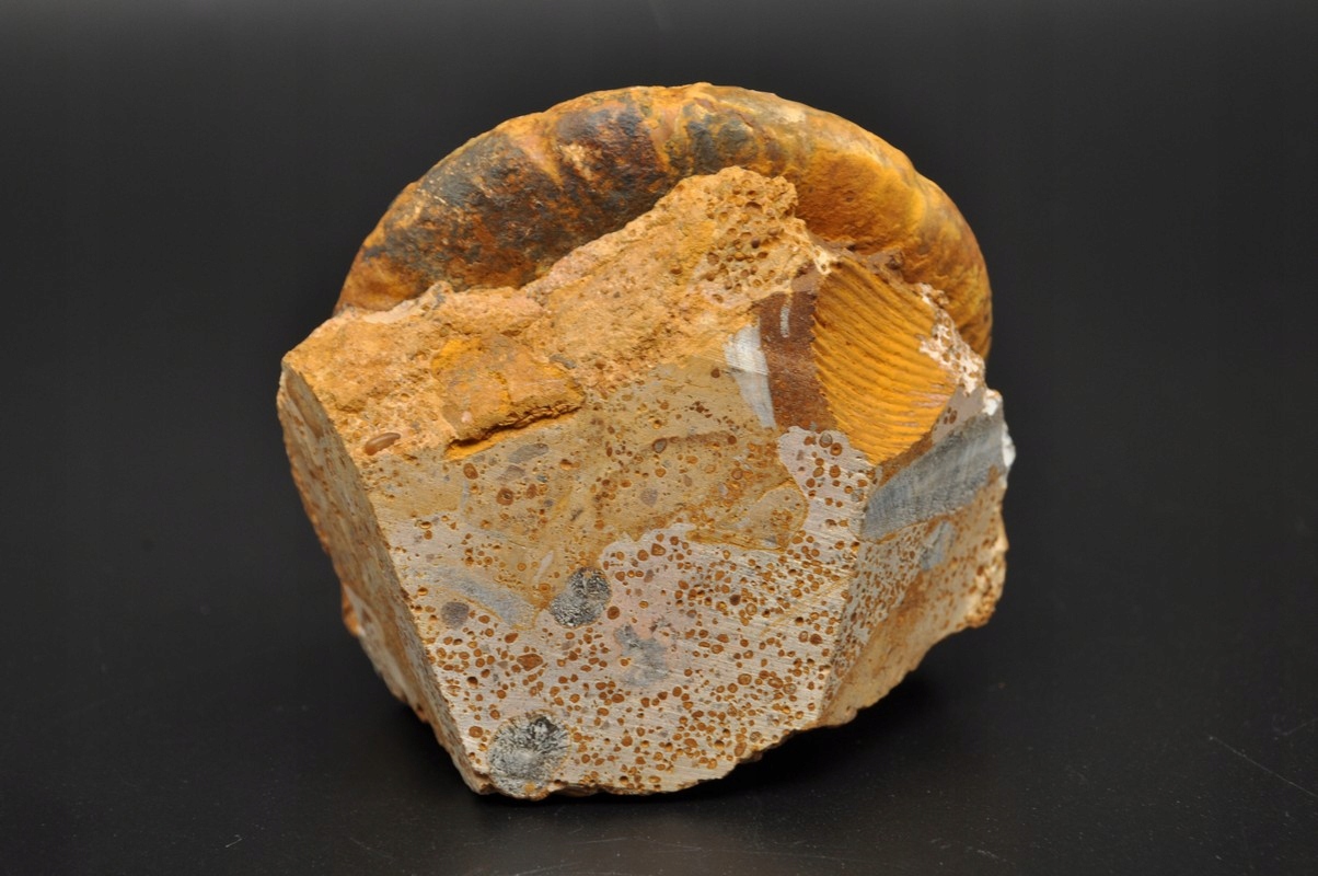 Амоніти, амоніти (Ammonoidea) - підклас вимерлих головоногих молюсків (Cephalopoda), зазвичай із симетричною, плоскоспіральною раковиною. Деякі типи мали незвичайні форми, наприклад, пряма оболонка, вертикально закручена спіраль або спіраль з безконтактними витками. Вони зустрічаються в гірських породах морського походження, що датуються девонським періодом до кінця крейдяного періоду. Деякі окремі камери відкриті та заповнені багатим асортиментом сіро-бежевих і коричневих кристалів кальциту з перегородками між камерами