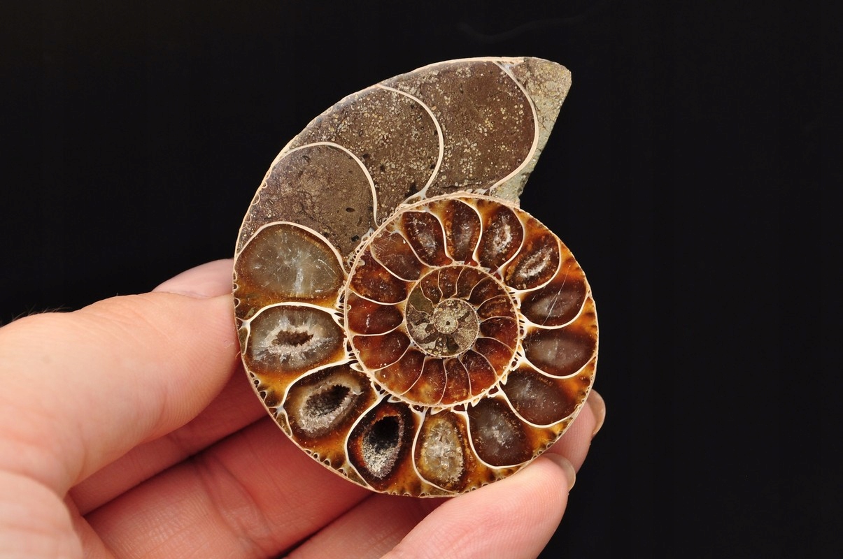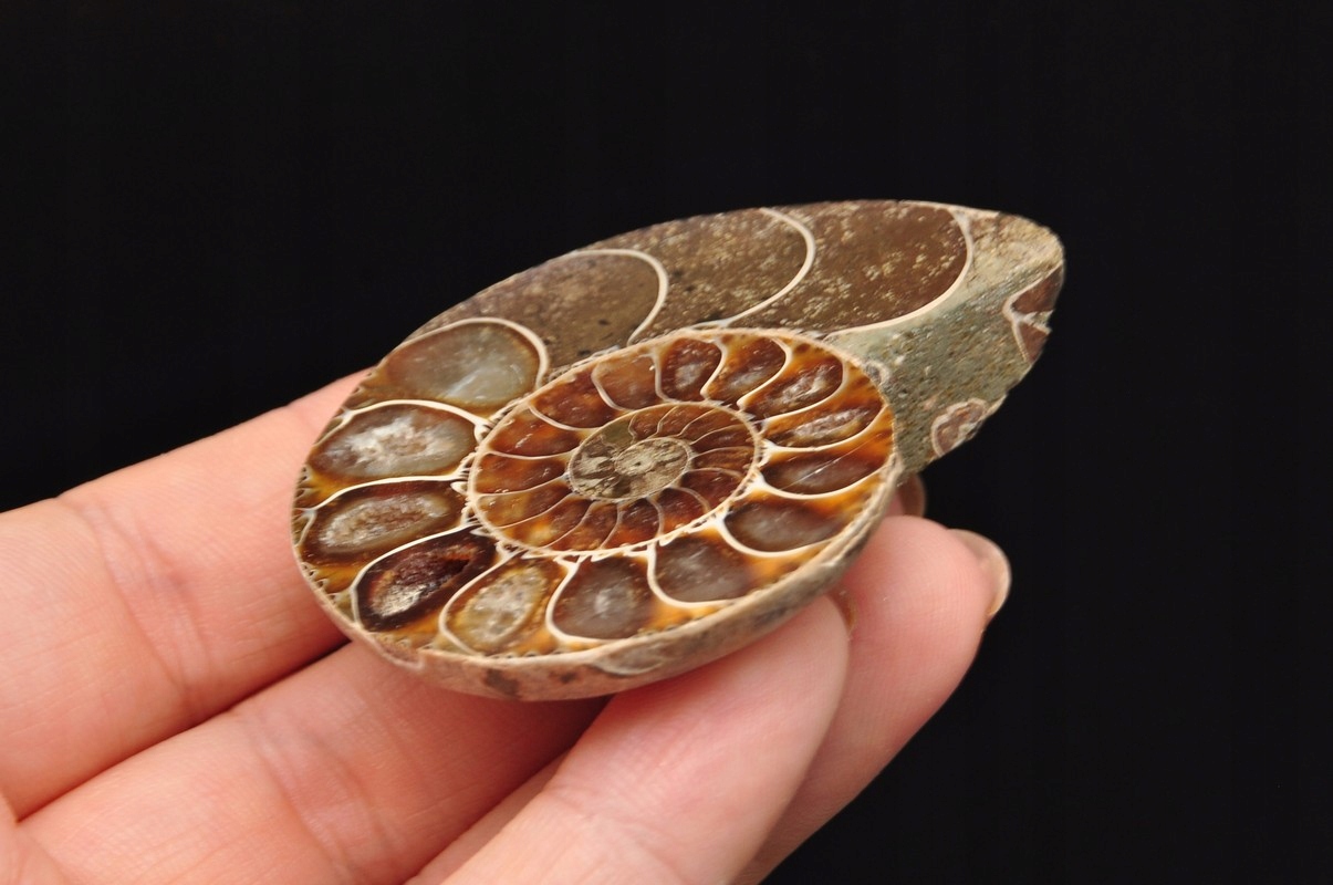 Аммоніти , амоніт (Ammonaidea) - підгрупа вимерлих головоногих (цефалопода), як правило, з симетричною, плоскою -імпортованою скоринкою. Нечисленні типи мали незвичайні форми, наприклад Проста оболонка, спіраль, згорнута вертикально, спіраль з незручними поворотами. Вони трапляються в скелях морського походження від періоду від Девона до кінця крейди. Деякі з окремих камер відкриті та наповнені багатим набором бежевих сірого та коричневого кальцитового кристалів, з перегородками між кожною камерою.