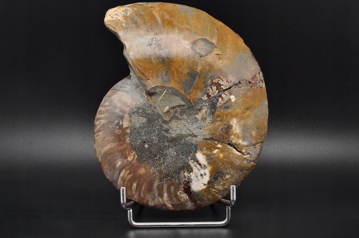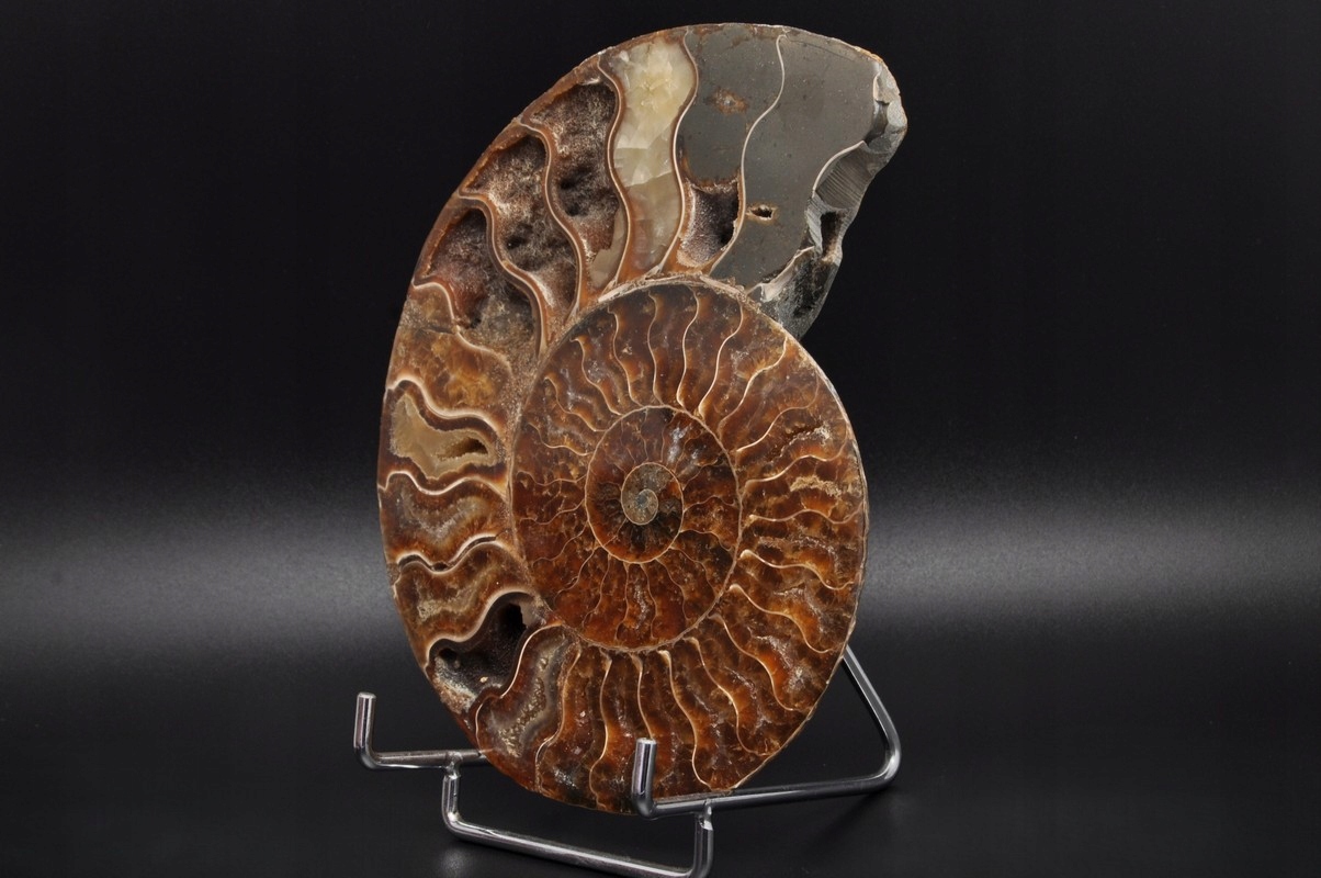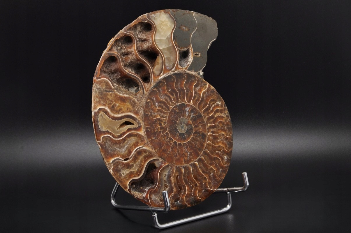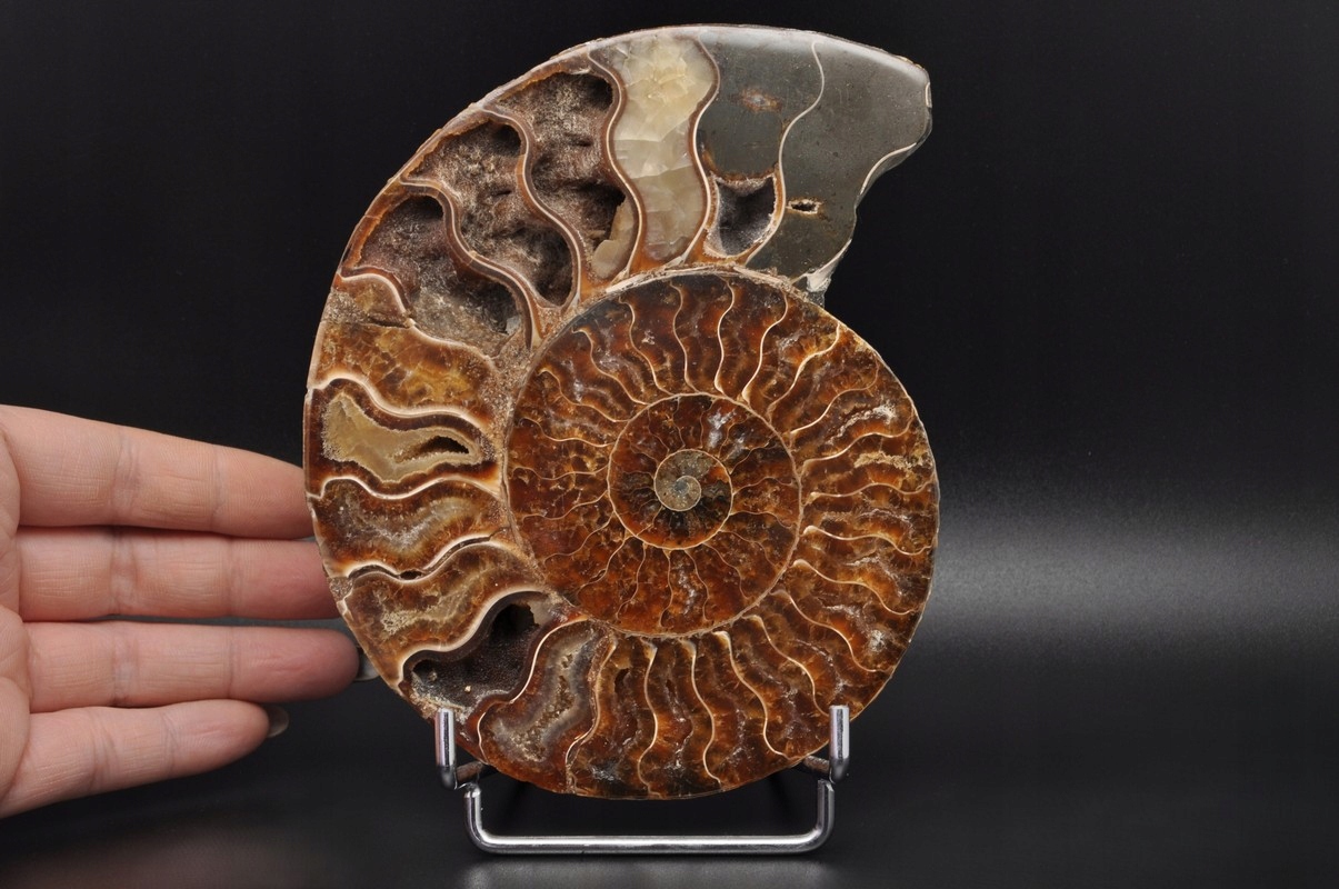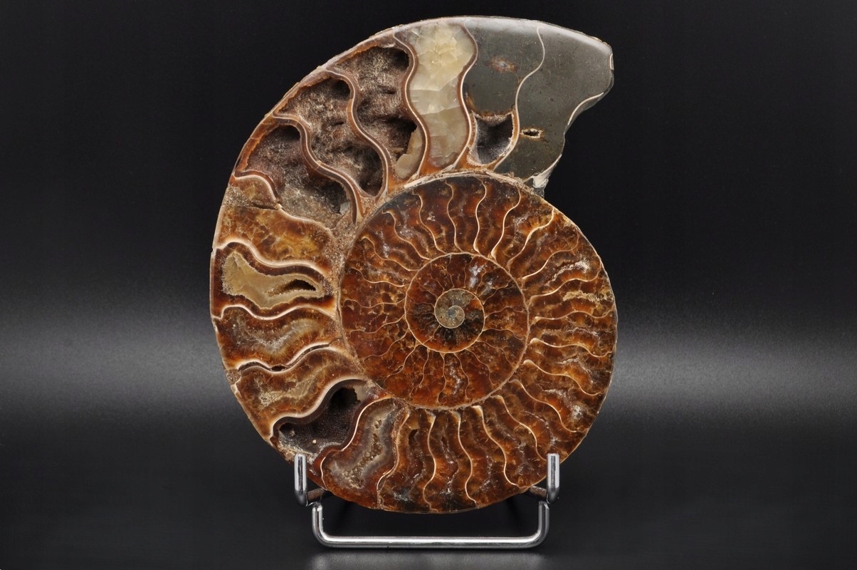 Аммоніти , амоніт (Ammonaidea) - підгрупа вимерлих головоногих (цефалопода), як правило, з симетричною, плоскою -імпортованою скоринкою. Нечисленні типи мали незвичайні форми, наприклад Проста оболонка, спіраль, згорнута вертикально, спіраль з незручними поворотами. Вони трапляються в скелях морського походження від періоду від Девона до кінця крейди. Деякі з окремих камер відкриті та наповнені багатим набором бежевих сірого та коричневого кальцитового кристалів, з перегородками між кожною камерою.