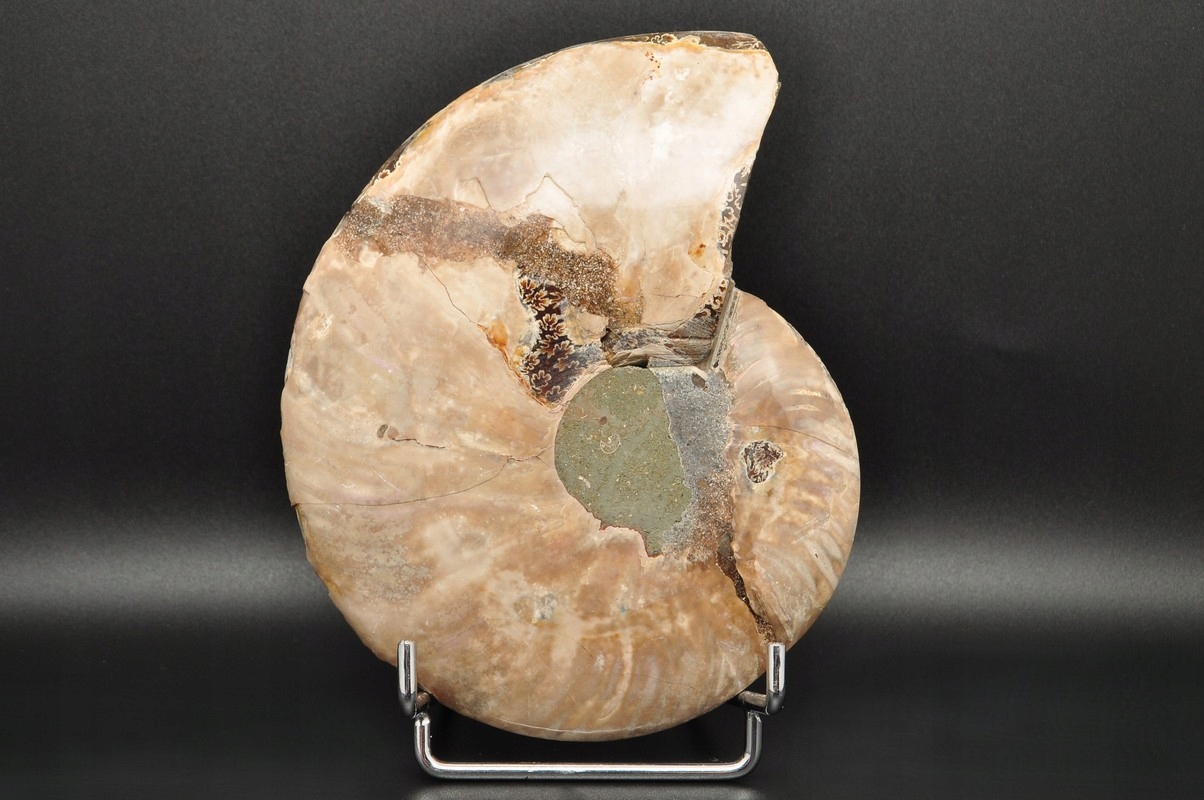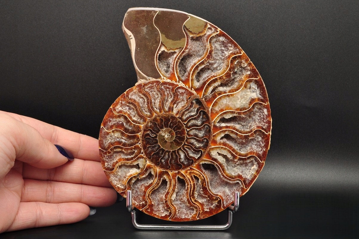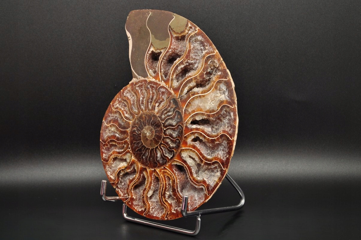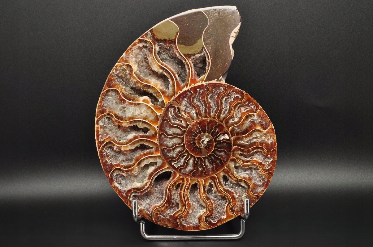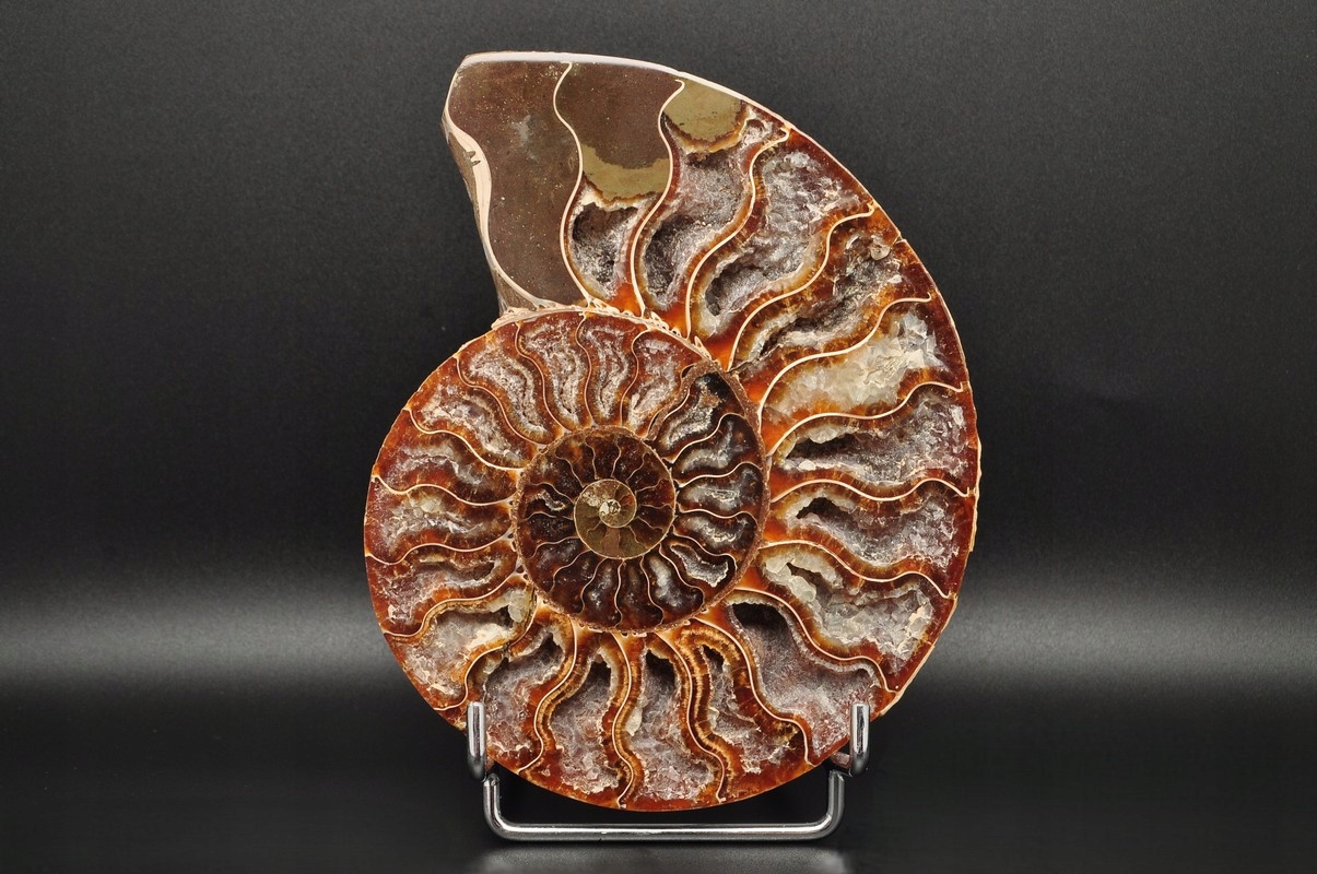 Аммоніти , амоніт (Ammonaidea) - підгрупа вимерлих головоногих (цефалопода), як правило, з симетричною, плоскою -імпортованою скоринкою. Нечисленні типи мали незвичайні форми, наприклад Проста оболонка, спіраль, згорнута вертикально, спіраль з незручними поворотами. Вони трапляються в скелях морського походження від періоду від Девона до кінця крейди. Деякі з окремих камер відкриті та наповнені багатим набором бежевих сірого та коричневого кальцитового кристалів, з перегородками між кожною камерою.