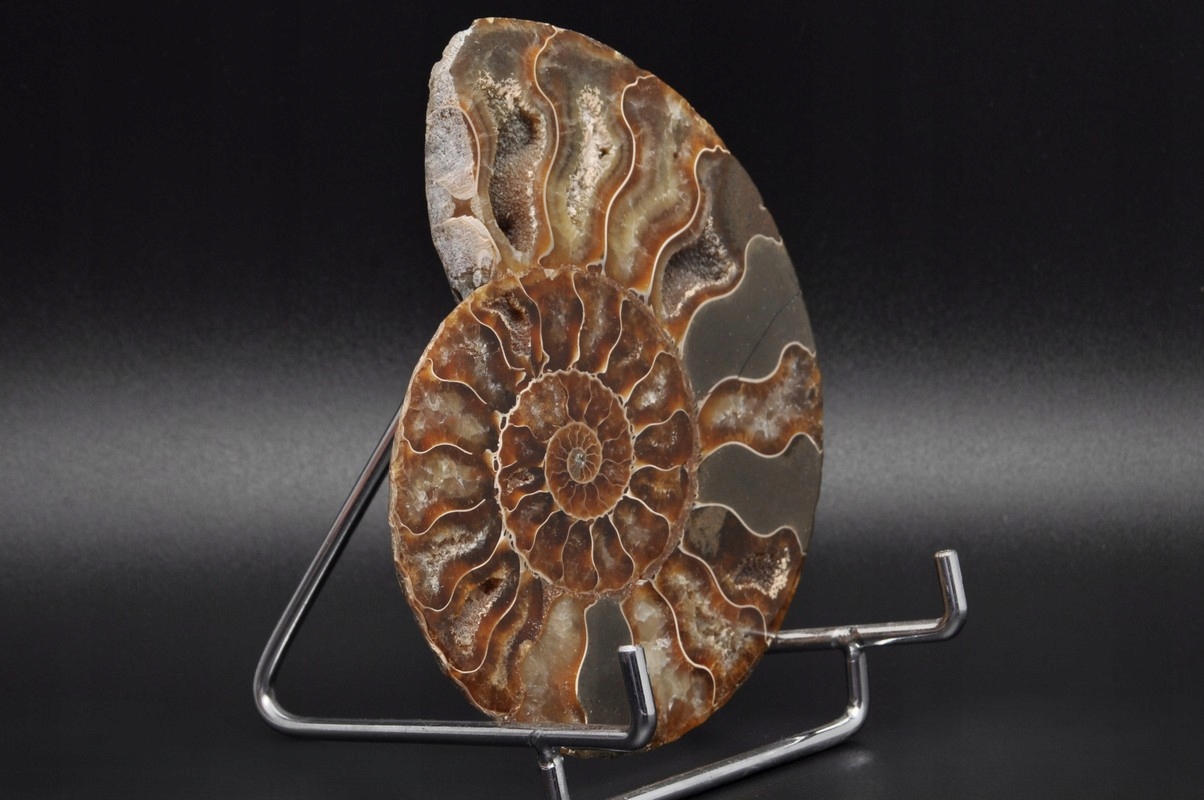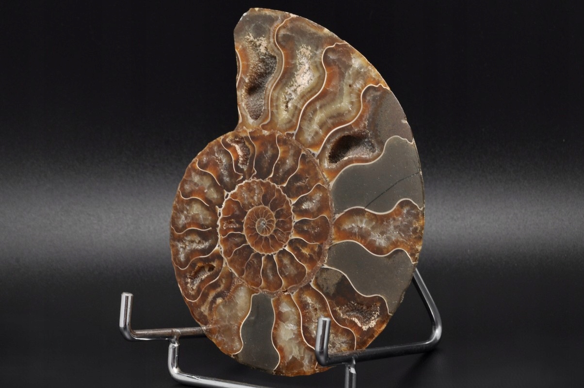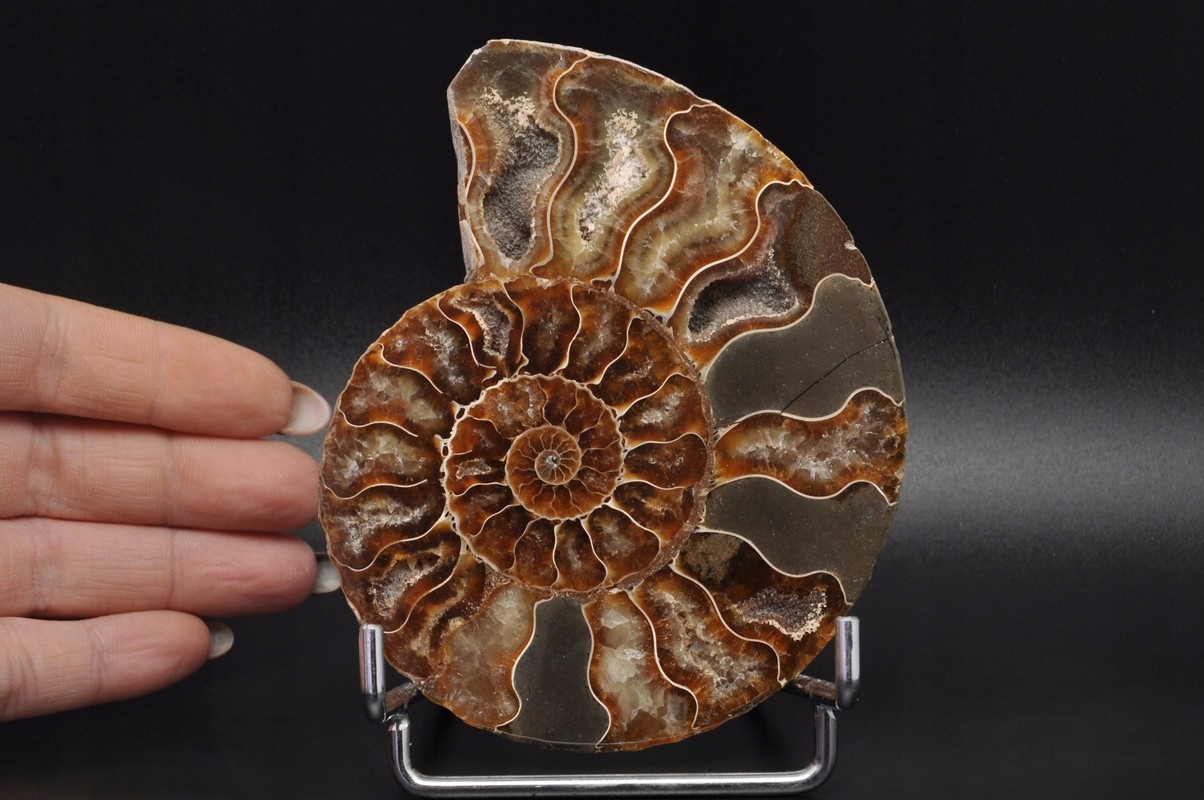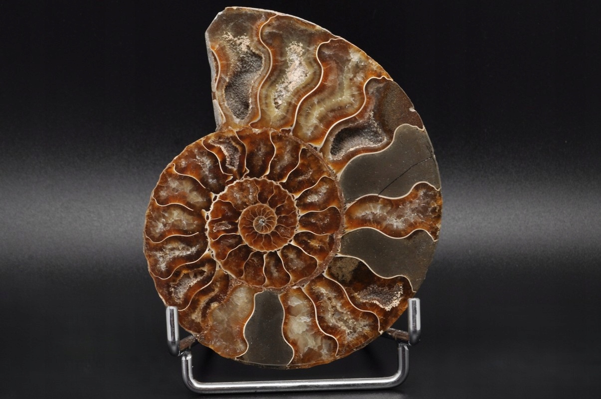 Амоніти, амоніти (Ammonoidea) - підклас вимерлих головоногих молюсків (Cephalopoda), зазвичай із симетричною, плоскоспіральною раковиною. Деякі типи мали незвичайні форми, наприклад, пряма раковина, вертикально закручена спіраль або спіраль з безконтактними витками. Вони зустрічаються в гірських породах морського походження, що датуються девонським періодом до кінця крейдяного періоду. Деякі з окремих камер відкриті та заповнені багатим асортиментом бежевих сірих і коричневих кристалів кальциту з перегородками між кожною камерою.