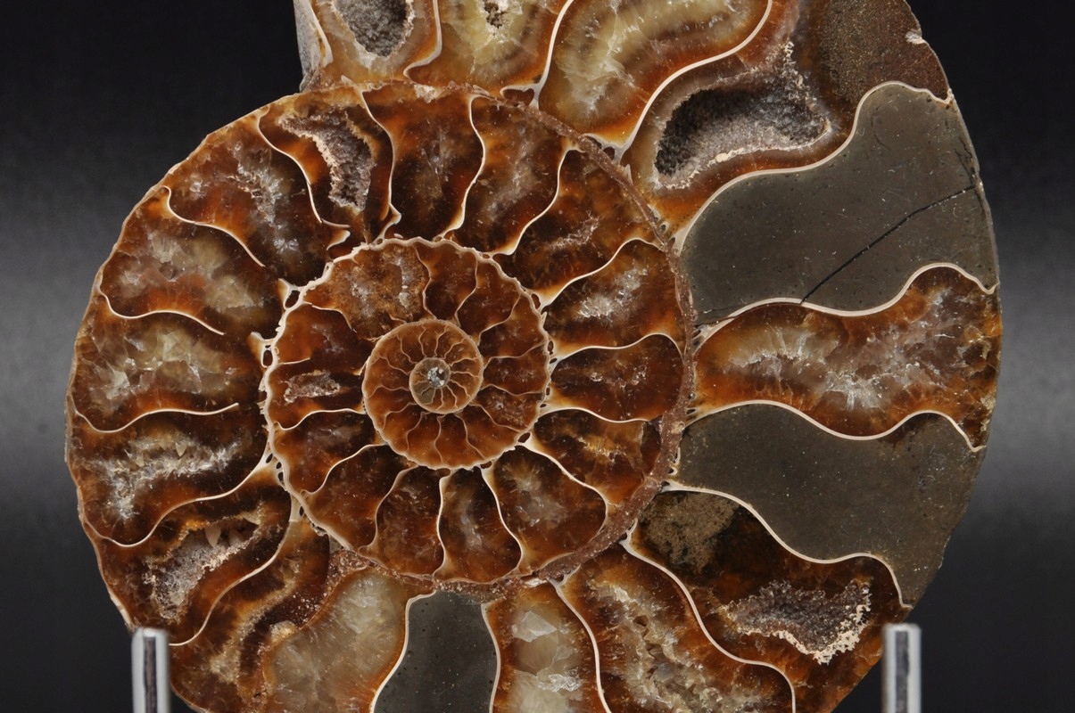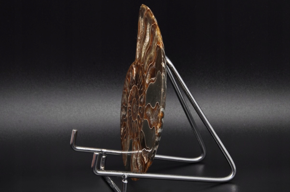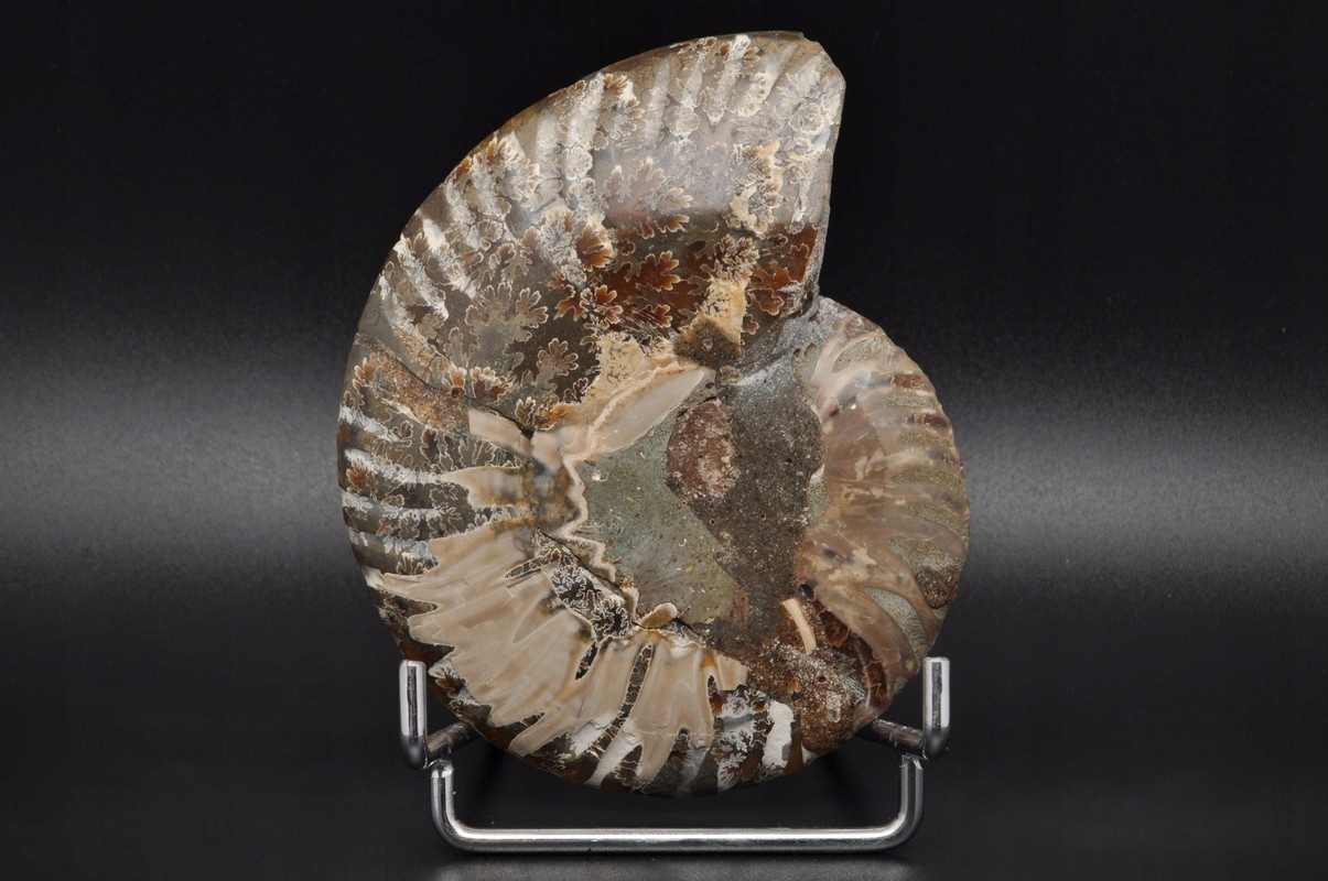 Амоніти, амоніти (Ammonoidea) - підклас вимерлих головоногих молюсків (Cephalopoda), зазвичай із симетричною, плоскоспіральною раковиною. Деякі типи мали незвичайні форми, наприклад, пряма раковина, вертикально закручена спіраль або спіраль з безконтактними витками. Вони зустрічаються в гірських породах морського походження, що датуються девонським періодом до кінця крейдяного періоду. Деякі з окремих камер відкриті та заповнені багатим асортиментом бежевих сірих і коричневих кристалів кальциту з перегородками між кожною камерою.