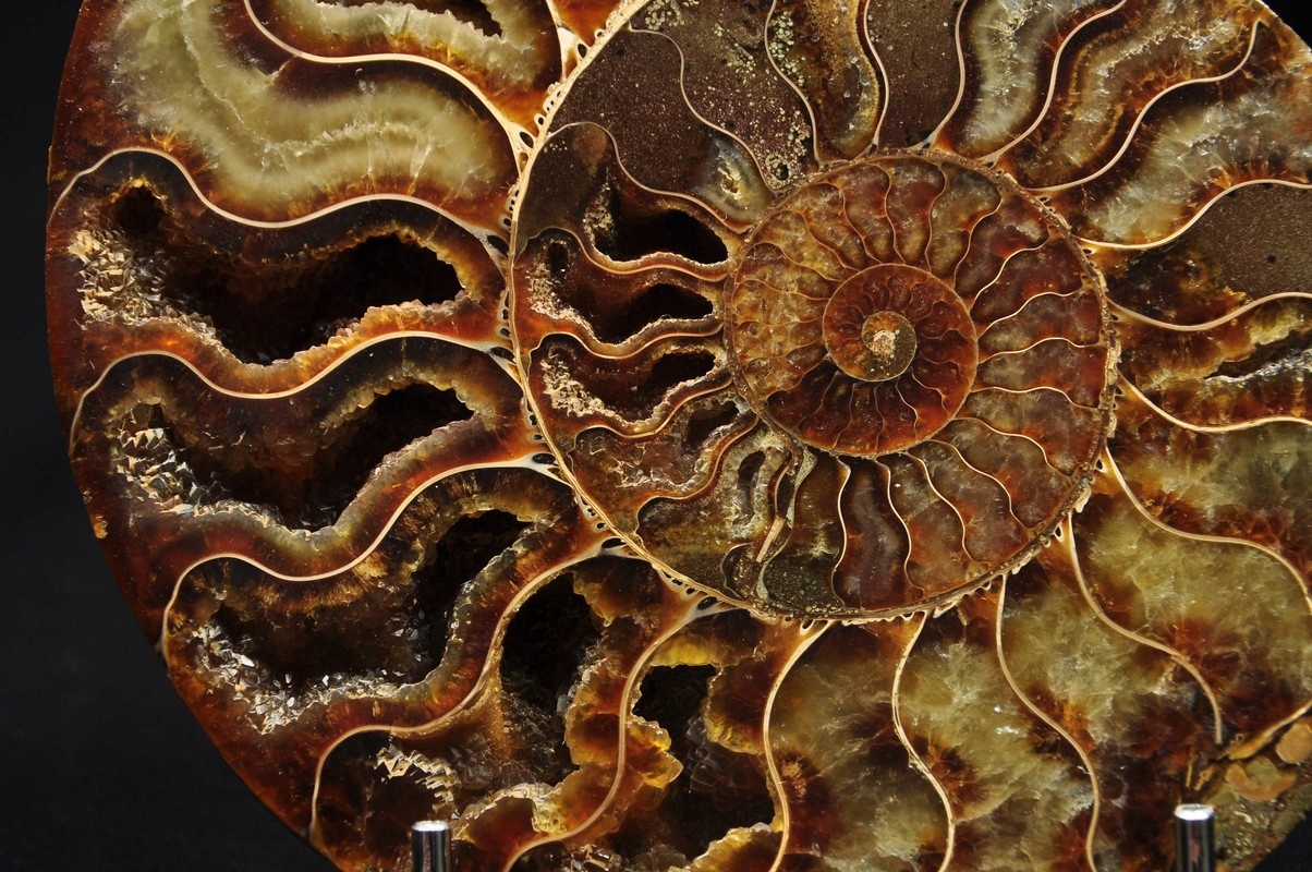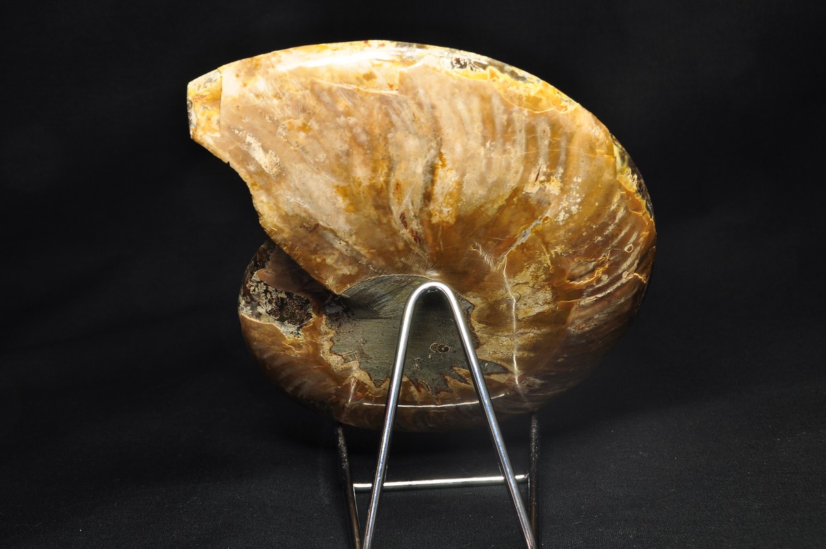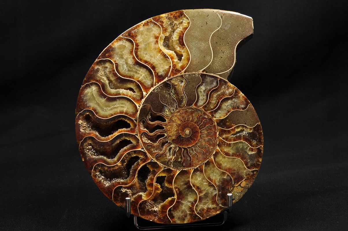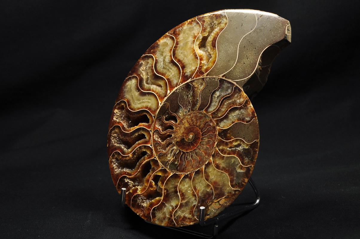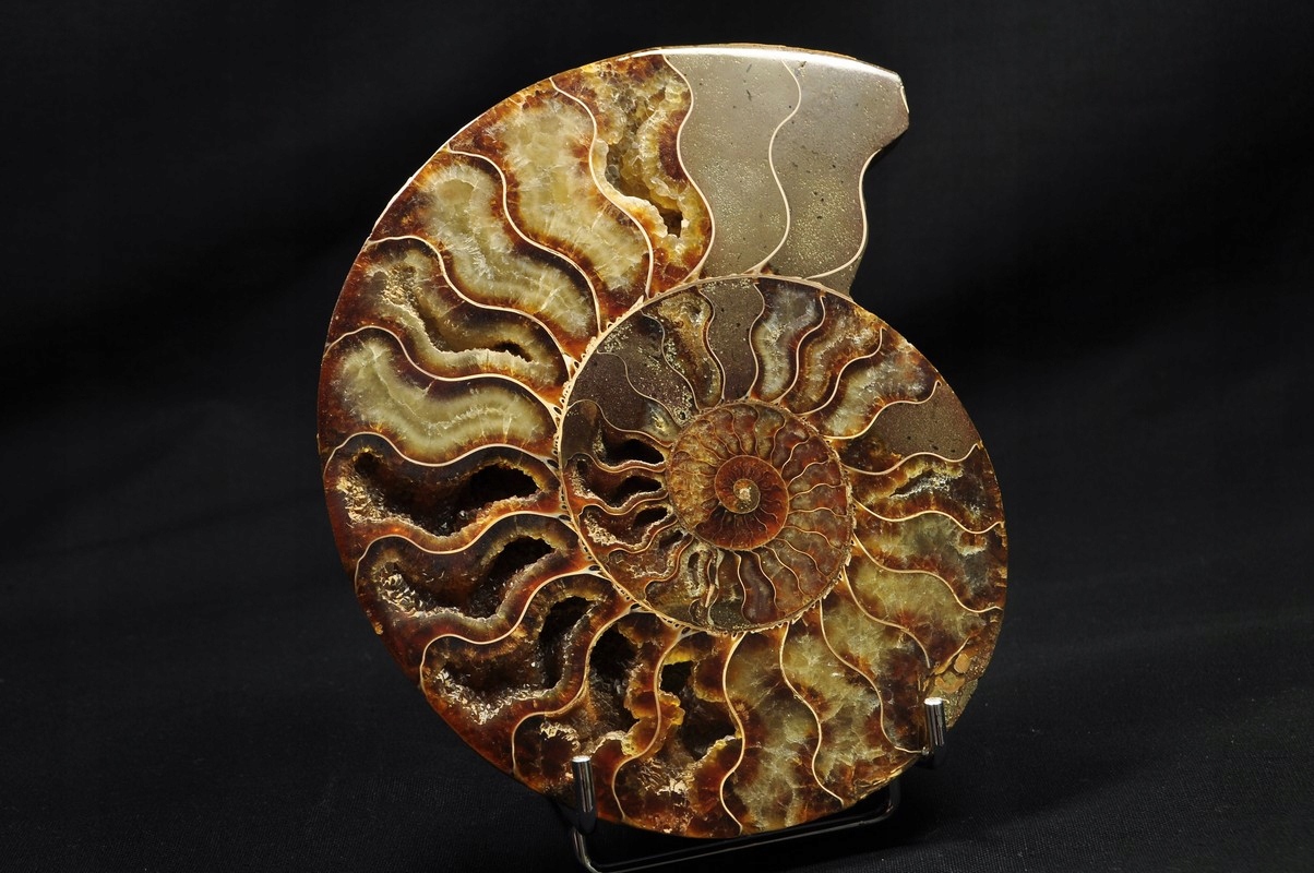 ПОЛОВИНА АМОНІТУ, ПРАЙДОВО ЗБЕРЕЖЕНИЙ ЗРАЗОК. СКАМЛІНОСТІ З МАДАГАСКАРУ, ДАТУВАНІ ПЕРІОДОМ НИЖНЬОГО КРАСЕТАГО. АМОНІТ МАЄ КАМЕРИ, ЯКІ ЗАПОВНЕНІ КАЛЬЦИТОМ, ДЕЯКІ З НИХ УТВОРИЛИ КАЛЬЦИТОВІ ЖЕОДИ. ВЕЛИКИЙ, УНІКАЛЬНИЙ ЗРАЗОК, ОБРІЗАНИЙ ТА ВІДПОЛІРОВАНИЙ.