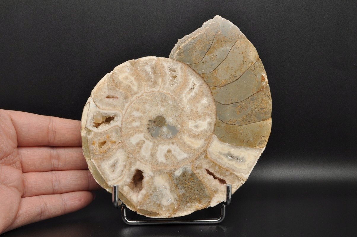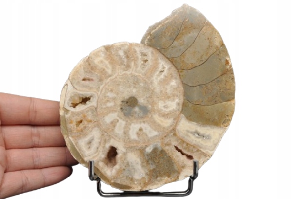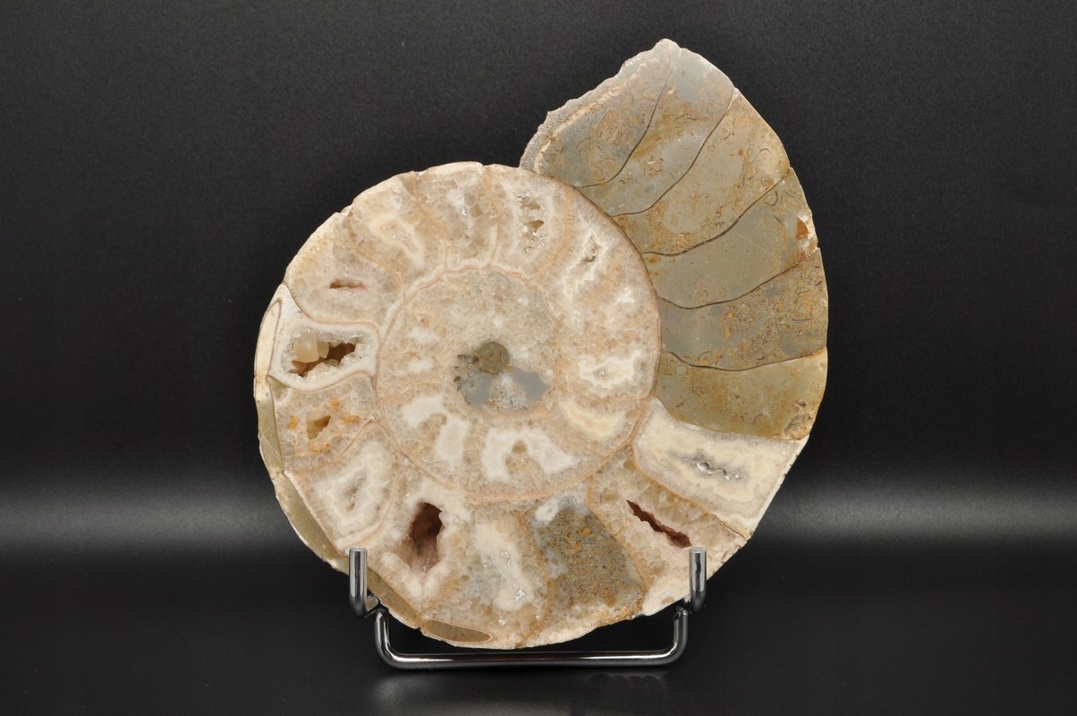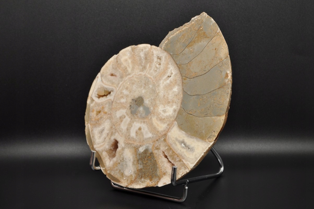 ПОЛОВИНА АМОНІТУ, ПРАЙДОВО ЗБЕРЕЖЕНИЙ ЗРАЗОК. ВИКОПАЛИВОСТІ З НІГЕРІЇ. АМОНІТ МАЄ КАМЕРИ, ЯКІ ЗАПОВНЕНІ КАЛЬЦИТОМ, ДЕЯКІ З НИХ УТВОРИЛИ КАЛЬЦИТОВІ ЖЕОДИ. ВЕЛИКИЙ, УНІКАЛЬНИЙ ЕКЗЕМПЛЯР, ОТРІБАНИЙ ТА ПОЛІРОВАНИЙ. РІДКІСНЕ МІСЦЕ.