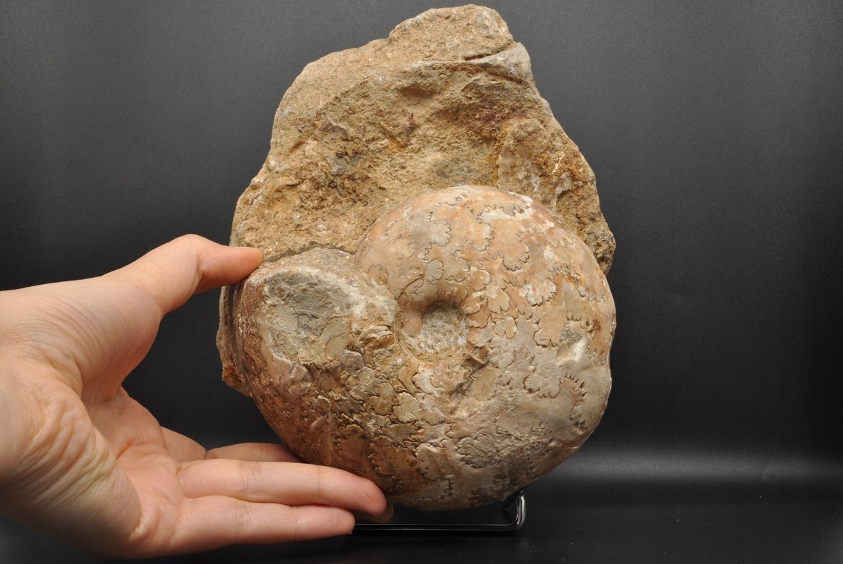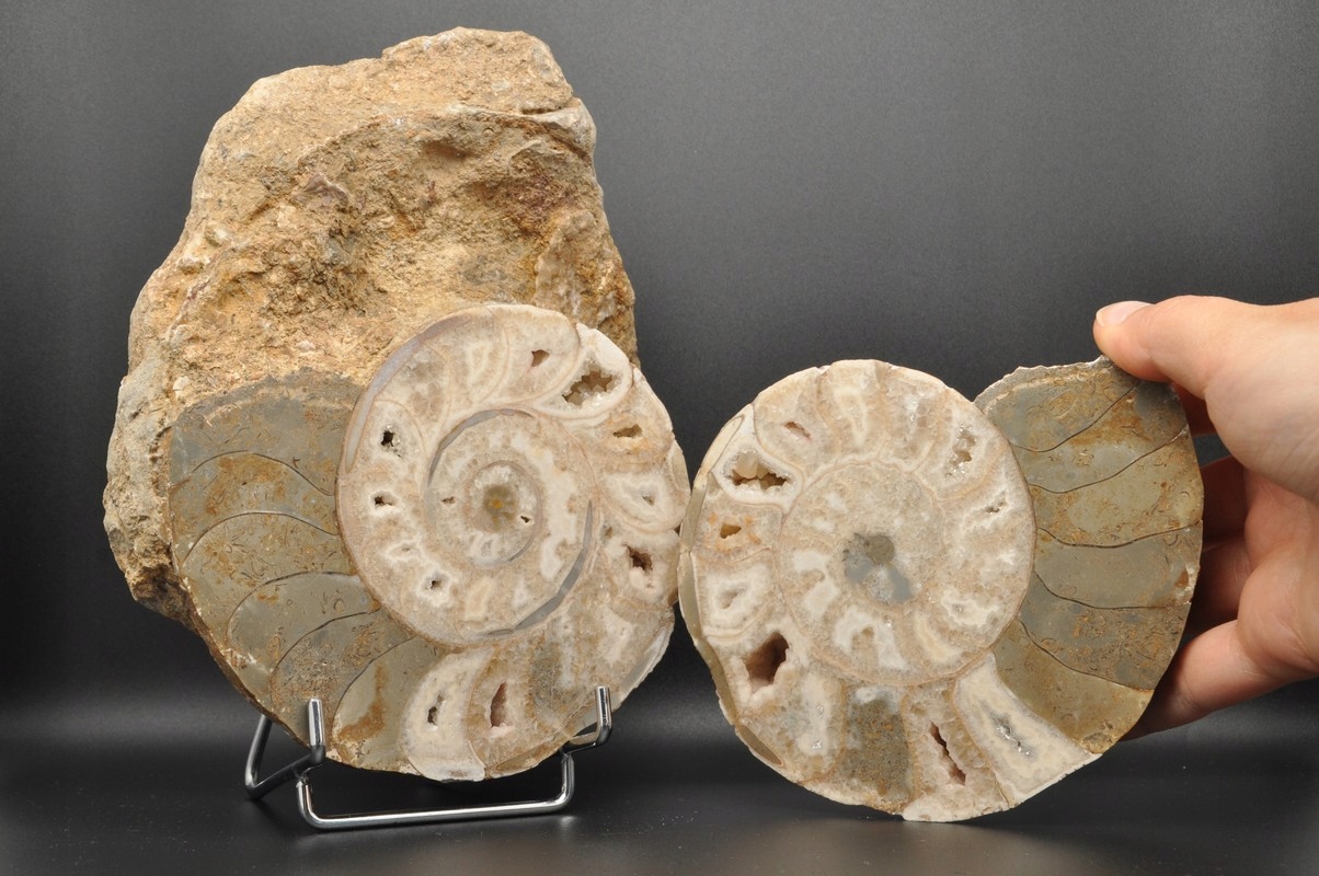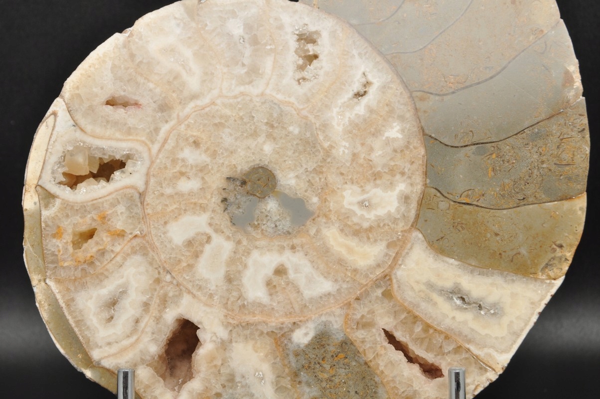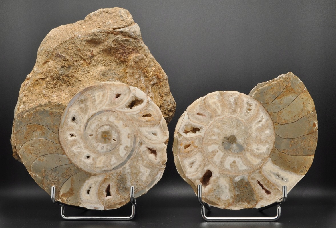 Амоніти, амоніти (Ammonoidea) - підклас вимерлих головоногих молюсків (Cephalopoda), зазвичай із симетричною, плоскоспіральною раковиною. Деякі типи мали незвичайні форми, наприклад, пряма раковина, вертикально закручена спіраль або спіраль з безконтактними витками. Вони зустрічаються в гірських породах морського походження, що датуються девонським періодом до кінця крейдяного періоду. Деякі з окремих камер відкриті та заповнені багатим асортиментом бежевих сірих і коричневих кристалів кальциту з перегородками між кожною камерою.