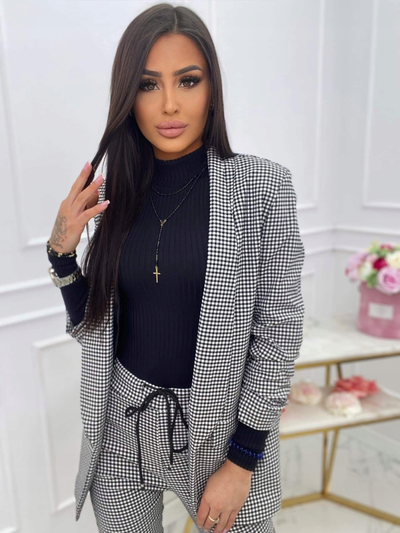 Костюмний комплект із візерунком у вигляді гусячих лапок або кліткою. Набір дуже смачний. Еластичний матеріал ідеально сидить по фігурі. Сигарили можна носити прямими або грайливо загорнутими на кінцях. Набір ідеально підходить для великих випадків або на кожен день. Типовий розмір.