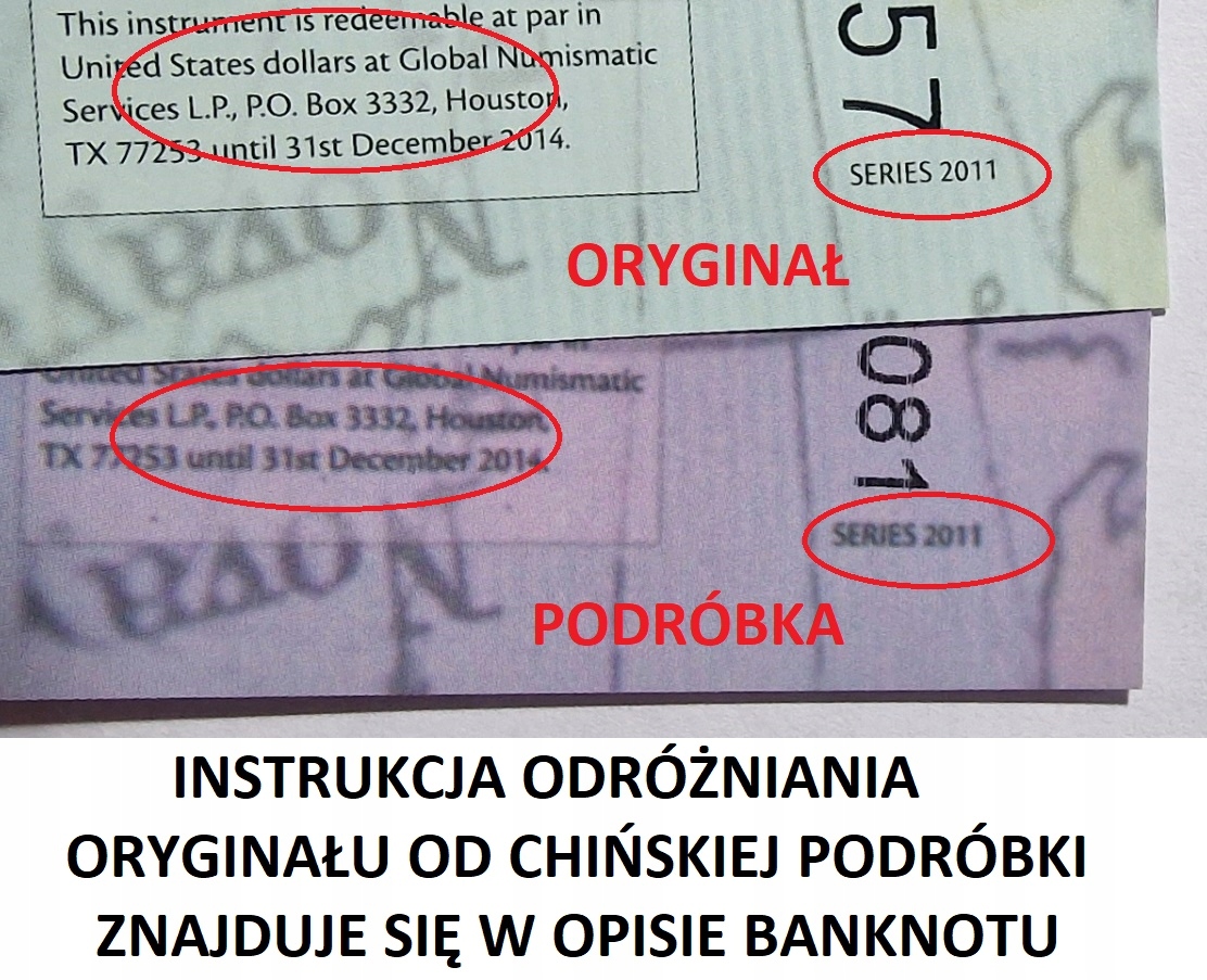 Усі мікролеса на оригінальних банкнотах ідеально гостро і розбірливі (векторний друк). Мікроди на кожній підробці будуть помітно розмиті/розмиті (растровий друк). Якщо ви знайдете цю банкноту за значно нижчою ціною, завжди попросіть продавця прозору фотографію верхнього правого кута. Тривалий час понад 80% арктичних банкнот у продажу - також на Allegro - - це якісні копії/репродукції. Ви можете їх легко відрізнити від оригіналу, використовуючи вищевказані інструкції - див. Тільки якість мікро -ди (колір фону, форма числа та голограма не має значення - банкноти знайдені у багатьох різновидах). Оригінальні банкноти 1, 2 і 15 доларів не мають типової двохвильової інтерференінової голограми!