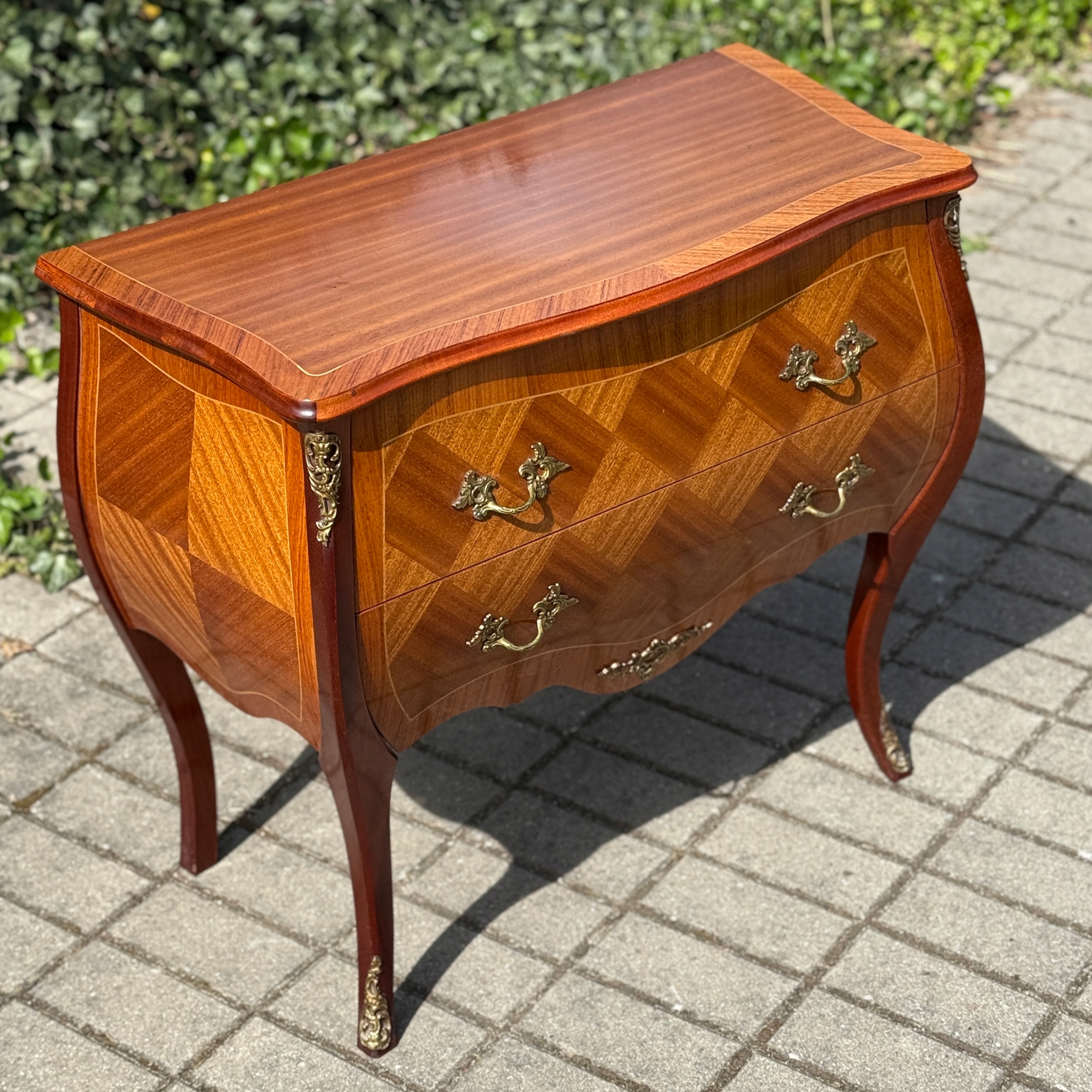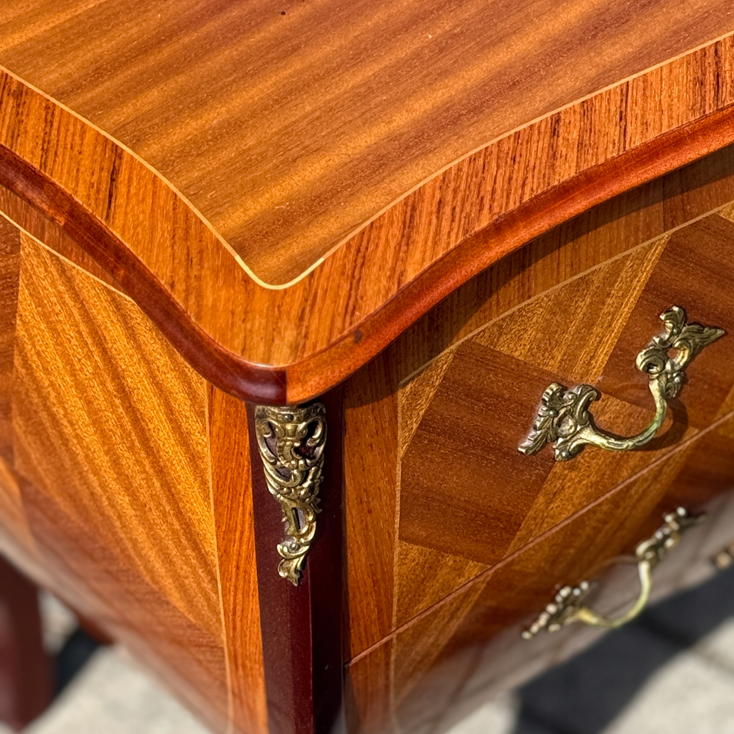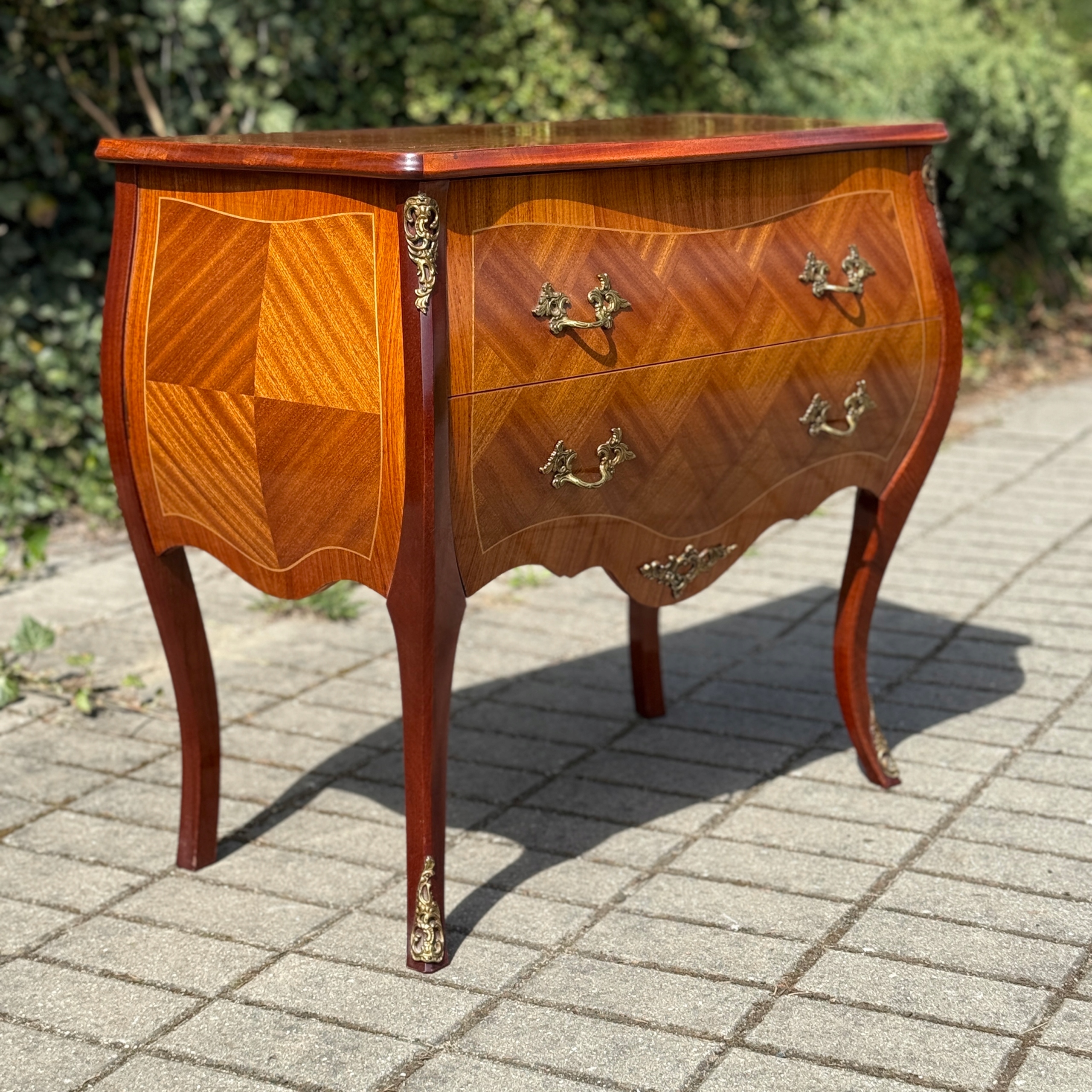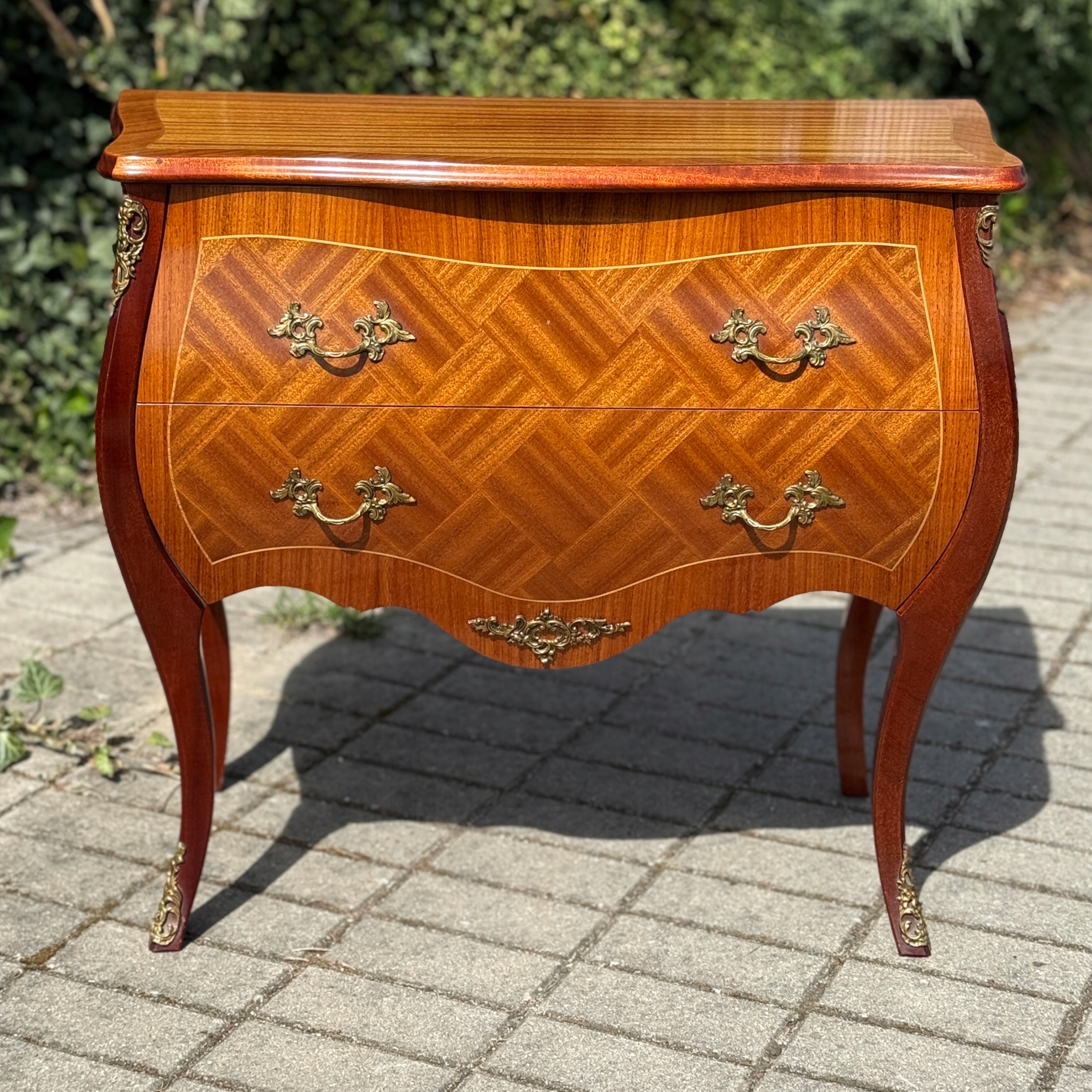 Ми представляємо унікальний комод у стилі Людвіка, який вражає його дизайн та вишуканість. Характерна форма бочки, інкрустовані сторони, фронти та стільниця роблять цей предмет меблів прикрасою будь -якого елегантного інтер'єру.