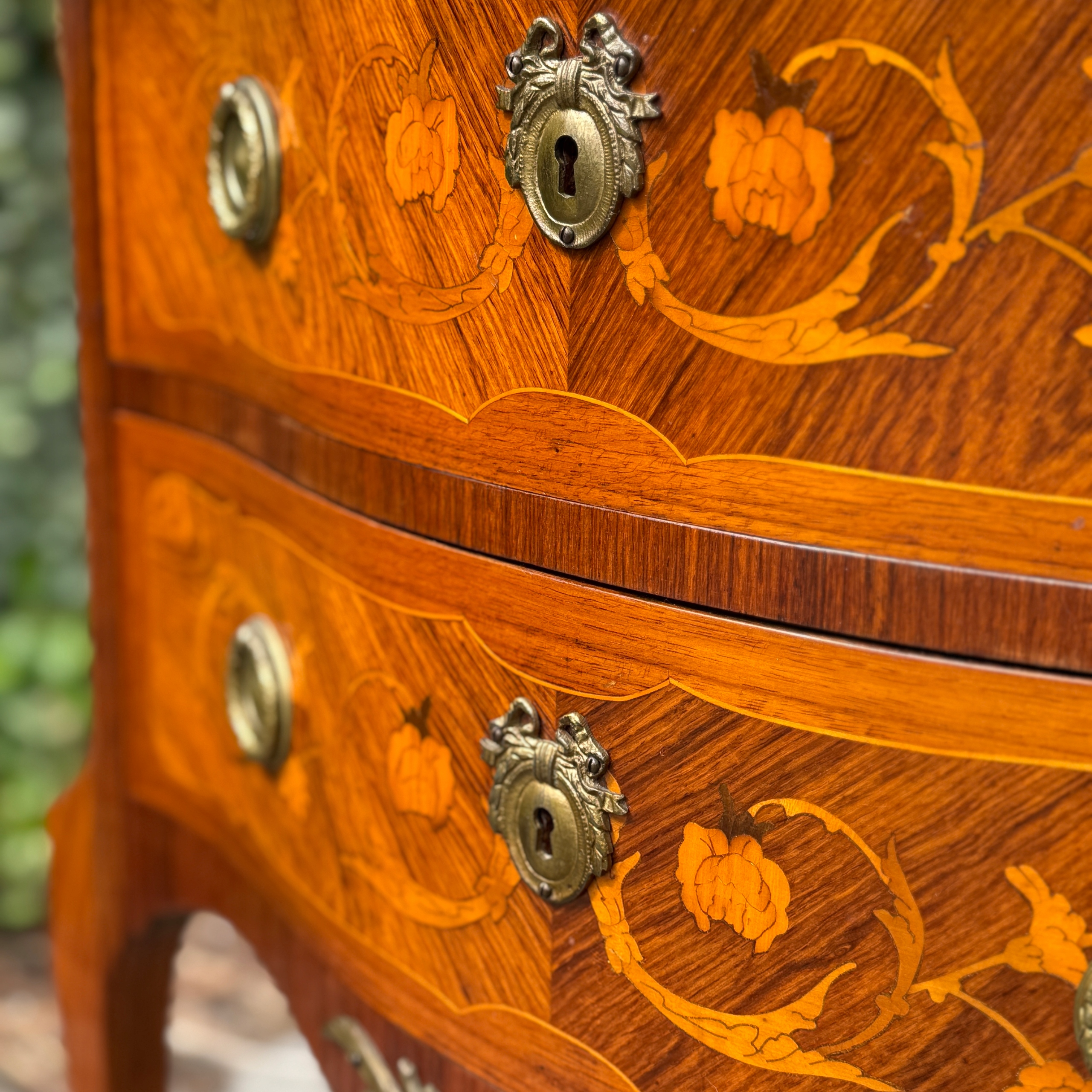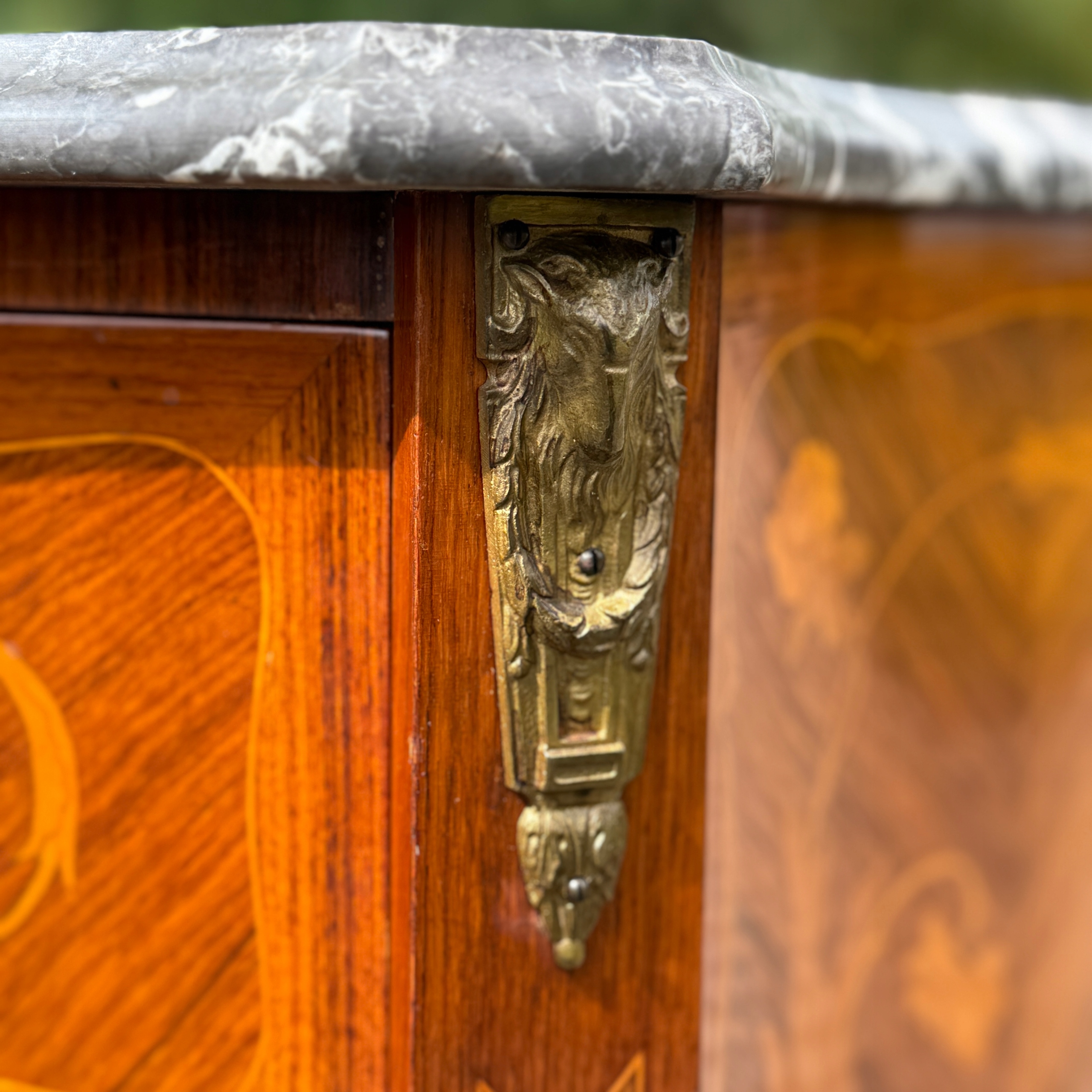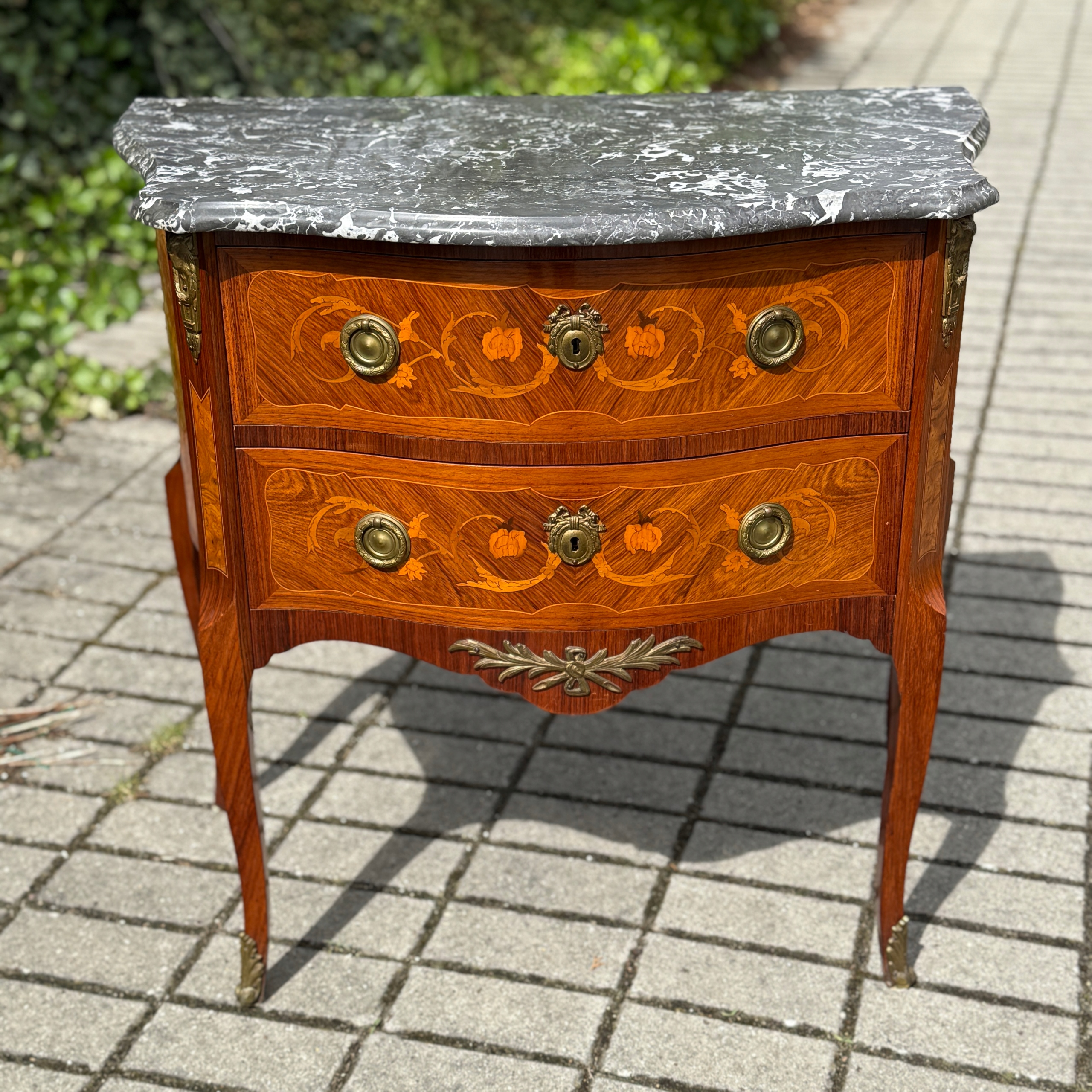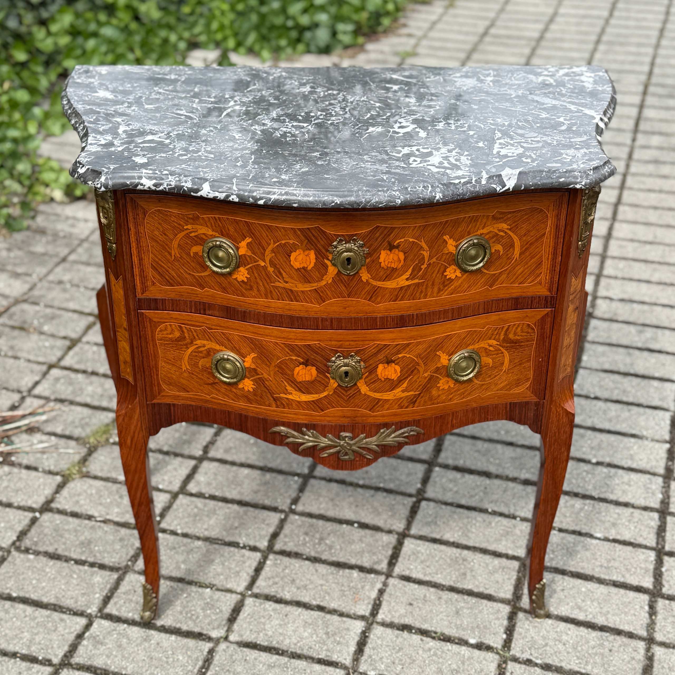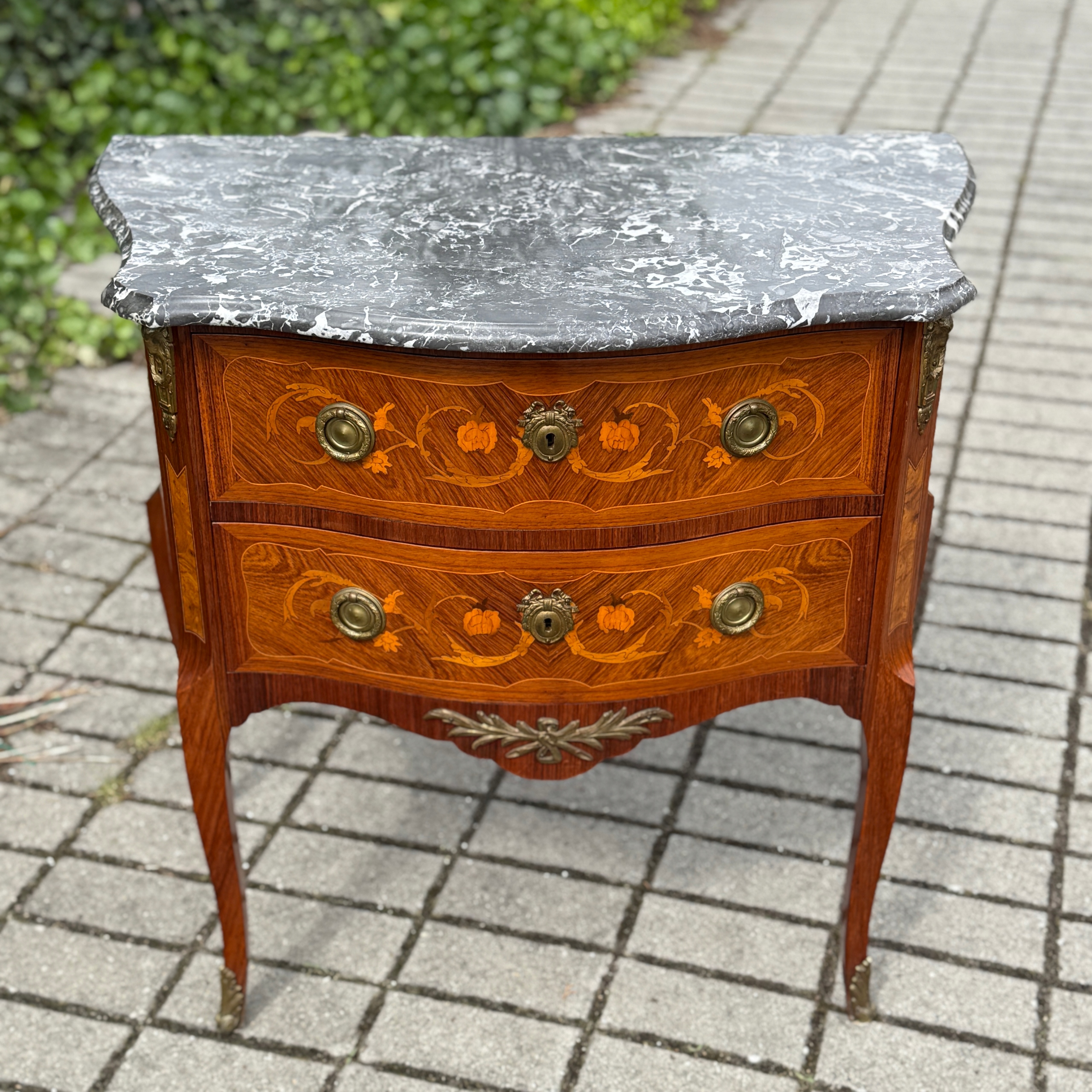Відкрийте унікальний простий класичний комод Людвік з мармуровим верхом, з другої половини 20 століття. Цей елегантний комод вражає своєю простою формою, підтримуваною чотирма тонкими, загостреними ногами, закінчуючи латунною фурнітурою. Два об'ємні ящики забезпечують практичний простір для зберігання, а інкрустатор, що прикрасить передню та сторони, додає меблів унікальну принадність.