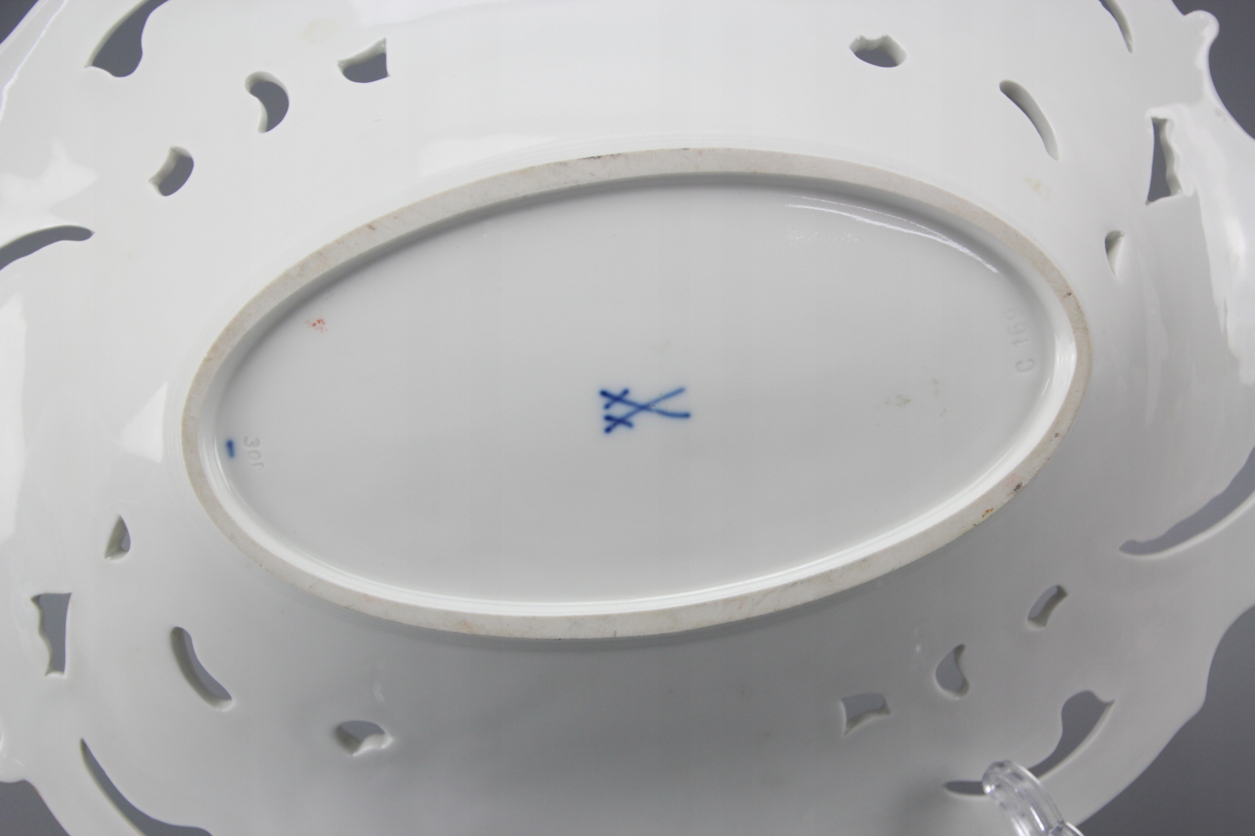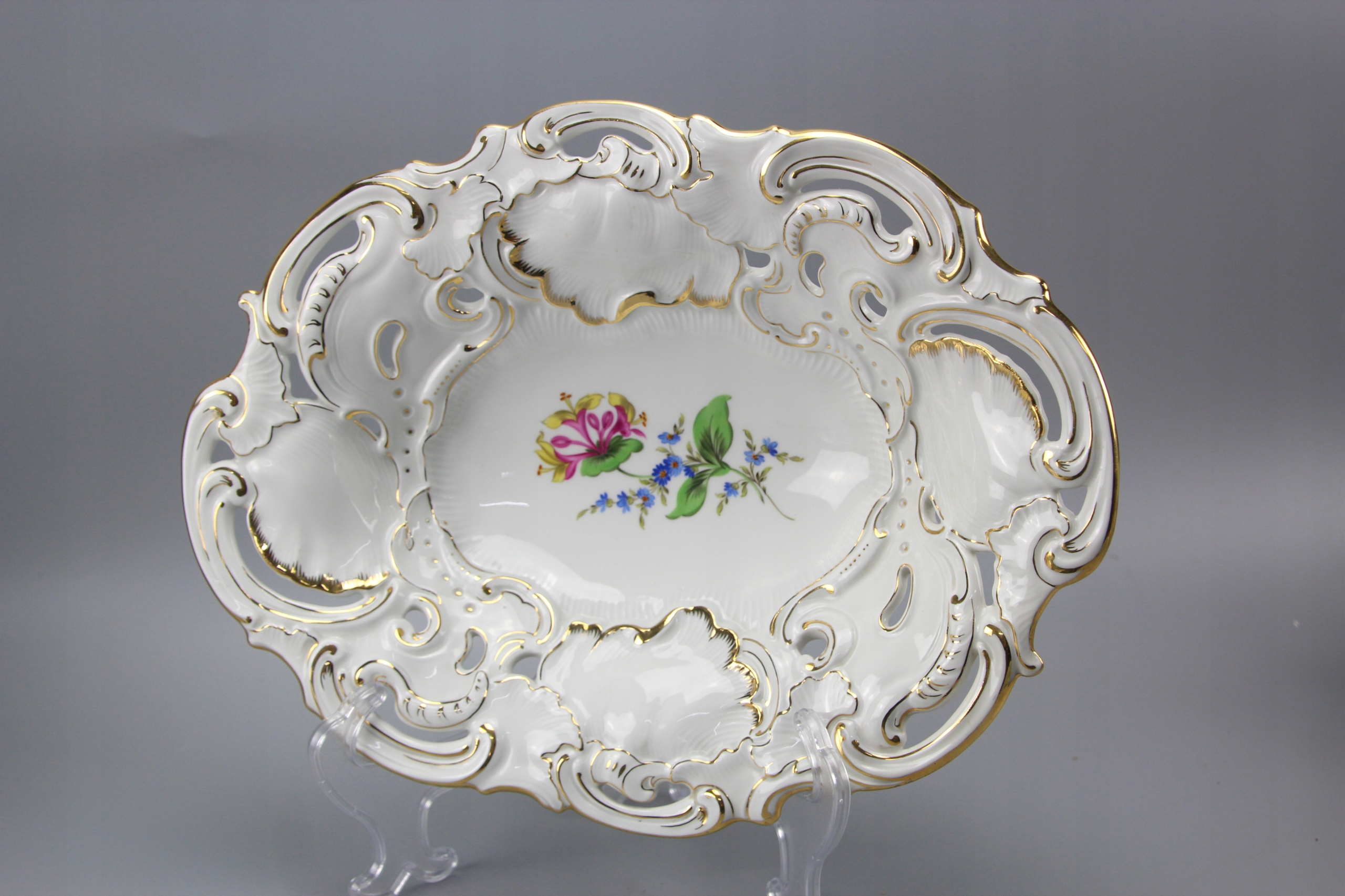 Овальна тарілка з ажурним коміром, прикрашена квітковим мотивом;