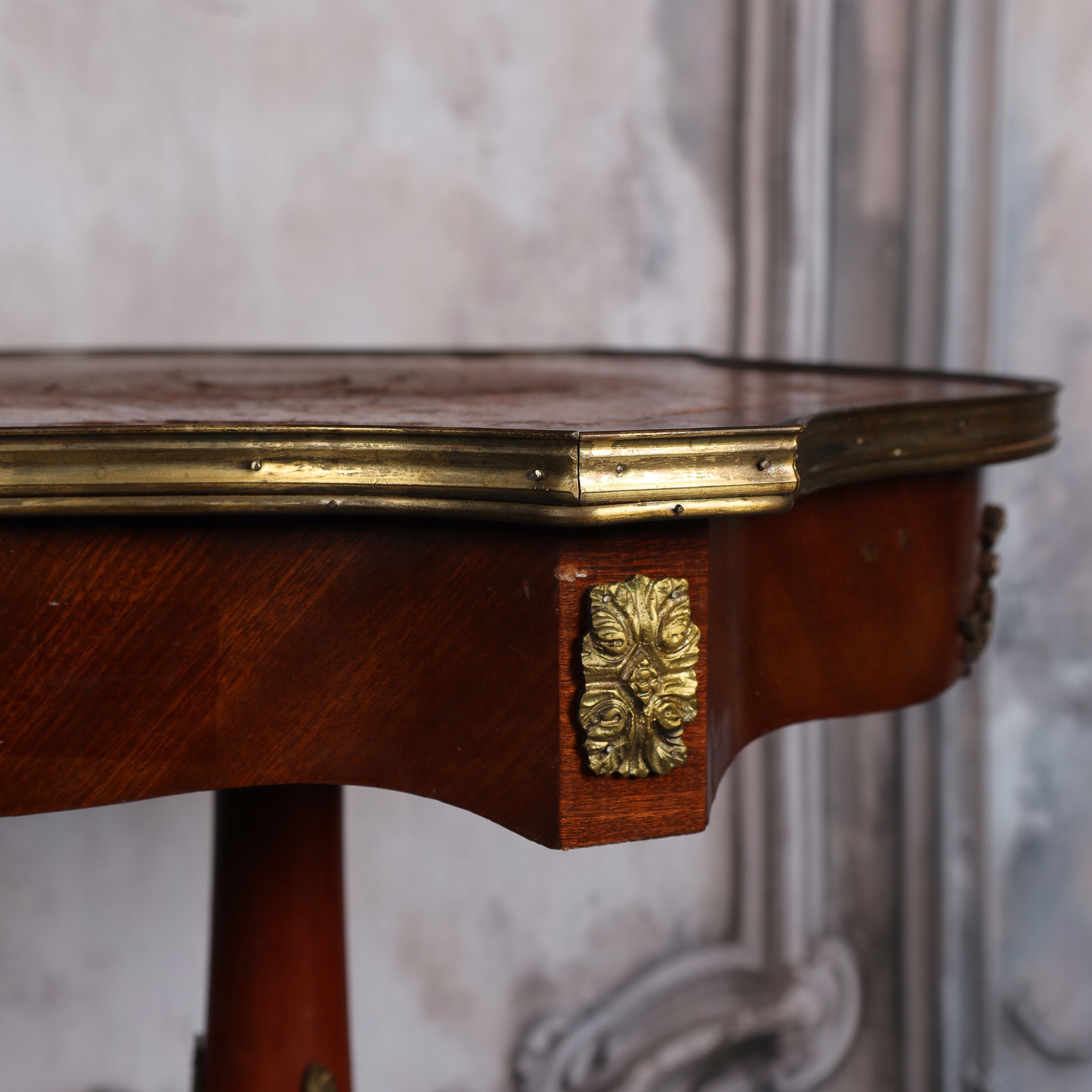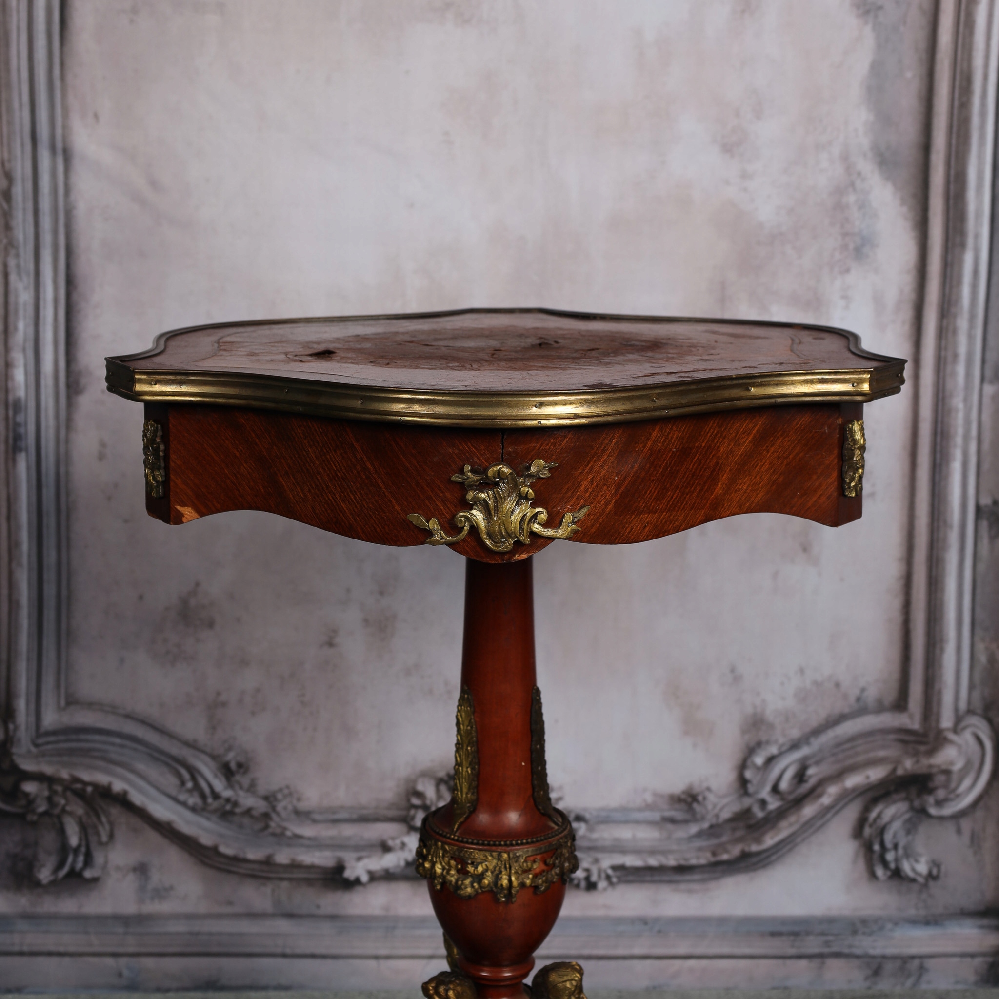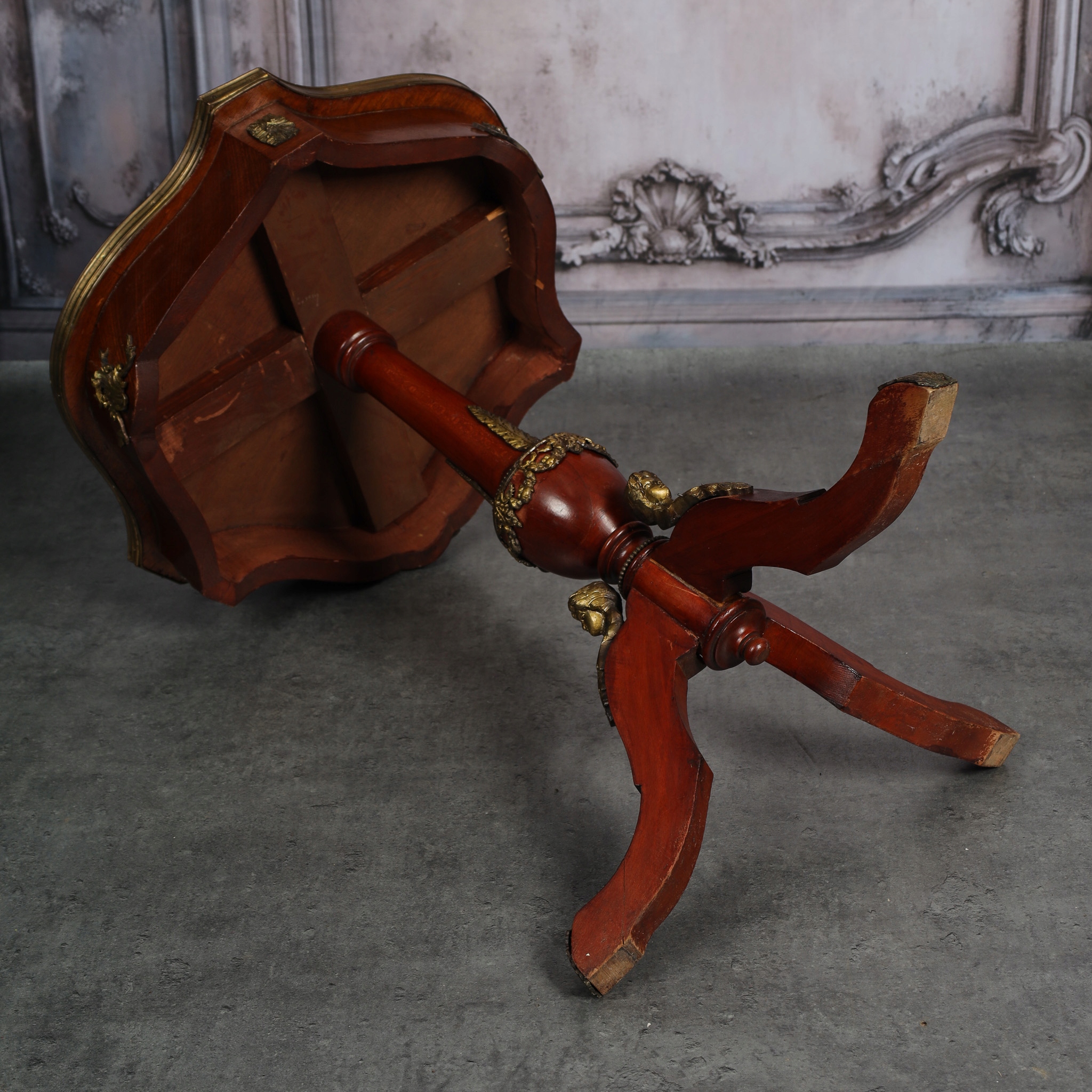 - Стиль: Стіл поєднує в собі риси пізнього бароко, рококо (форма верху) та раннього ампіру (центральна ніжка, прикраси). Датується 19-м століттям.