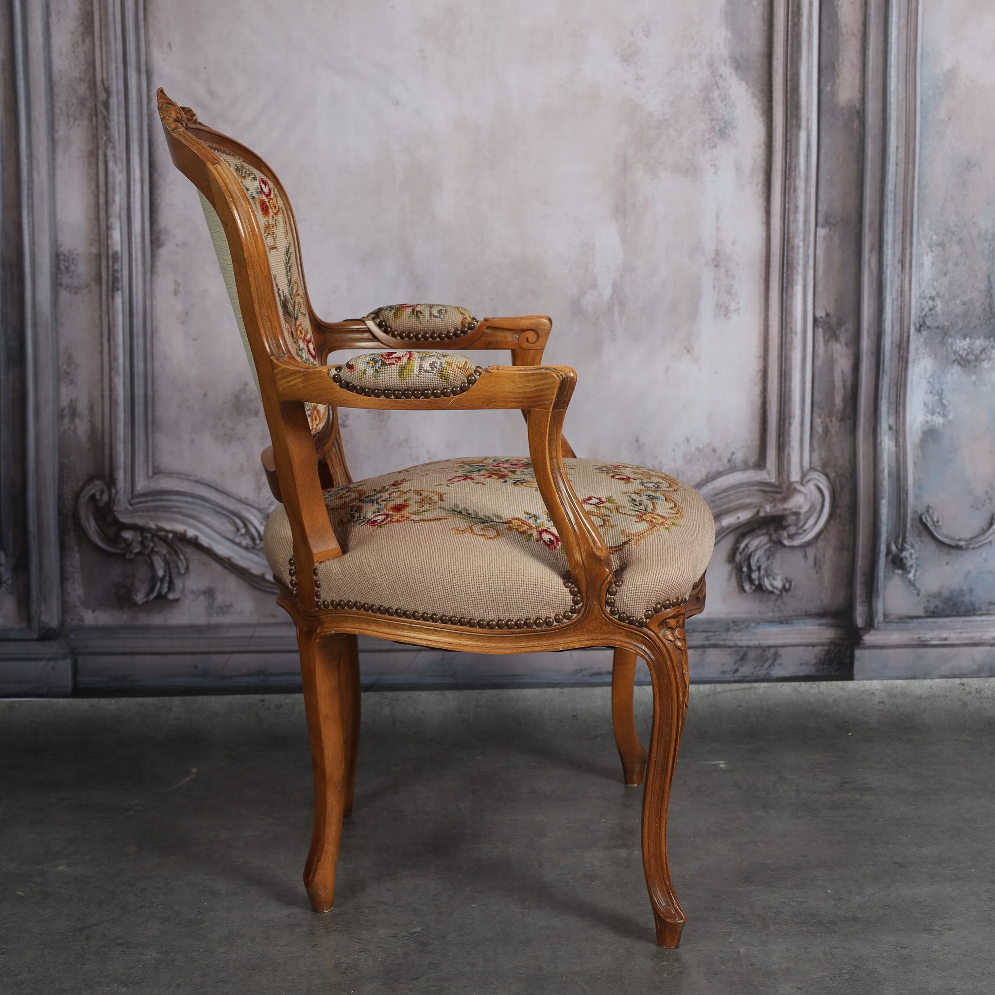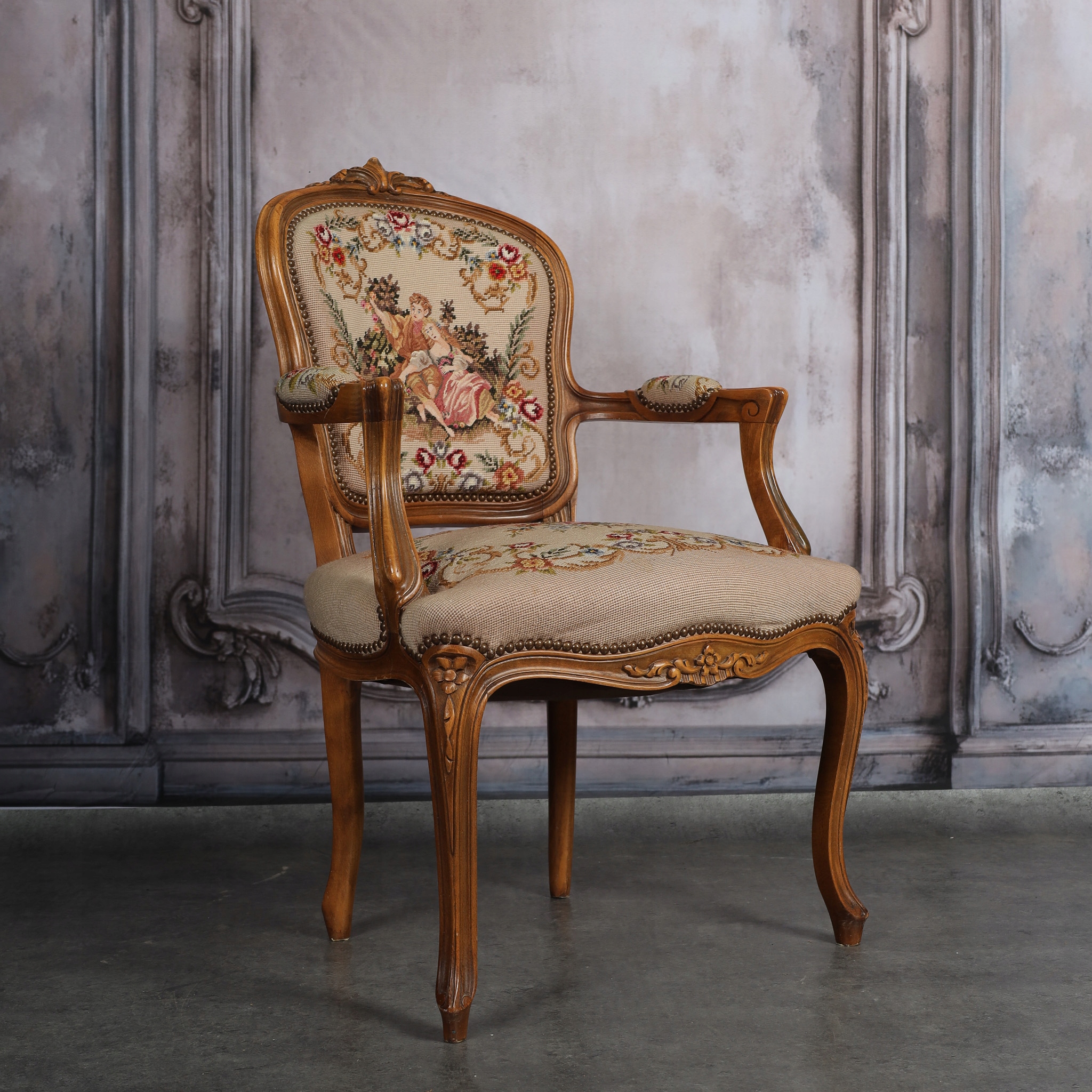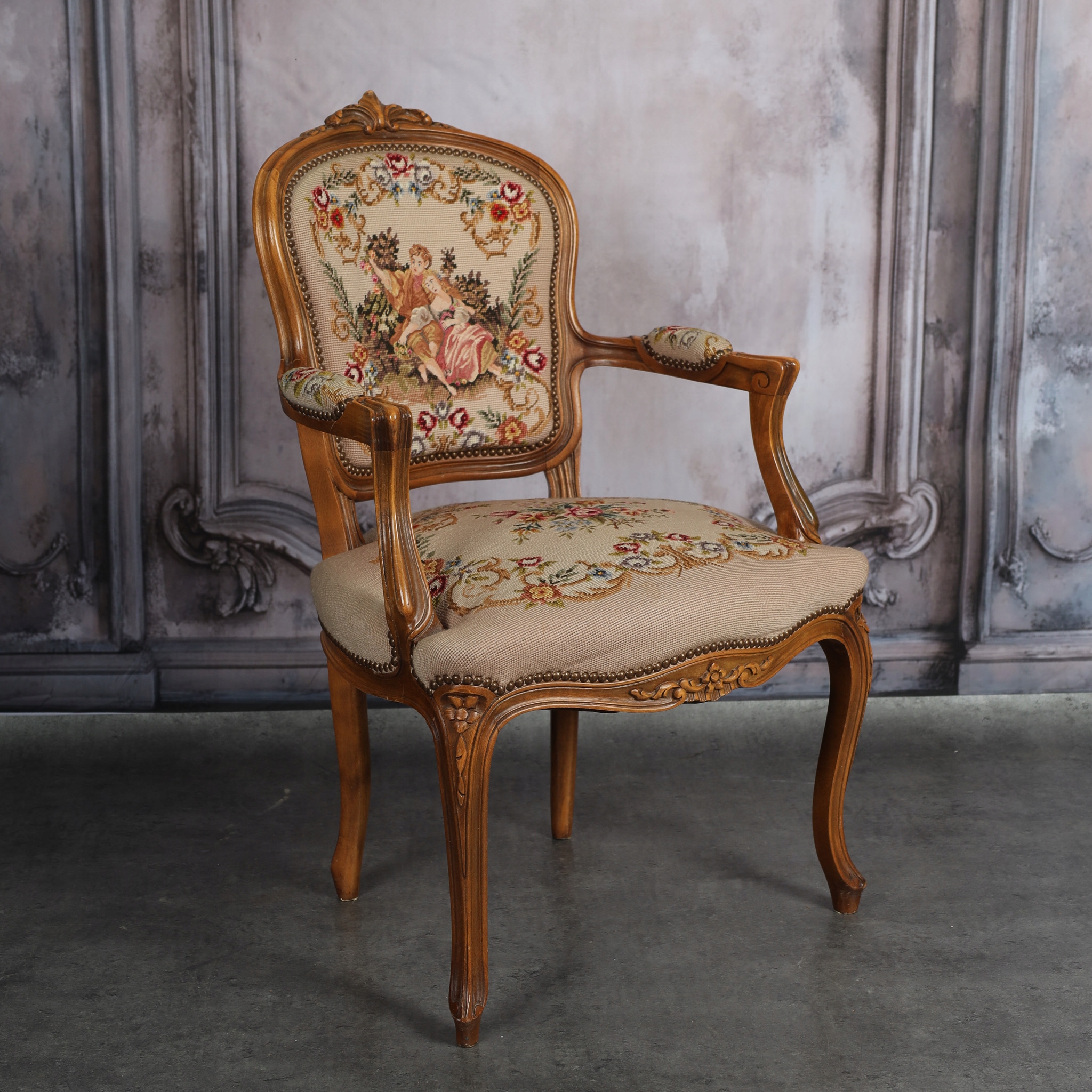 Пориньте у виняткову елегантність і комфорт із нашим представницьким кріслом Ludwik. Це ідеальний предмет меблів для тих, хто цінує класичний стиль і високий комфорт. Крісло має красивий різьблений дерев’яний каркас і високоякісну гобеленову оббивку з мотивом романтичної жанрової сцени, що додає елегантності та характеру.