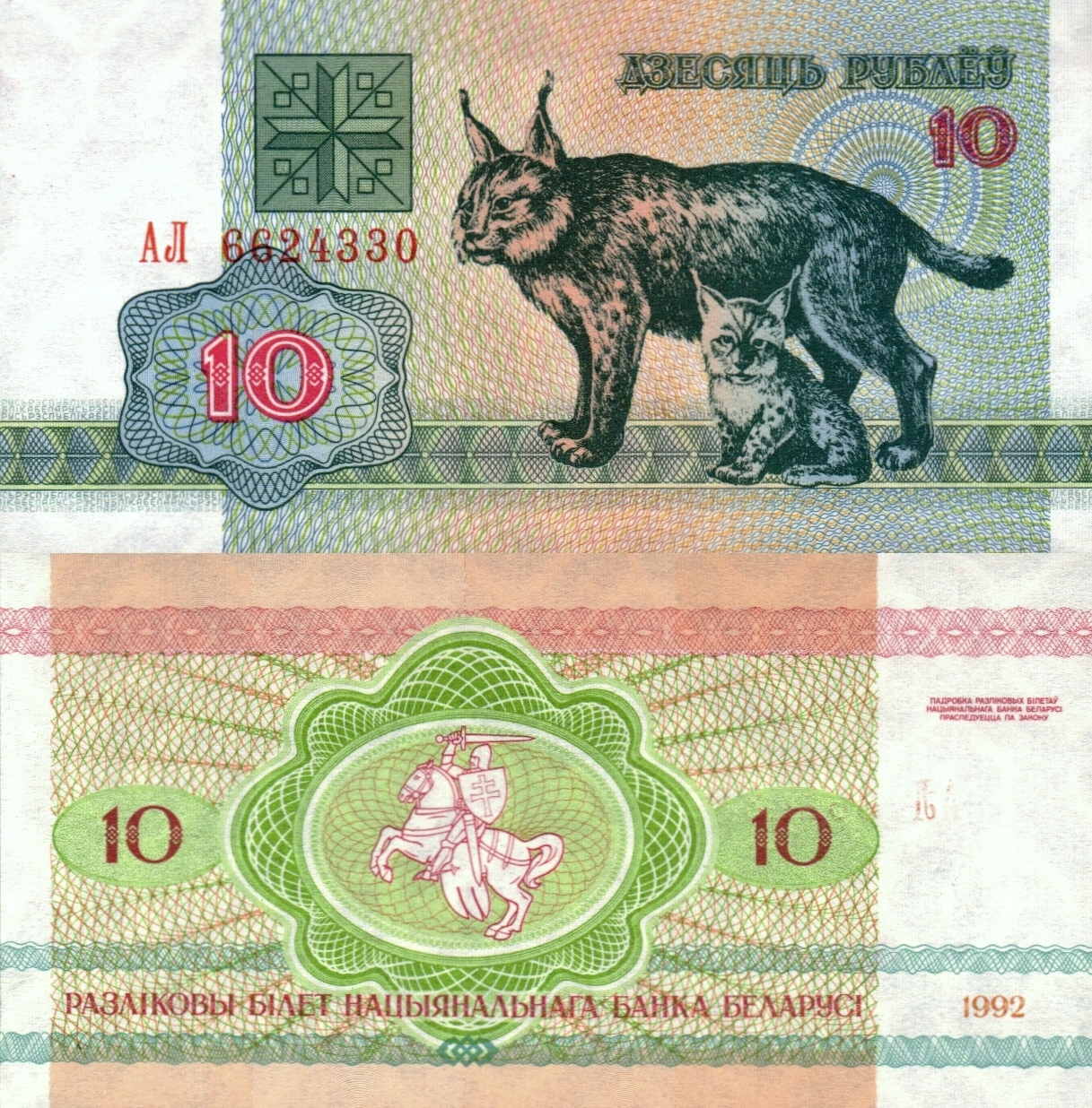# BIAŁORUŚ - 10 RUBLI - 1992 - P-5 - UNC Rysie