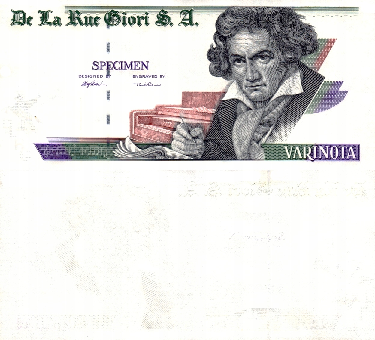 - Примітки: офіційно тестова банкнота Друкарня De La Rue представляє можливості друку та захисту банкнот. Одностороння банкнота, різновид темно-зеленого кольору