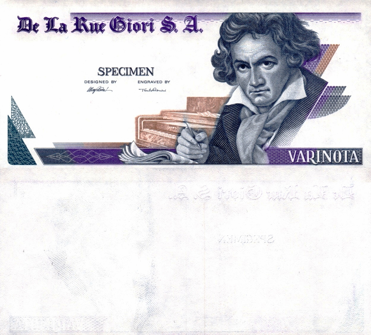 - Примітки: офіційно тестова банкнота Друкарня De La Rue представляє можливості друку та захисту банкнот. Одностороння банкнота, різновид фіолетового кольору