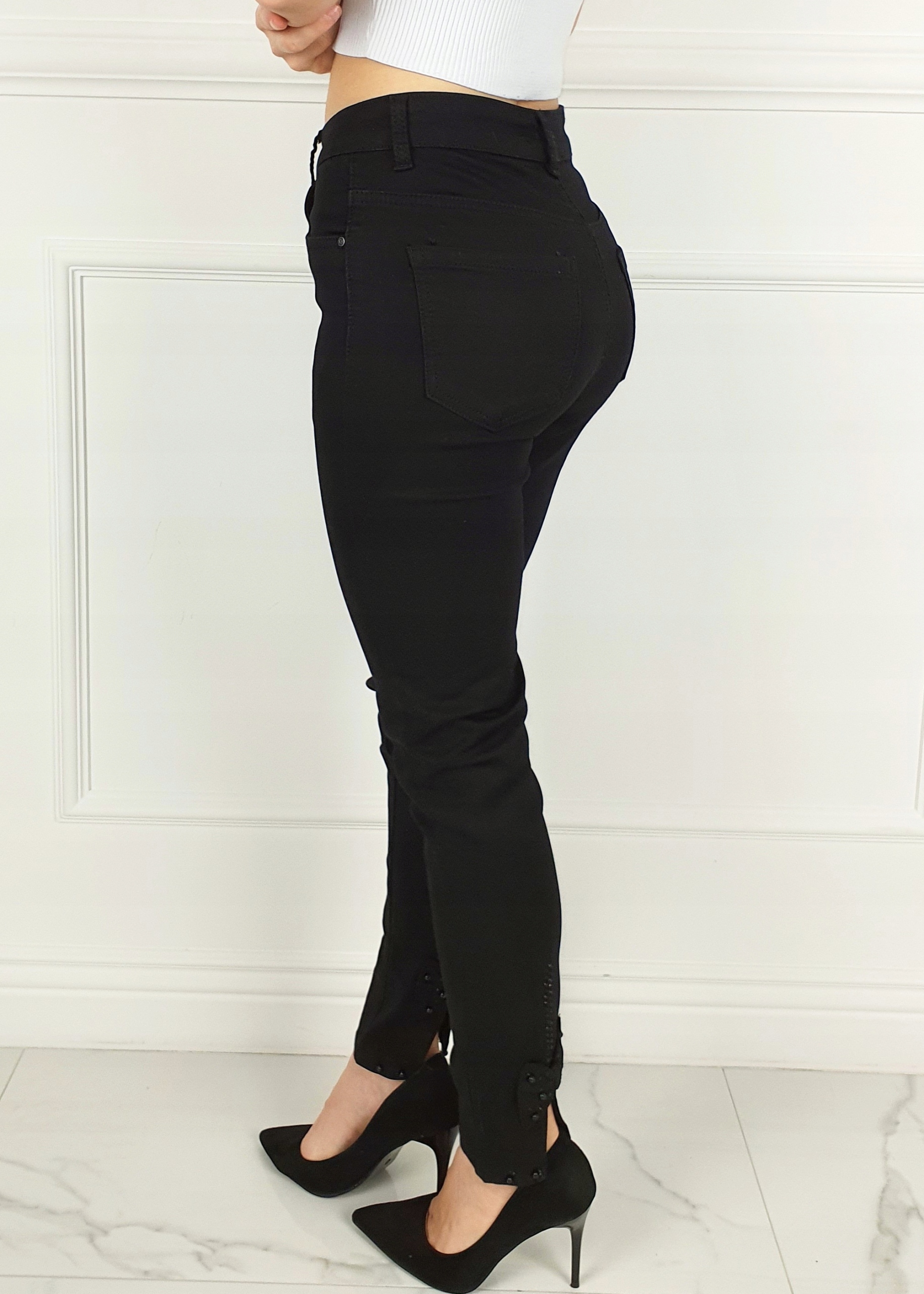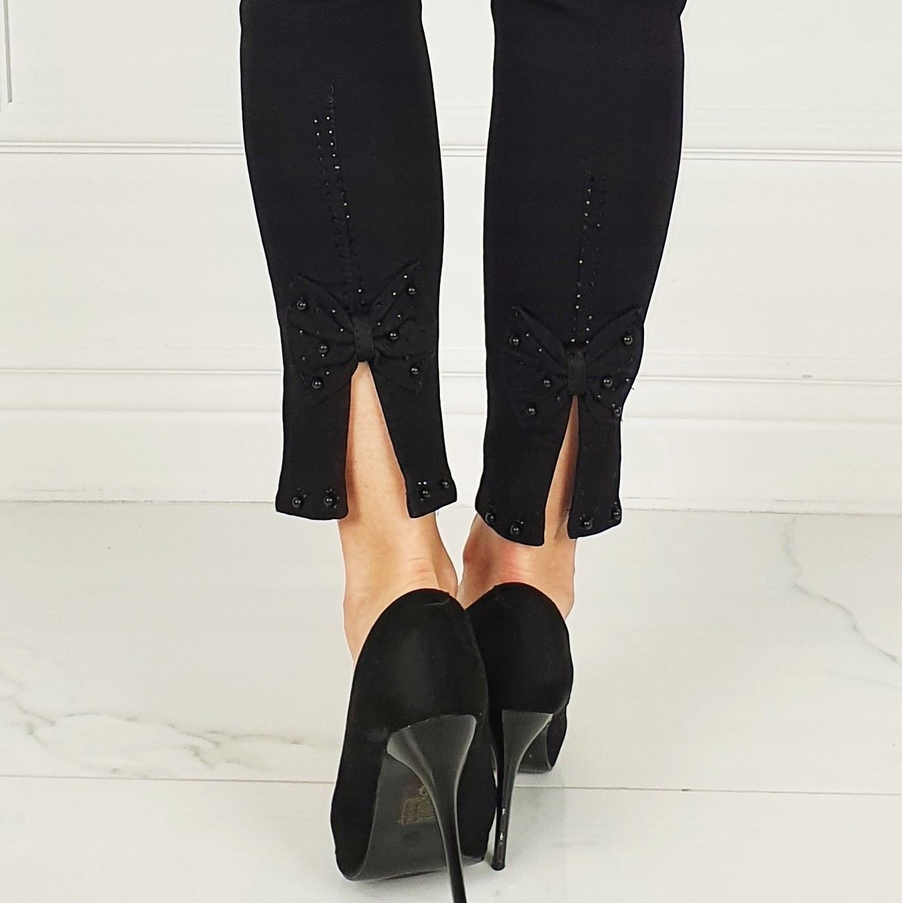 Чорні штани з декоративним бантом на штанинах . Зручні та ніжні, можна носити з високими підборами або спортивним взуттям. Виготовлений з якісного матеріалу. Вони чудово сидять і чудово виглядають. Підкресліть свої жіночі форми! Зробіть свій повсякденний образ унікальним. Штани мають кишені з обох боків.