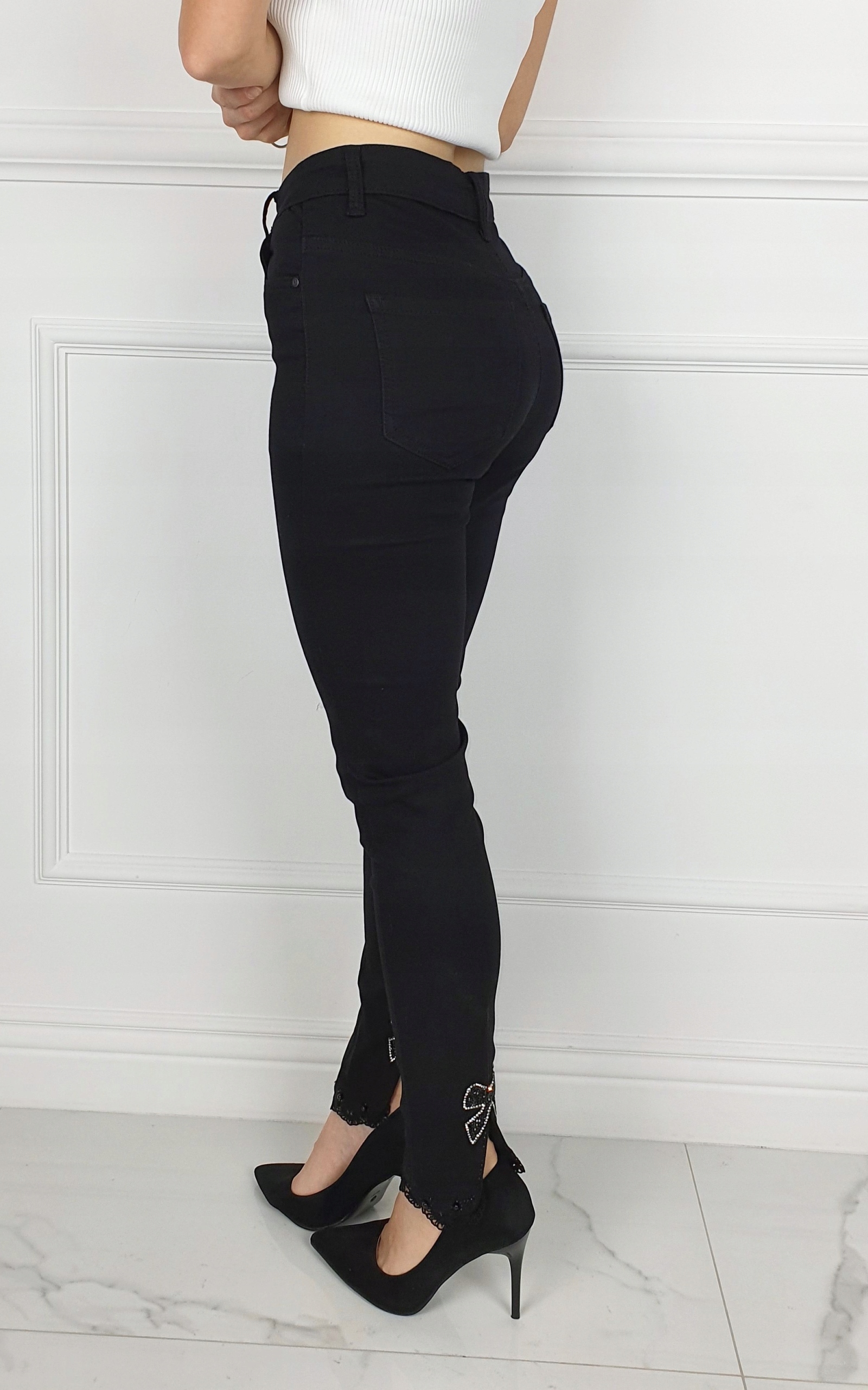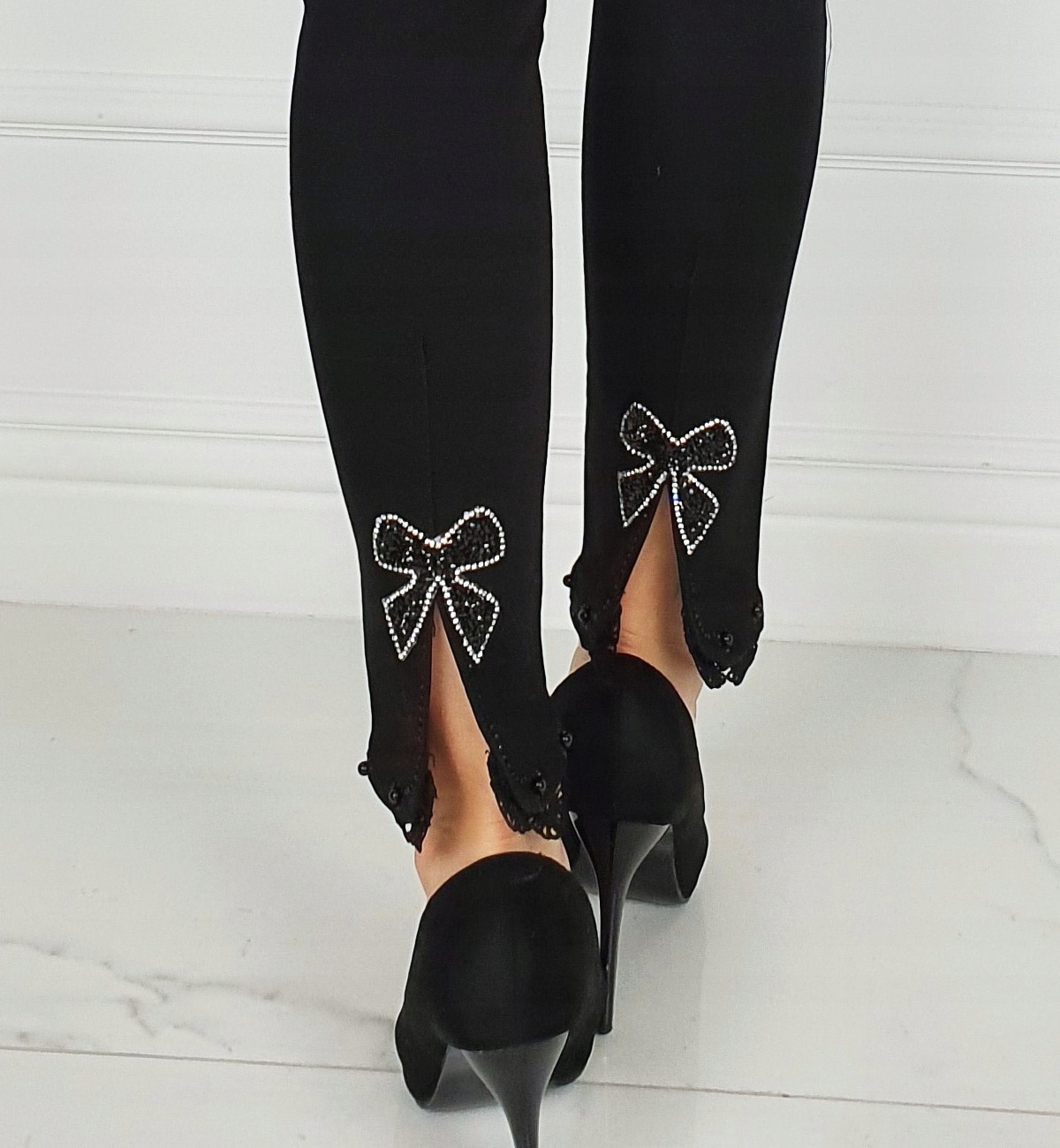 Чорні штани з декоративним бантом на штанинах . Зручні та ніжні, можна носити з високими підборами або спортивним взуттям. Виготовлений з якісного матеріалу. Вони чудово сидять і чудово виглядають. Підкресліть свої жіночі форми! Зробіть свій повсякденний образ унікальним. Штани мають кишені з обох боків.