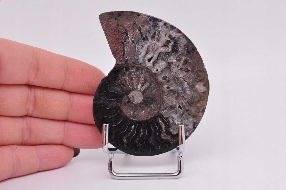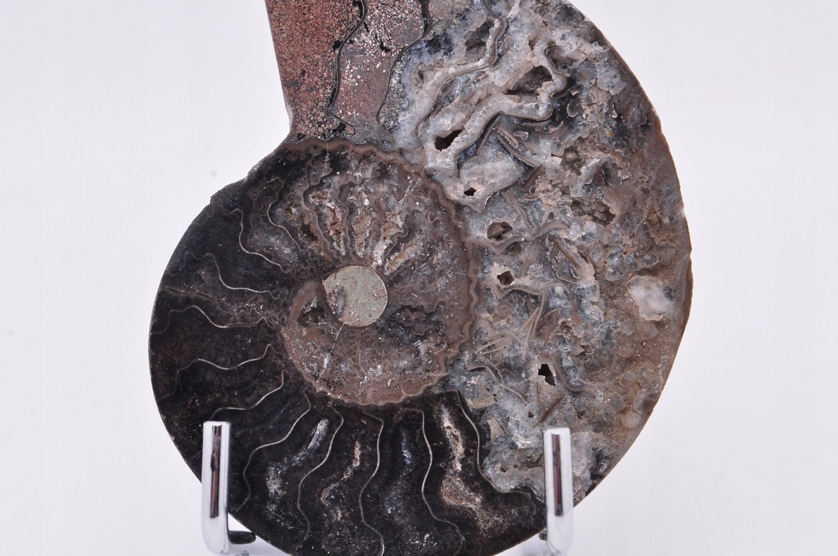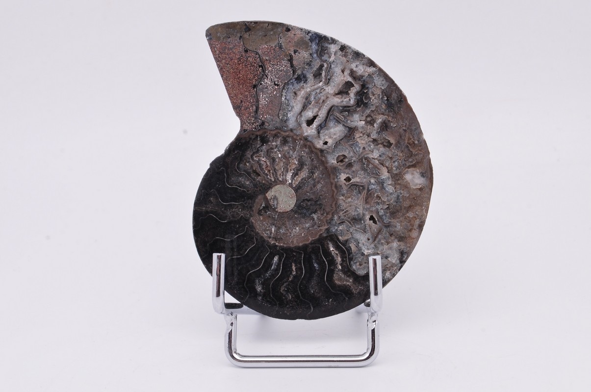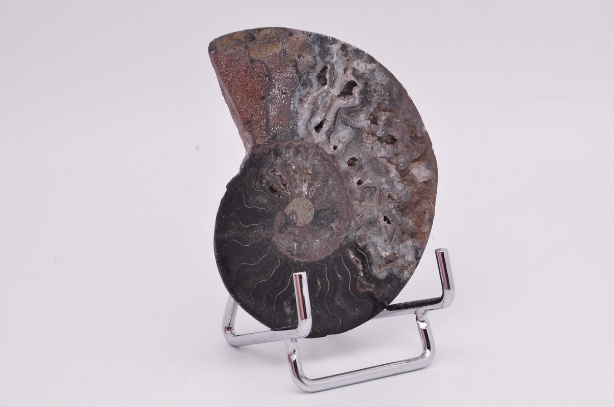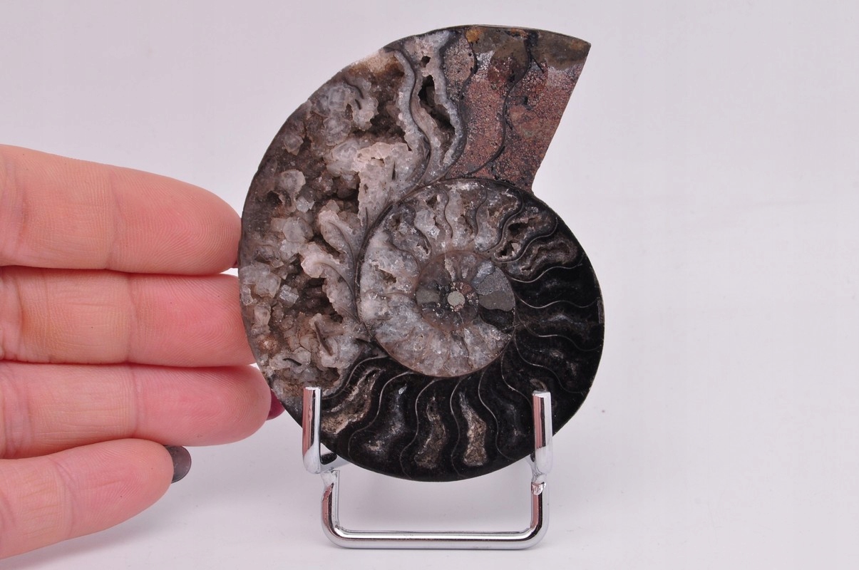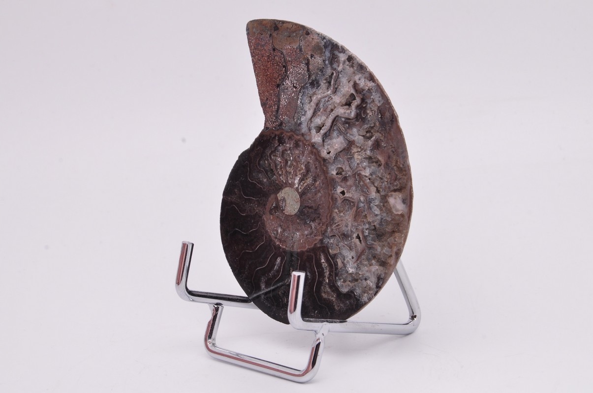 Амоніти, амоніти (Ammonoidea) - підклас вимерлих головоногих молюсків (Cephalopoda), зазвичай із симетричною, плоскоспіральною раковиною. Кілька видів мали незвичайні форми, напр. пряма оболонка, вертикально закручена спіраль або спіраль з не дотичними витками. Вони зустрічаються в гірських породах морського походження, що датуються девонським періодом до кінця крейдяного періоду. Деякі з окремих камер відкриті та заповнені багатим асортиментом бежевих сірих і коричневих кристалів кальциту з перегородками між кожною камерою.