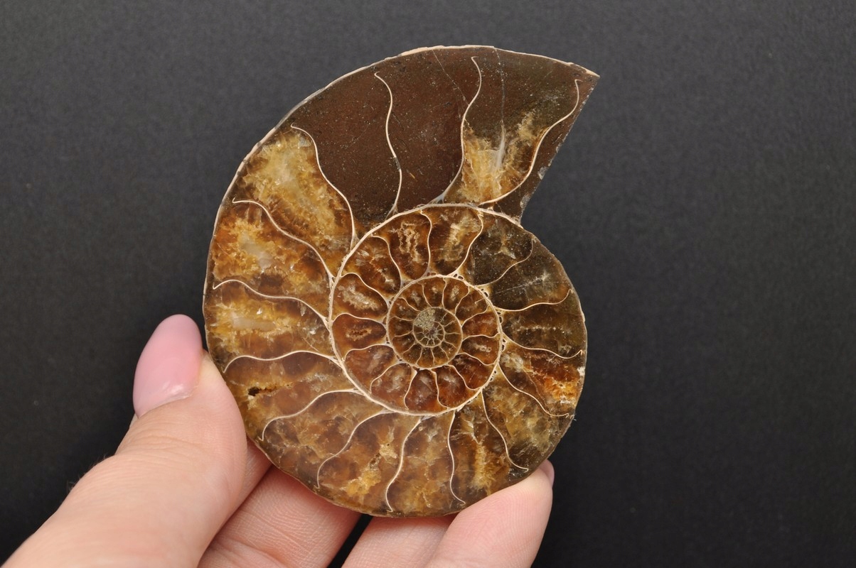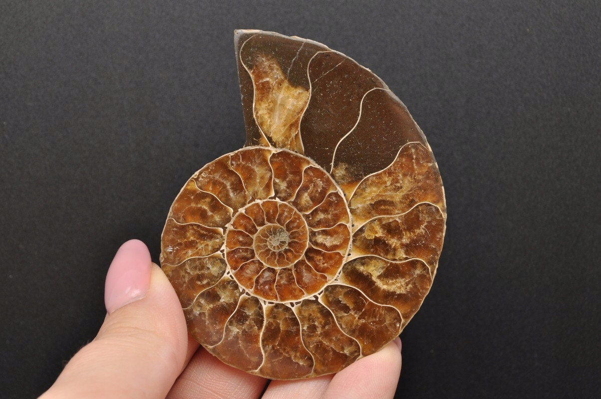 Амоніти, амоніти (Ammonoidea) - підклас вимерлих головоногих молюсків (Cephalopoda), зазвичай із симетричною, плоскоспіральною раковиною. Деякі типи мали незвичайні форми, наприклад, пряма раковина, вертикально закручена спіраль або спіраль з безконтактними витками. Вони зустрічаються в гірських породах морського походження, що датуються девонським періодом до кінця крейдяного періоду. Деякі з окремих камер відкриті та заповнені багатим набором сіро-бежевих і коричневих кристалів кальциту з перегородками між камерами.