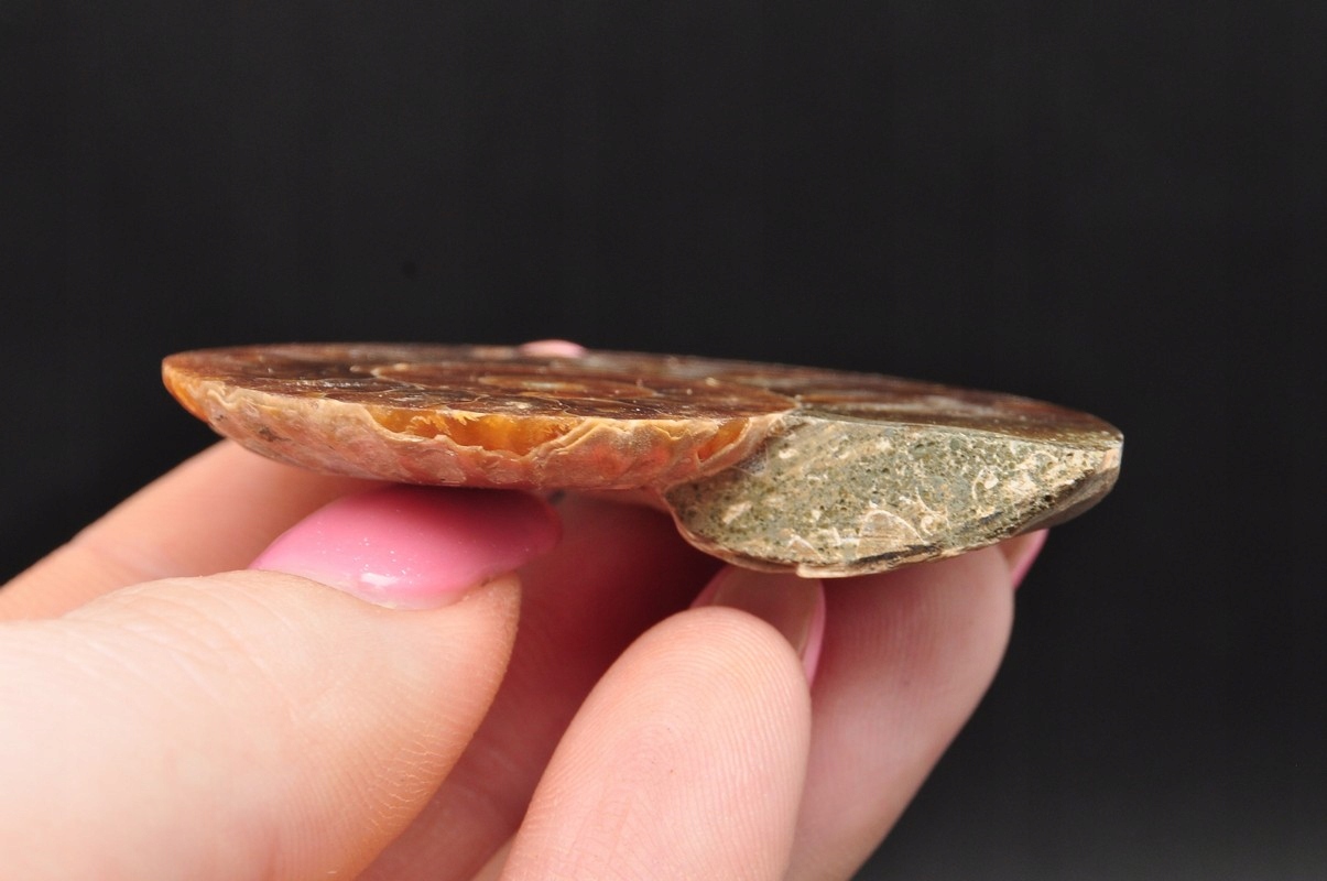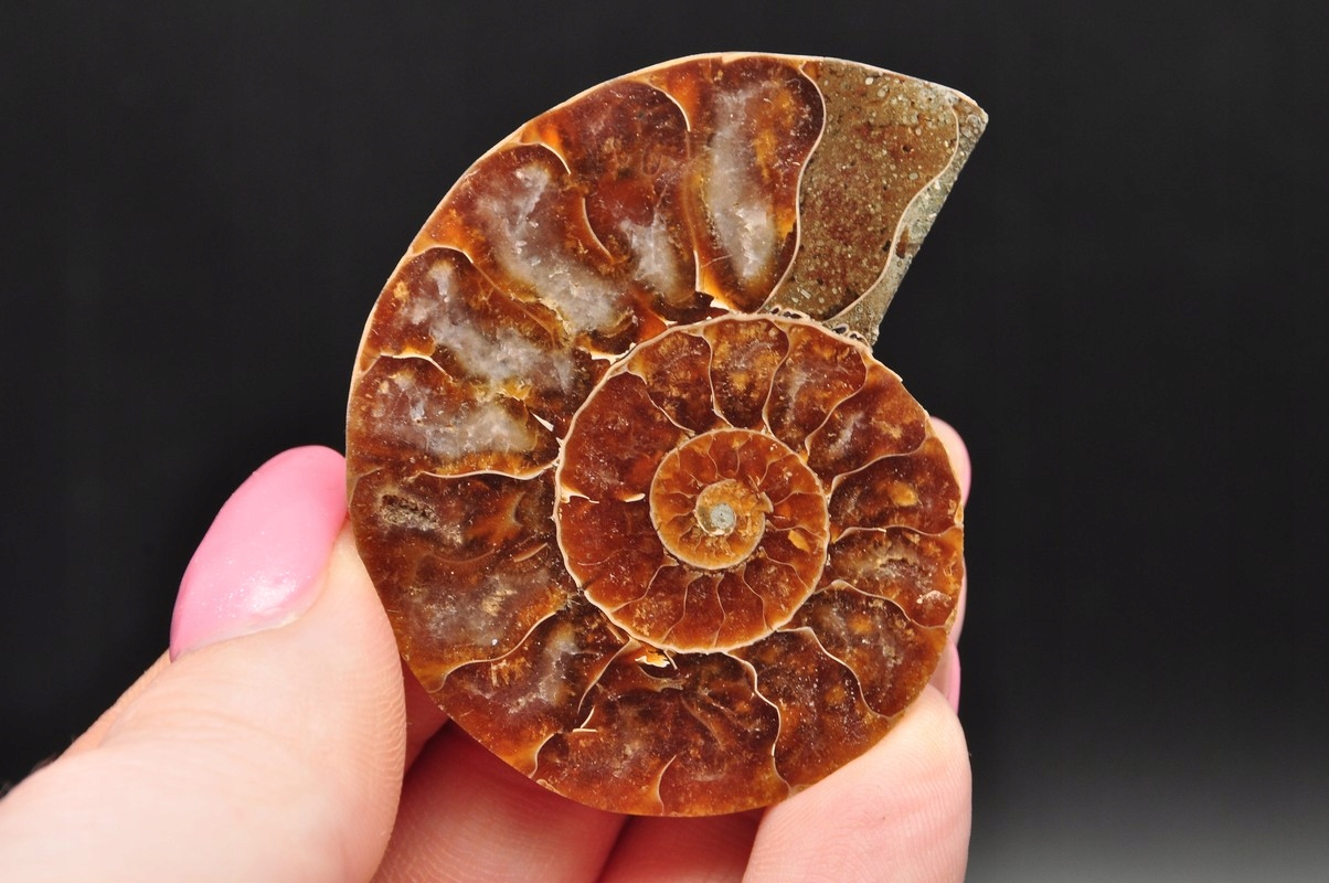 ПОЛОВИНА АМОНІТУ, ПРАЙДОВО ЗБЕРЕЖЕНИЙ ЗРАЗОК. СКАМЛІНОСТІ З МАДАГАСКАРУ, ДАТУВАНІ ПЕРІОДОМ НИЖНЬОГО КРАСЕТАГО. АМОНІТ МАЄ КАМЕРИ, ЯКІ ЗАПОВНЕНІ КАЛЬЦИТОМ, ДЕЯКІ З НИХ УТВОРИЛИ КАЛЬЦИТОВІ ЖЕОДИ. ЗРАЗОК ВИРІЗАНО ТА ВІДПОЛІРОВАНО.