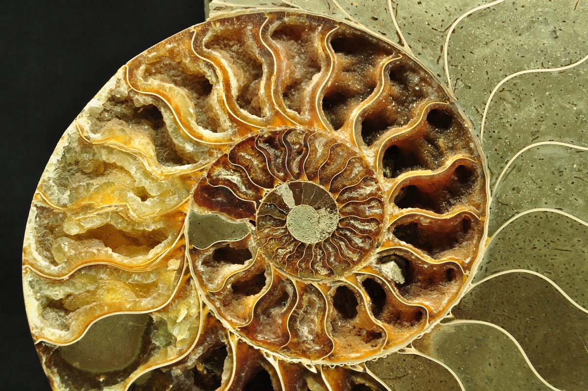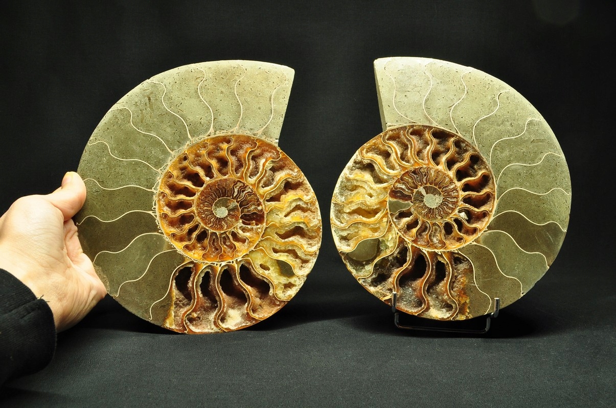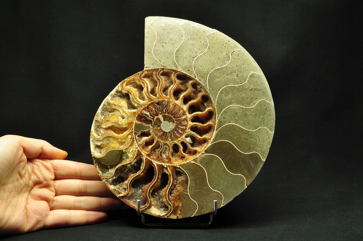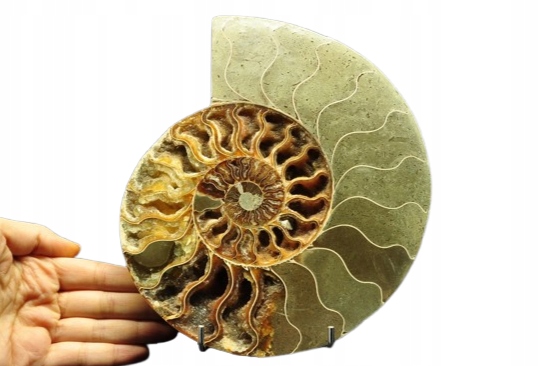 Амоніти, амоніти (Ammonoidea) - підклас вимерлих головоногих молюсків (Cephalopoda), зазвичай із симетричною, плоскоспіральною раковиною. Кілька типів мали незвичайні форми, напр. пряма оболонка, вертикально закручена спіраль або спіраль з не дотичними витками. Вони зустрічаються в гірських породах морського походження, що датуються девонським періодом до кінця крейдяного періоду. Деякі з окремих камер відкриті та заповнені багатим набором сіро-бежевих і коричневих кристалів кальциту з перегородками між камерами.