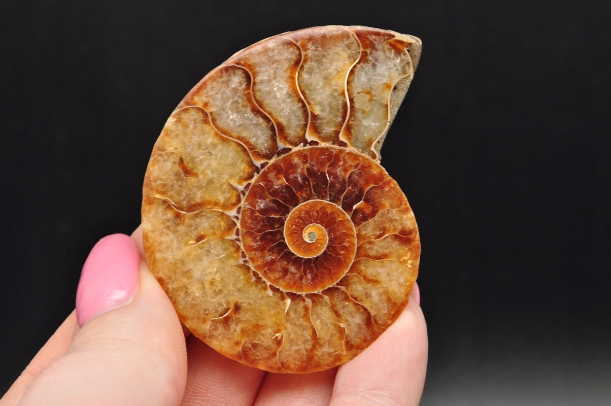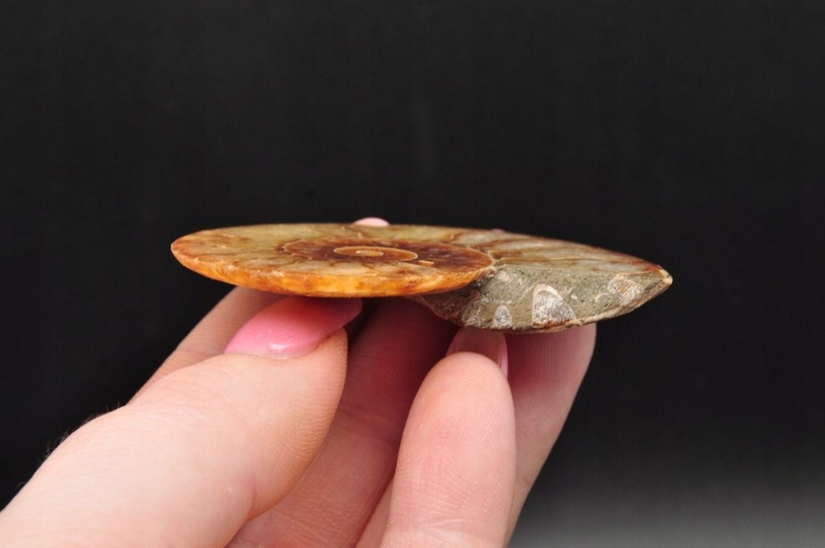 ПОЛОВИНА АМОНІТУ, ПРАЙДОВО ЗБЕРЕЖЕНИЙ ЗРАЗОК. СКАМЛІНОСТІ З МАДАГАСКАРУ, ДАТУВАНІ ПЕРІОДОМ НИЖНЬОГО КРАСЕТАГО. АМОНІТ МАЄ КАМЕРИ, ЯКІ ЗАПОВНЕНІ КАЛЬЦИТОМ, ДЕЯКІ З НИХ УТВОРИЛИ КАЛЬЦИТОВІ ЖЕОДИ. ВИРІЗАНИЙ ТА ВІДПОЛІРОВАНИЙ ЗРАЗОК.