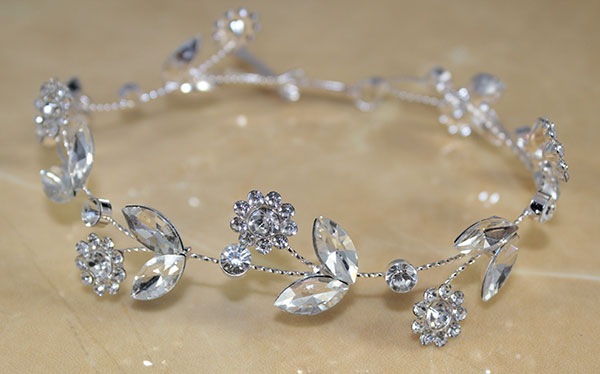 красива тіара - прикраса для шпильки. На металевому закрученому дроті прикріплені листя кристалів і квітів, підірвані більшими кристалічними цирконами.