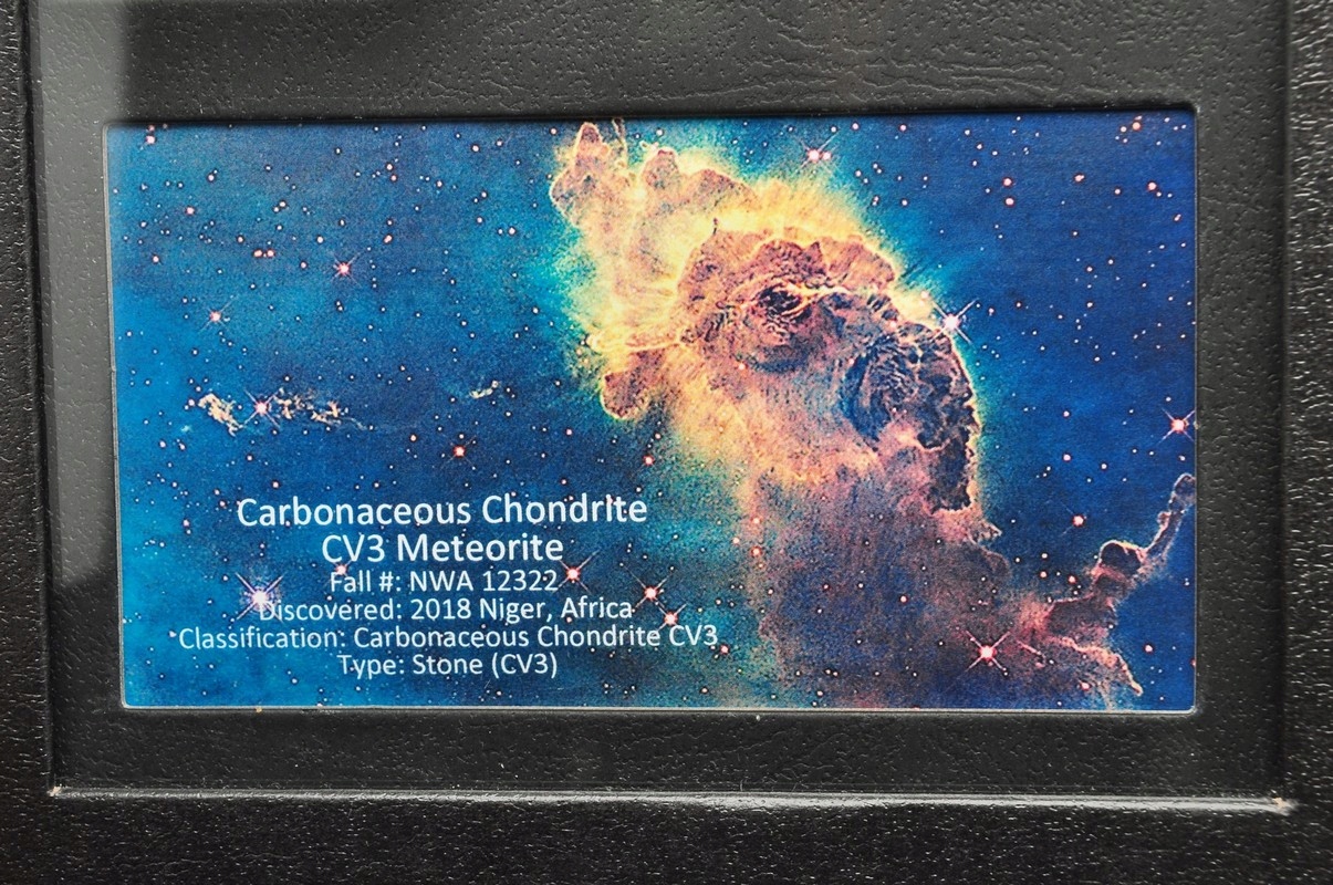 АВТЕНТИЧНИЙ МЕТЕОРИТ NWA 12322 - ВУГІЛЕВИЙ ХОНДРИТ CV - 3. ІДЕАЛЬНИЙ ЗРАЗОК ДЛЯ КОЛЕКЦІЇ АБО НА ПОДАРУНОК. ПРОДАЄТЬСЯ В ЗАКРИТОЙ КОРОБЦІ ТА В ЕЛЕГАНТНІЙ ДЕКОРАТИВНІЙ РАМКІ.