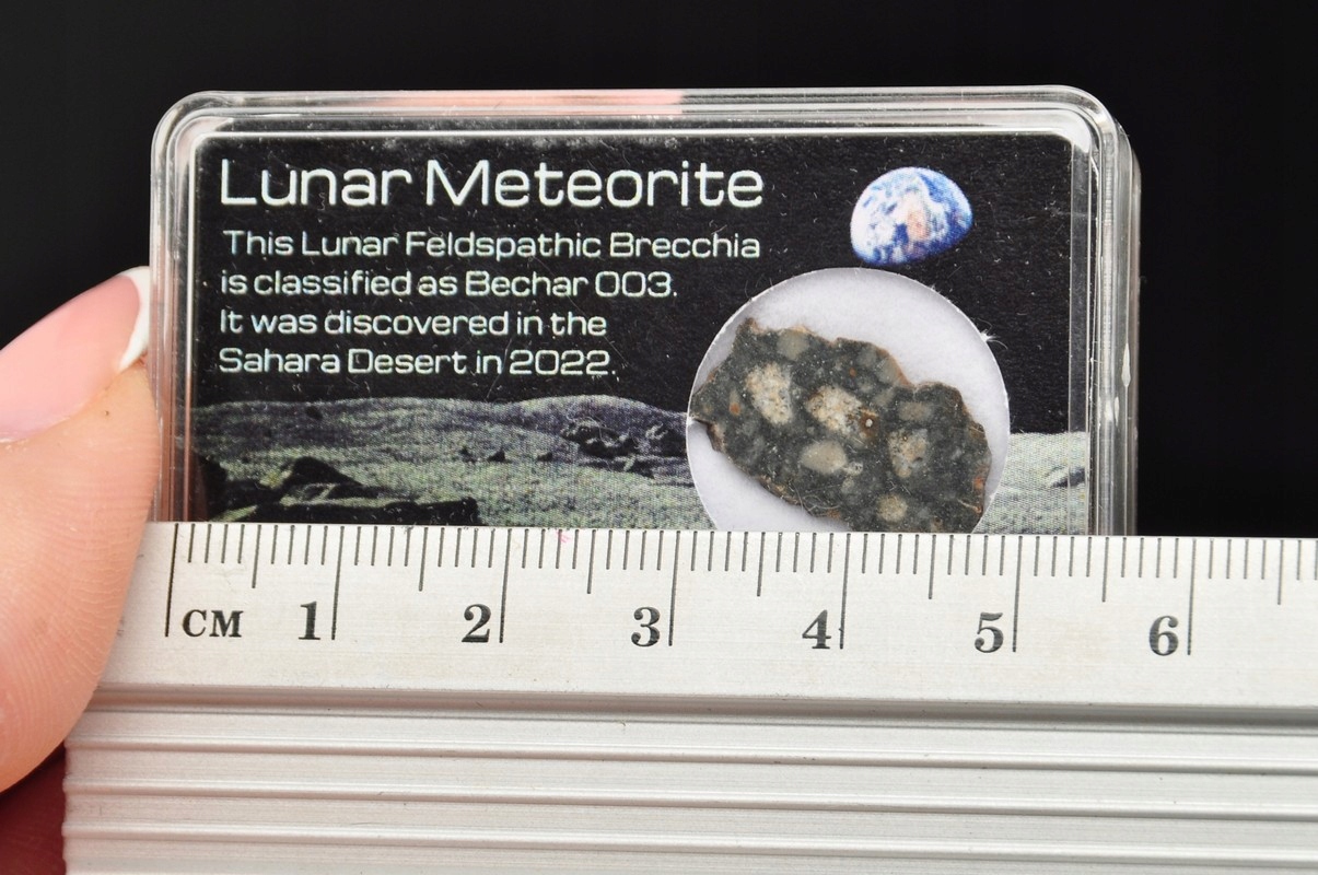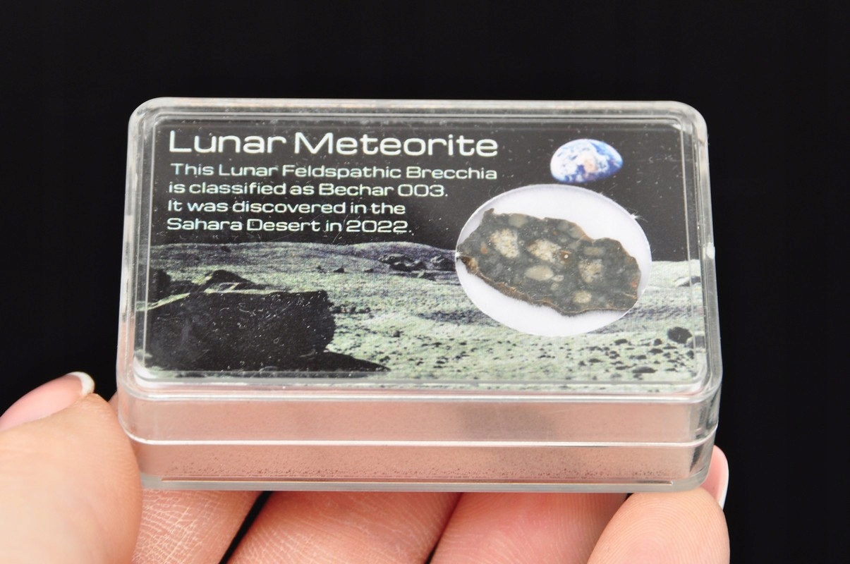 Місячний метеорит Bechar 003 – зразок походить безпосередньо з нашого природного супутника – Місяця. Класифікується як місячна польовошпатова брекчія. Bechar 003 був виявлений у пустелі Сахара в 2022 році, в одному з найвіддаленіших і негостинних регіонів на планеті. Однак його подорож почалася набагато раніше - це камінь, який був викинутий з поверхні Місяця сильним ударом метеорита, вилетів у космос і приземлився на Землю після мільйонів років у космічній порожнечі. Польовошпатові брекчії належать до найбільш репрезентативних типів місячних метеоритів. Вони складаються з фрагментів верхньої кори Місяця, що складається в основному з анортиту, з’єднаних у тонку матрицю надзвичайними енергетичними ударами. Місячні метеорити, такі як Bechar 003, надзвичайно рідкісні, на них припадає менше 0,5% усіх відомих метеоритів.