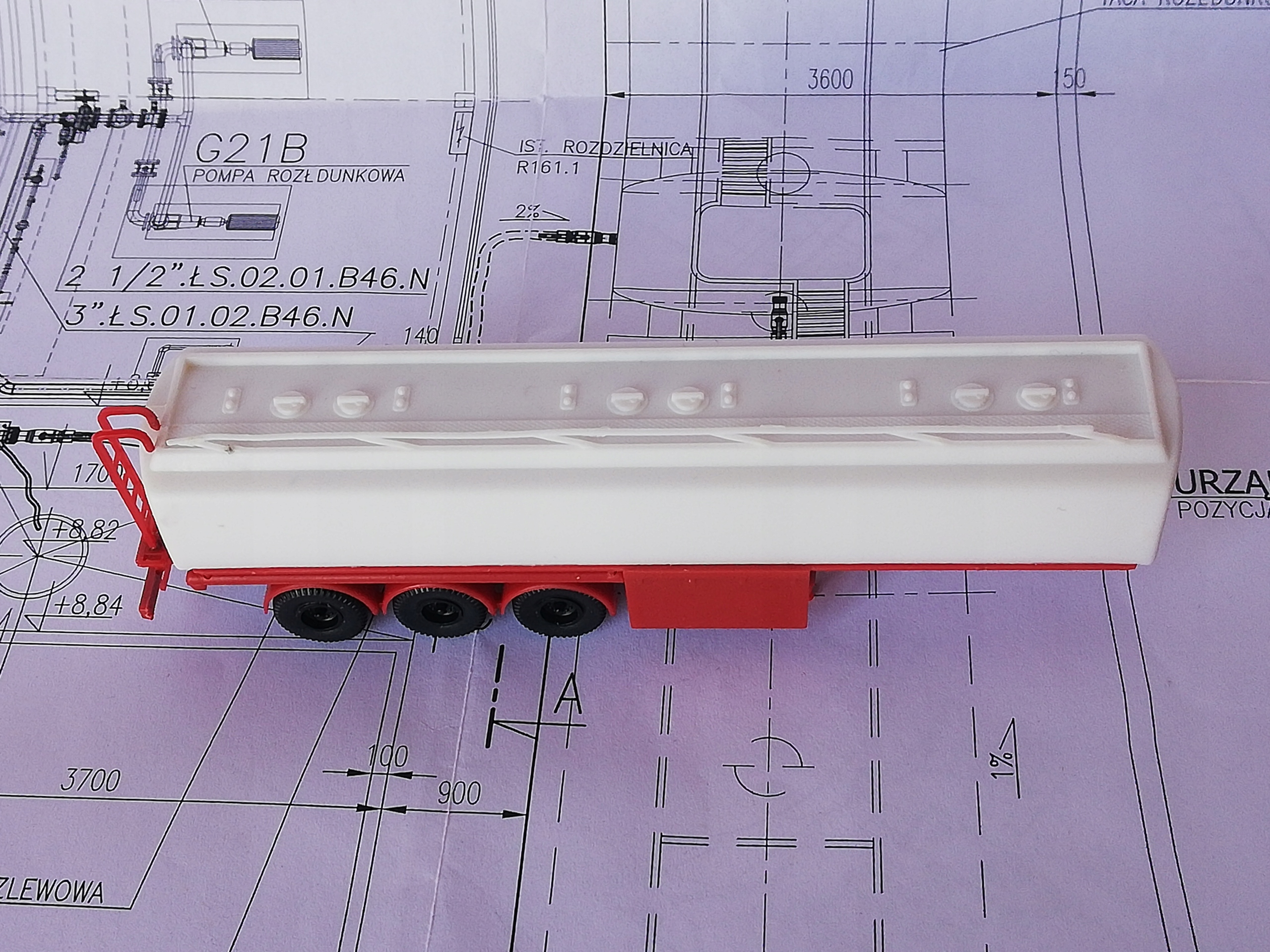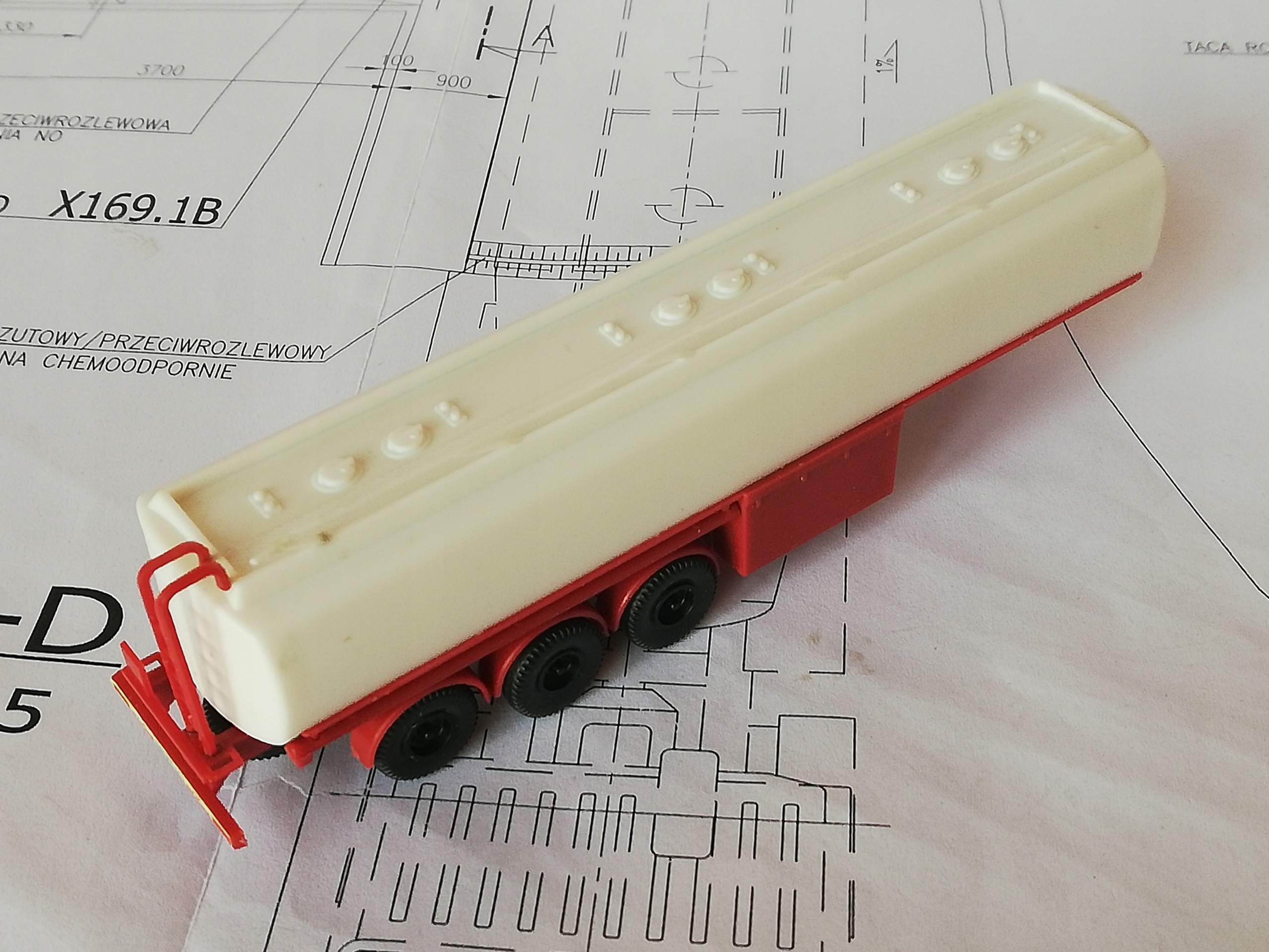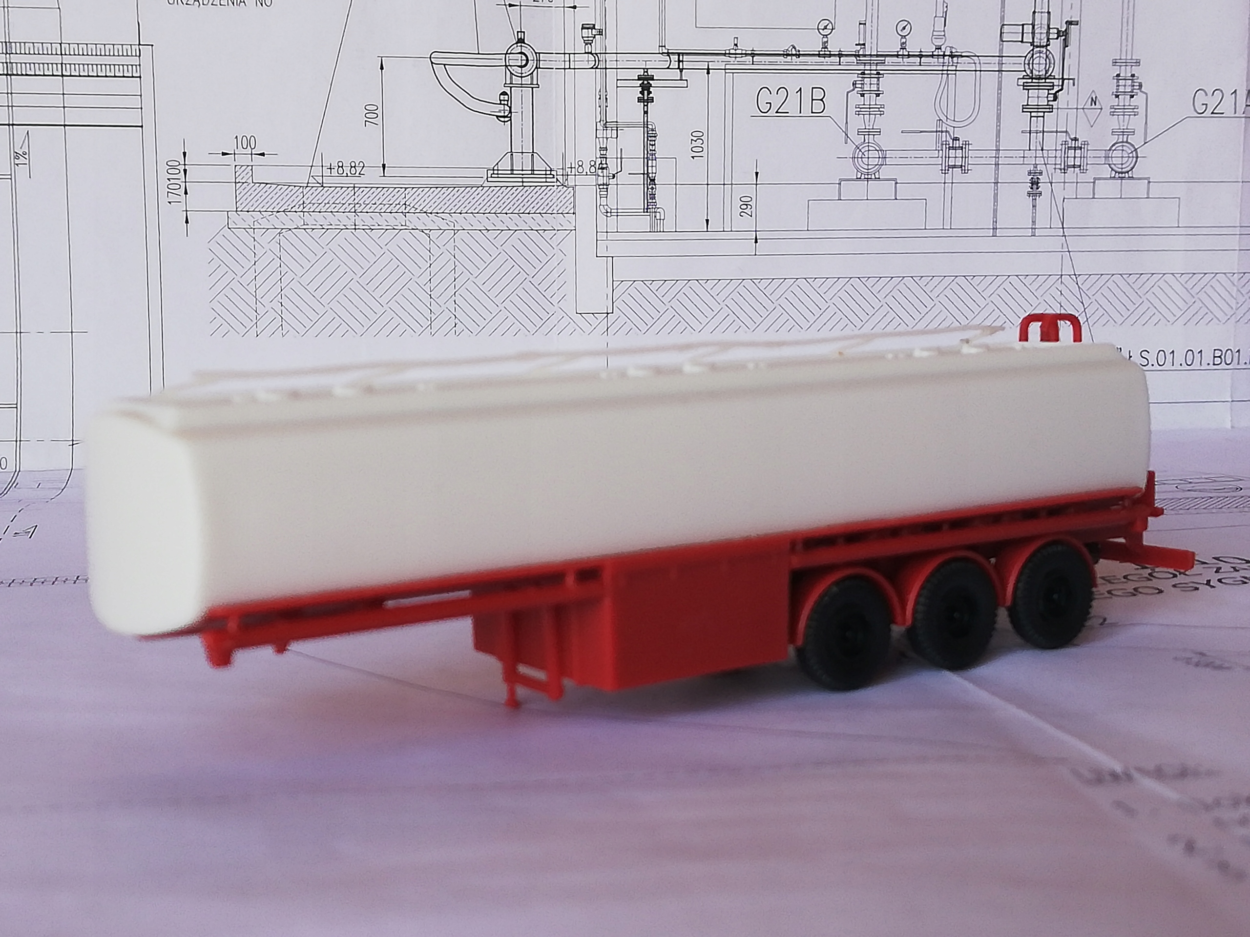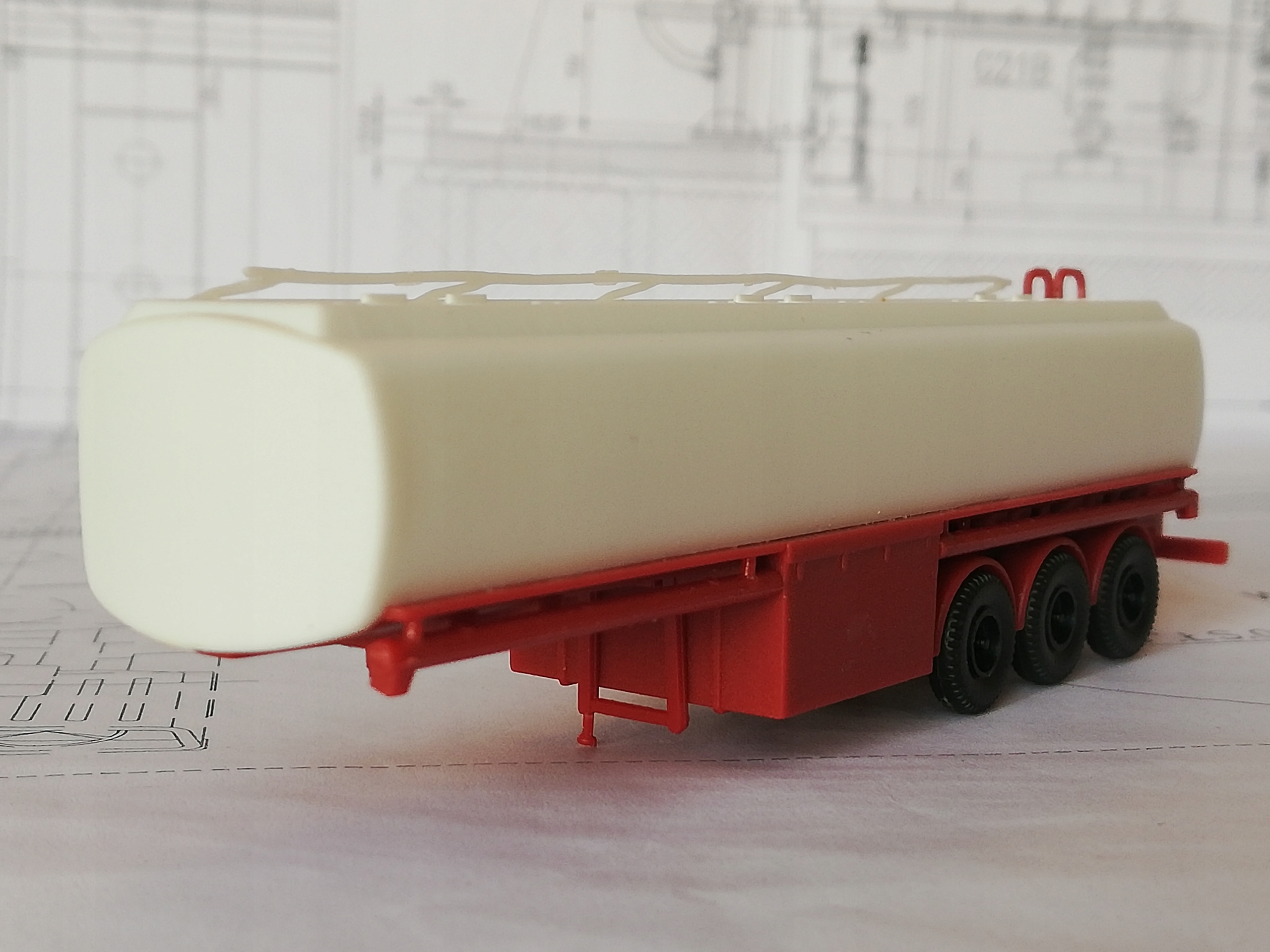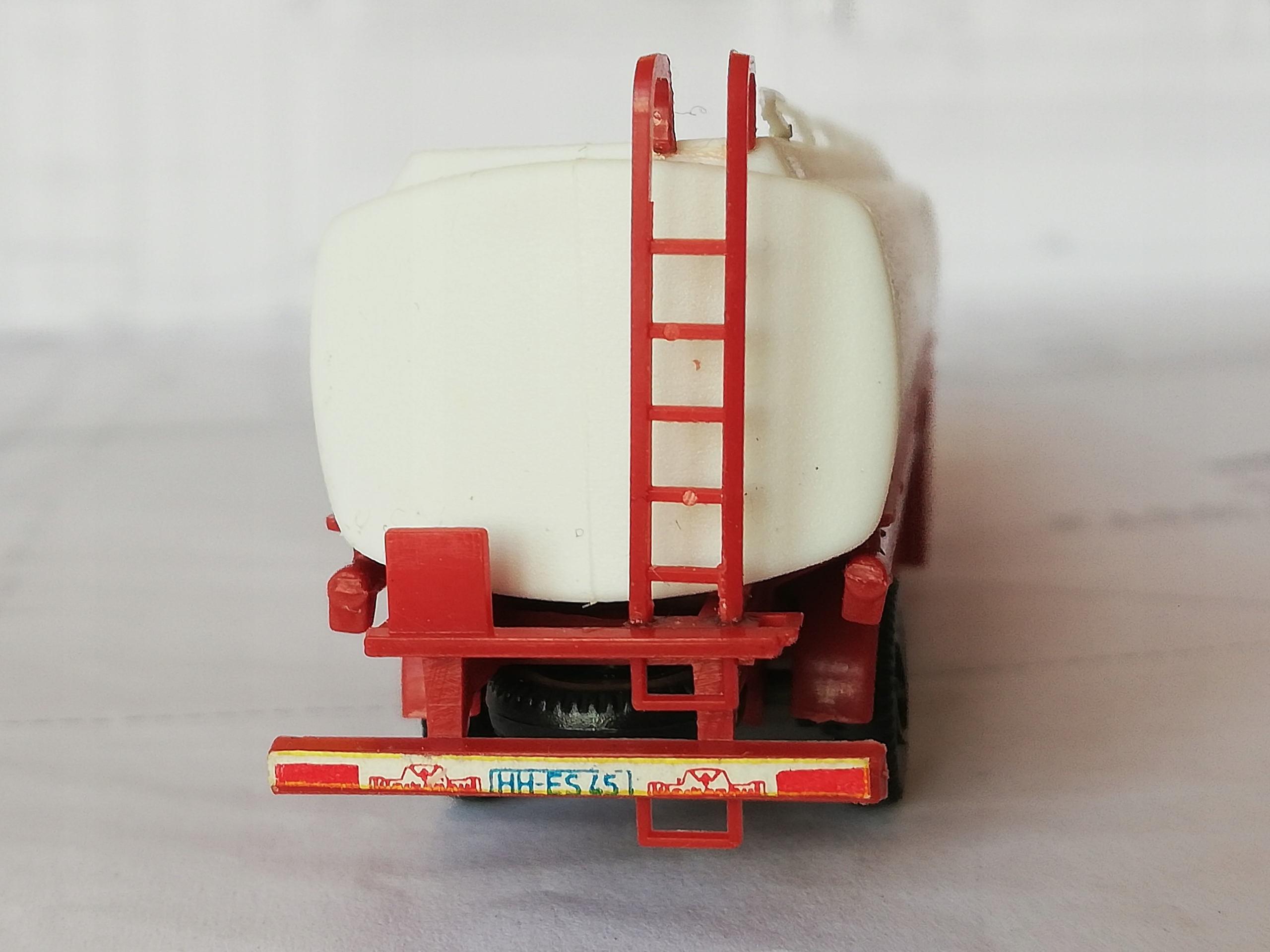 ....нейтральний танкер, масштаб H0 (1:87). Модель Kibri. Клеєна модель, гарний стан. У кількох місцях є невеликі сліди клею. Зламана одна опорна ніжка, відсутній один елемент (імітація труби) під шасі. Упаковка для безпечного транспортування