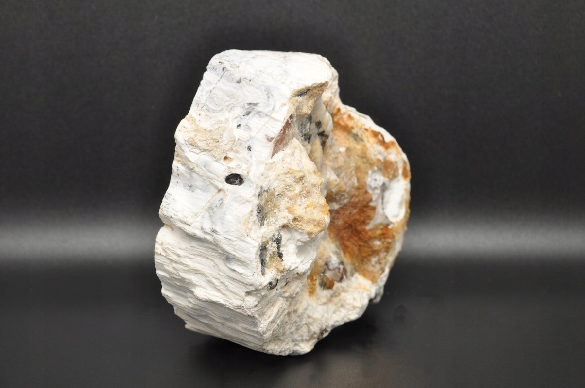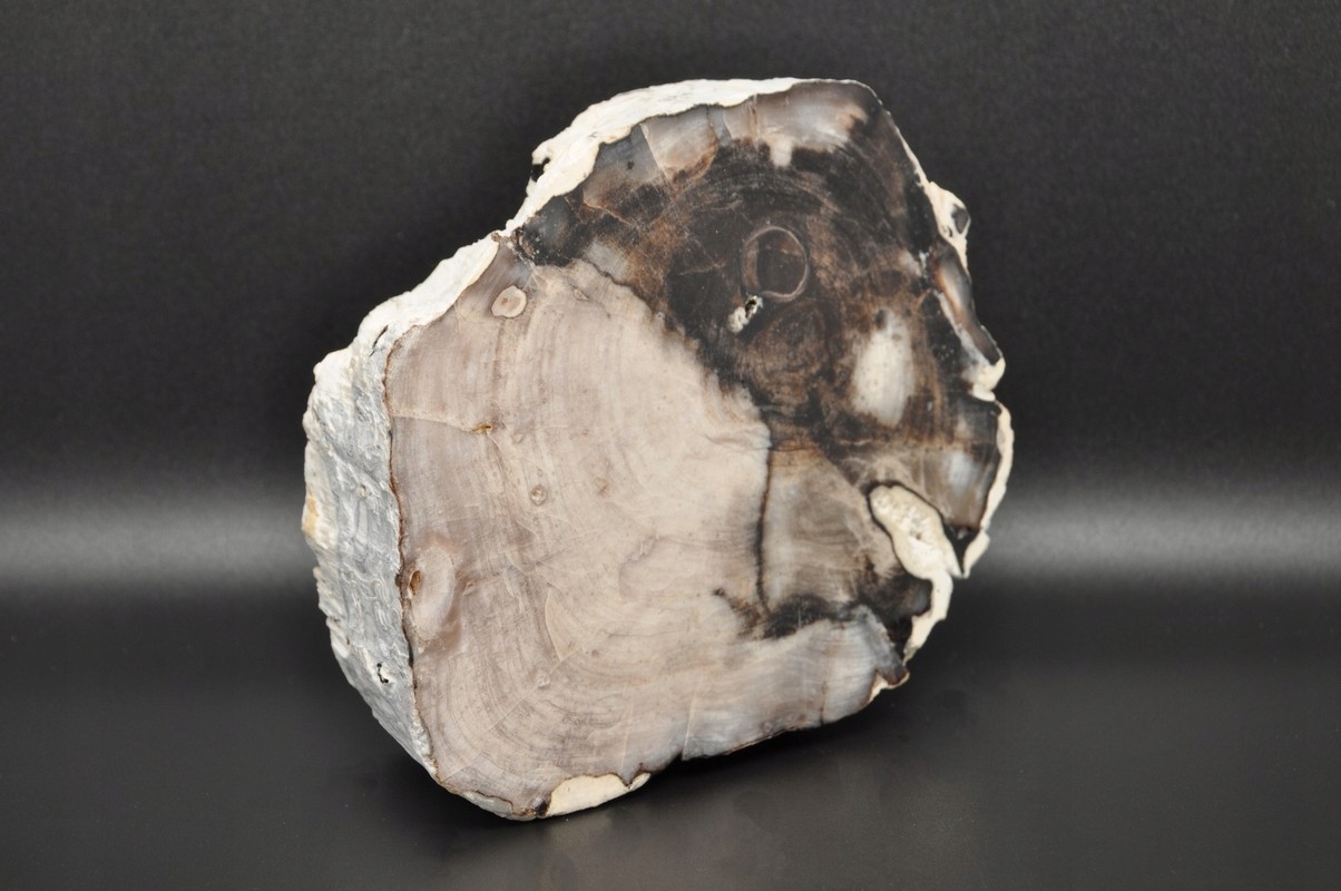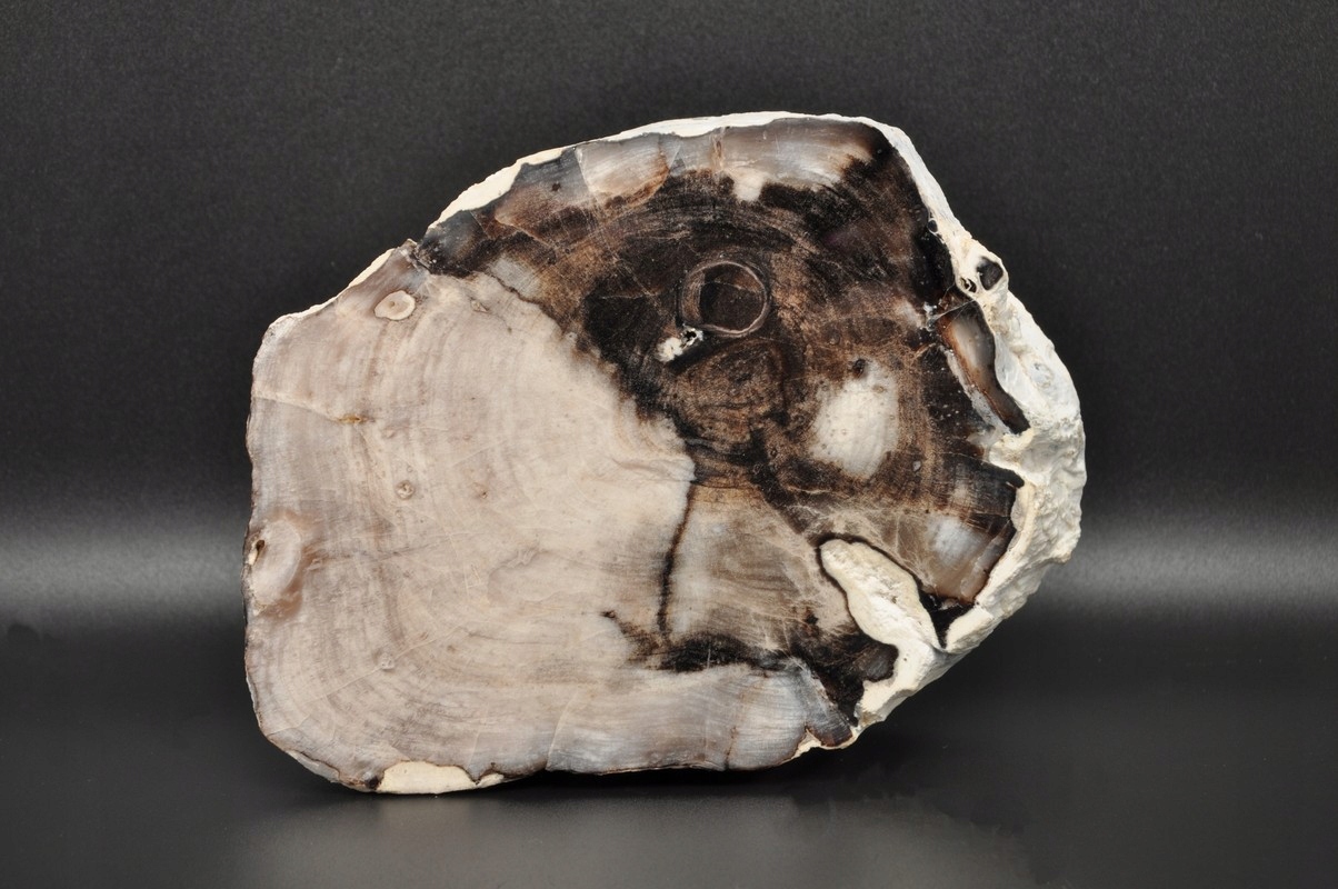 Пень із скам'янілого дерева полірований з одного боку. Дуже естетичний і експонований екземпляр. Вік дерева приблизно 180-200 мільйонів років, рубіж тріасу і юри. Скам'яніла деревина - це скам'янілі залишки деревини минулих геологічних періодів. Вони були збережені шляхом закопування деревини в осад, а потім заміни вихідної органічної речовини кремнеземом (халцедон або опал) із розчинів, що циркулювали в осаді. У цьому процесі часто зберігаються всі деталі деревини та її структура.