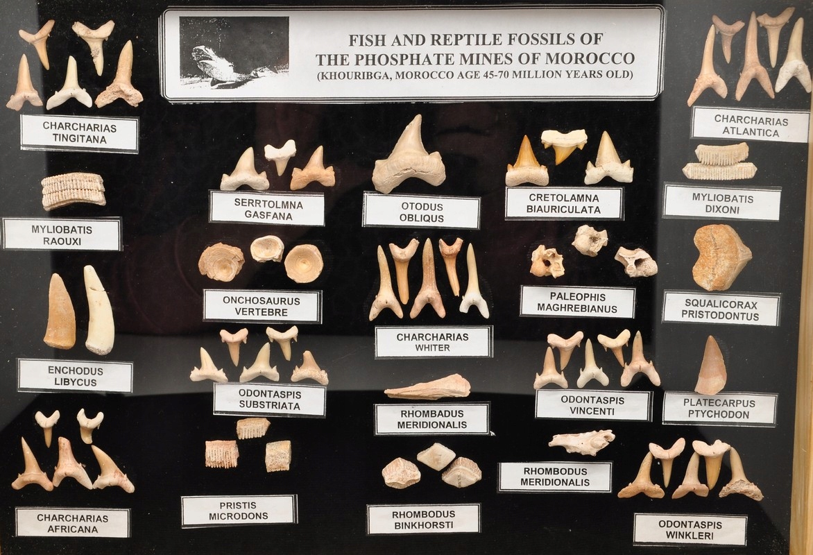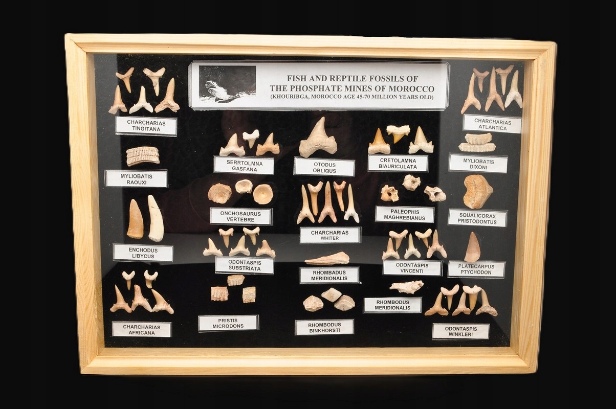 Натуральні Рибні копалини - зуби, хребці. Зразки від 45 - 70 мільйонів років від шахти Марокко, у прекрасному, глазурованому вітрині. : Khouribga, Marocco