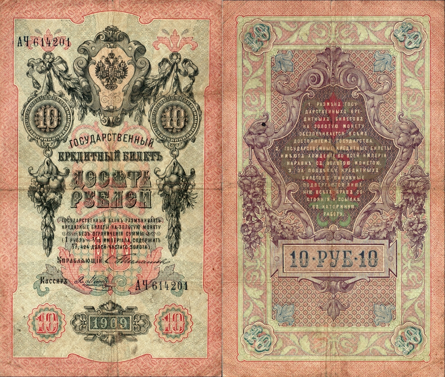 # ROSJA - 10 RUBLI - 1909 - P-11a - F - Timashev (najrzadszy podpis!)