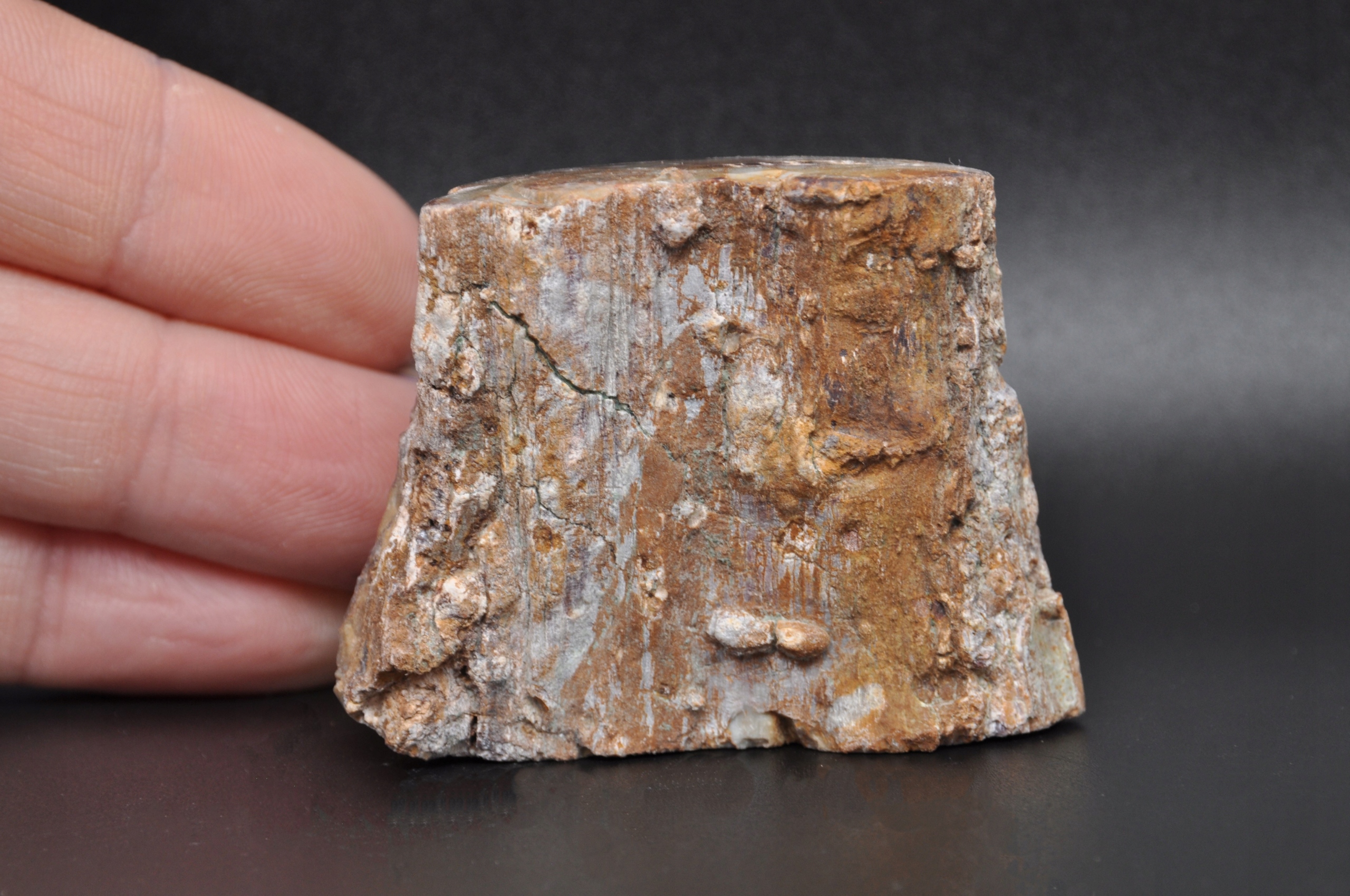 Пень із скам'янілого дерева полірований з одного боку. Дуже естетичний і експонований екземпляр. Вік дерева приблизно 180-200 мільйонів років, рубіж тріасу і юри. Скам'яніла деревина - це скам'янілі залишки деревини минулих геологічних періодів. Вони були збережені шляхом закопування деревини в осад, а потім заміни вихідної органічної речовини кремнеземом (халцедон або опал) із розчинів, що циркулювали в осаді. У цьому процесі часто зберігаються всі деталі деревини та її структура.